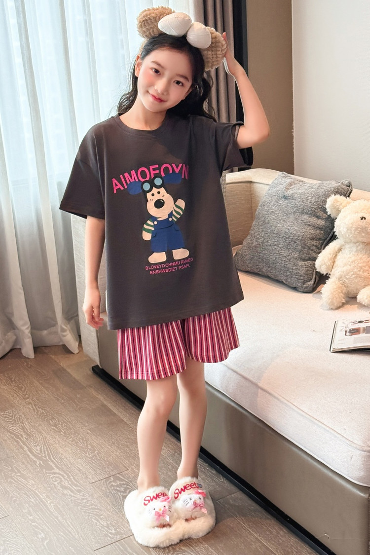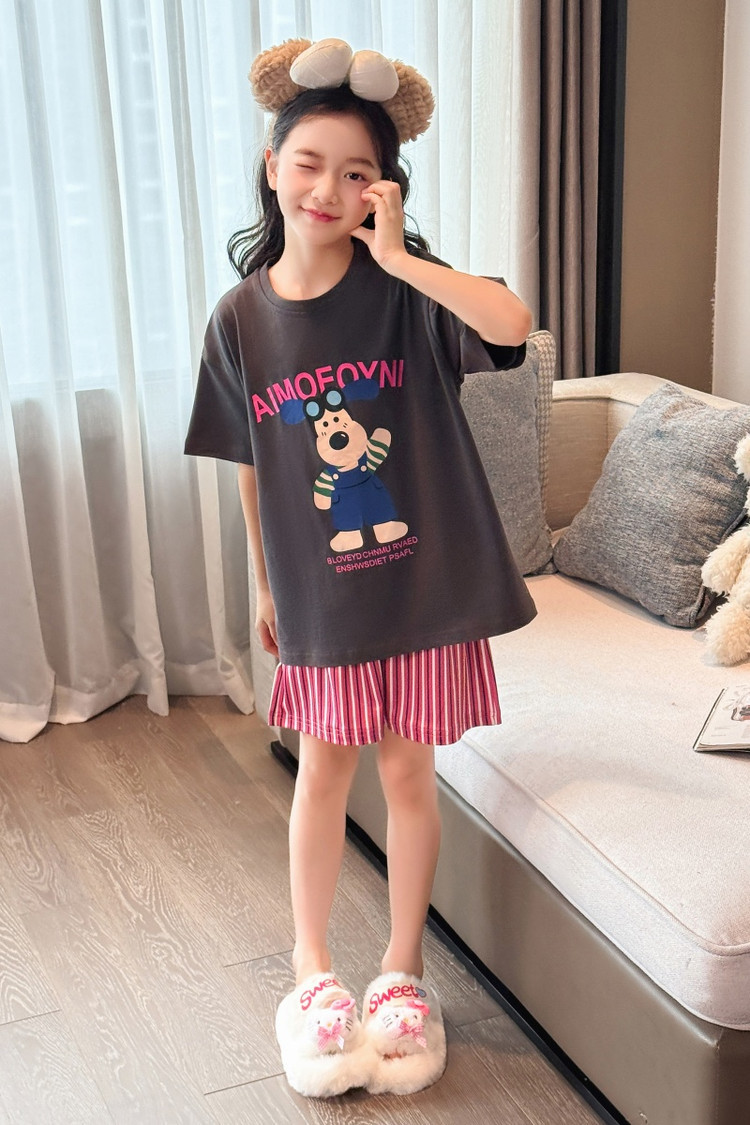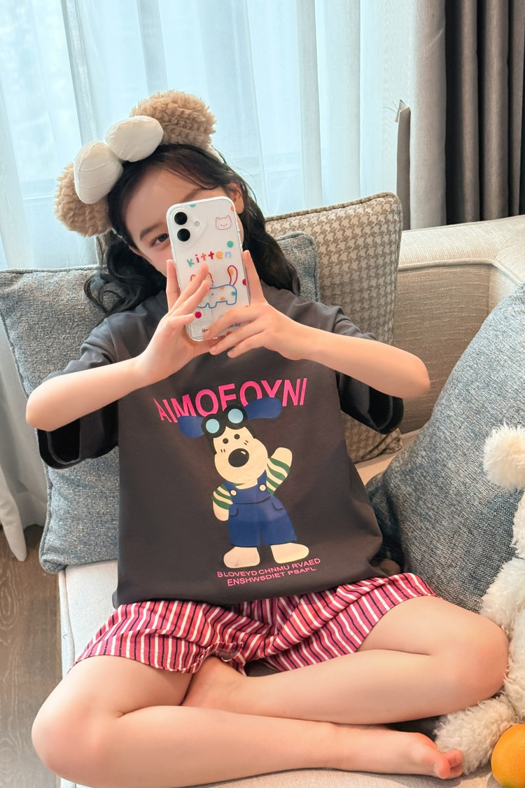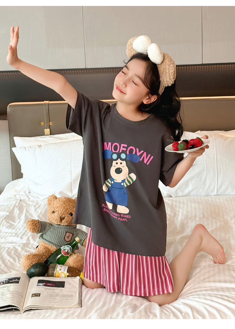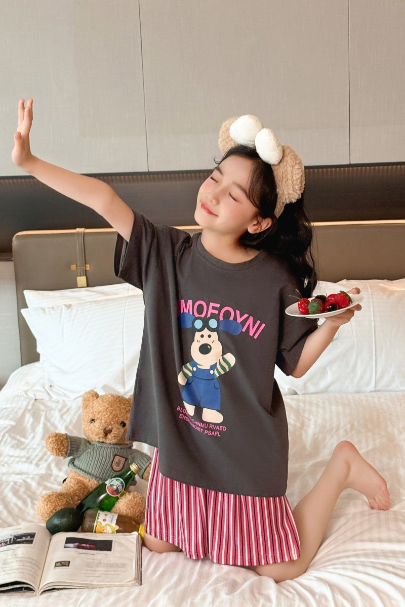 도매 어린이 가정 의류 여름 소녀 반팔 만화 잠옷 잠옷 캐주얼 느슨한 소녀 겉옷 투피스 세트