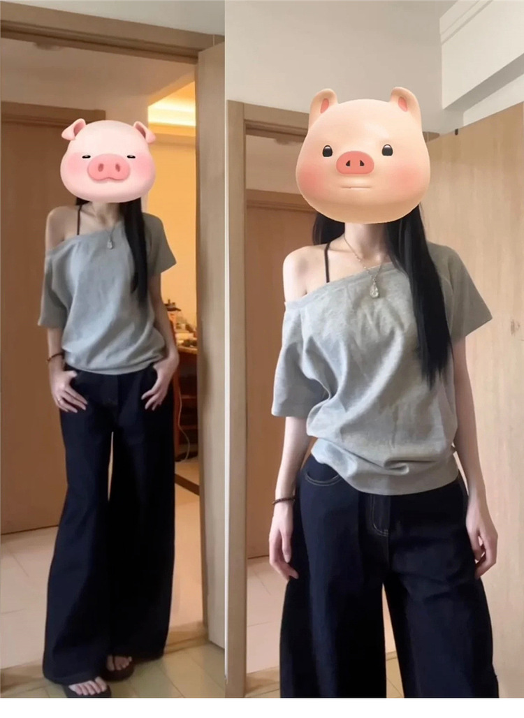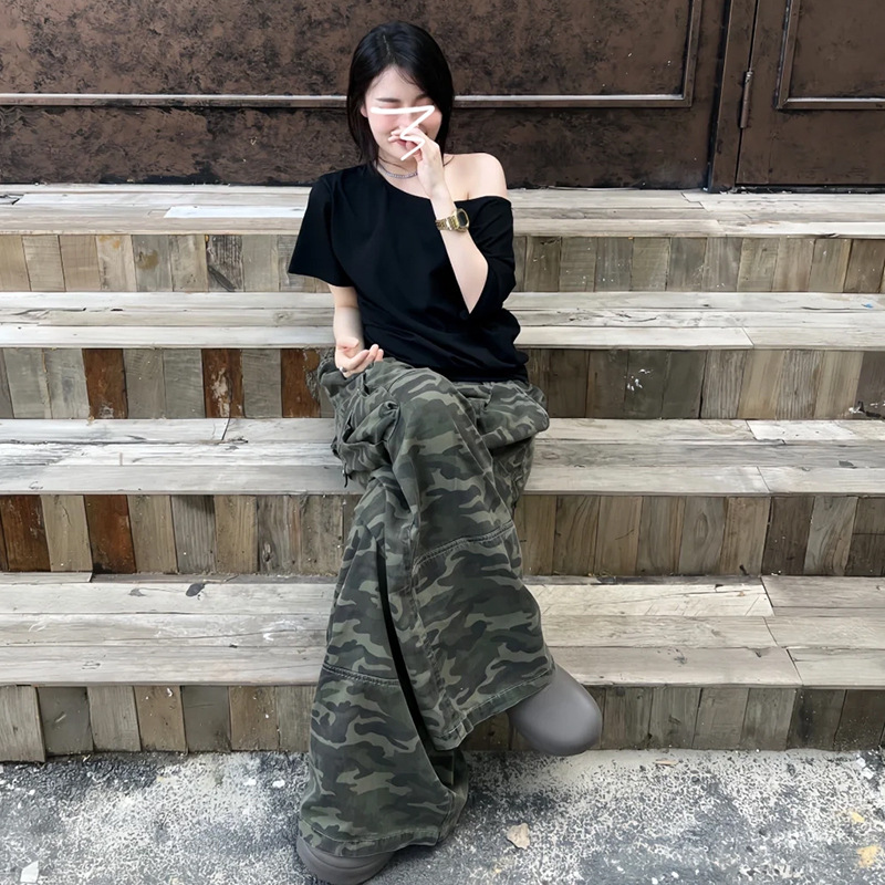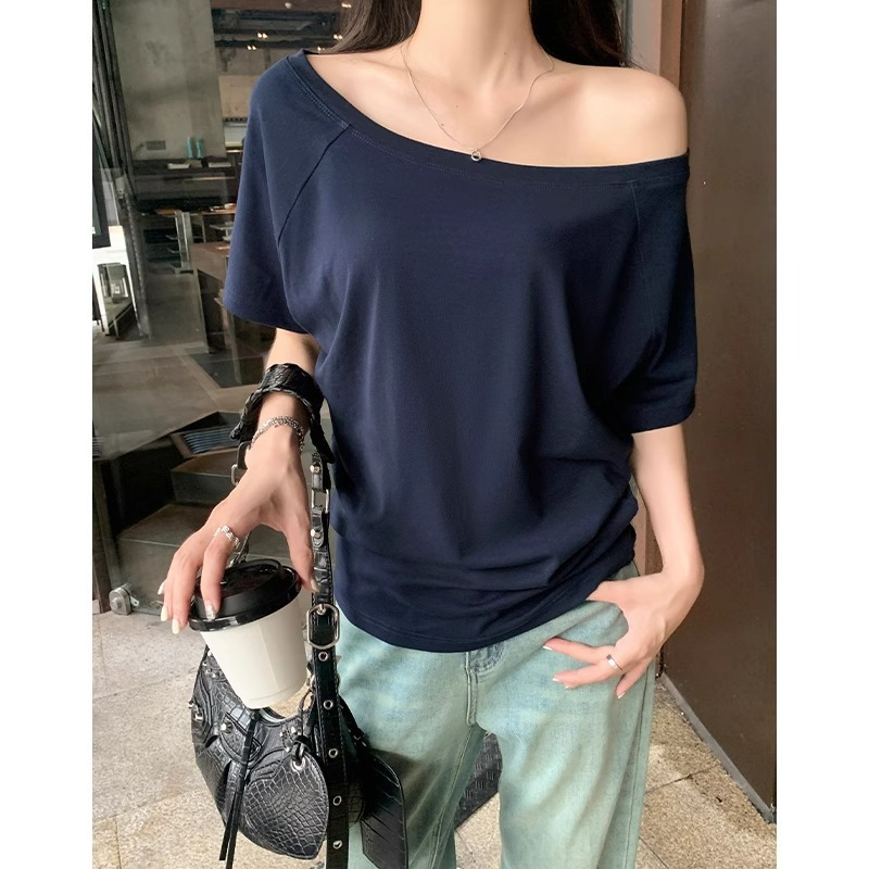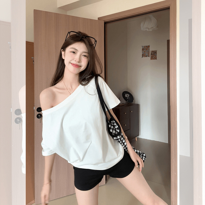 여름 여성을 위한 한국식 레이지 스타일 사선 넥 오프 숄더 반팔 티셔츠 새로운 루즈 슬리밍 캐주얼 다용도 시크 탑스토어 가기