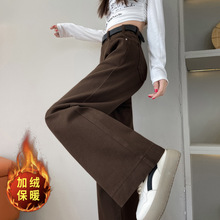 美拉德棕咖色阔腿牛仔裤女秋冬加绒复古高腰宽松直筒垂感拖地长裤