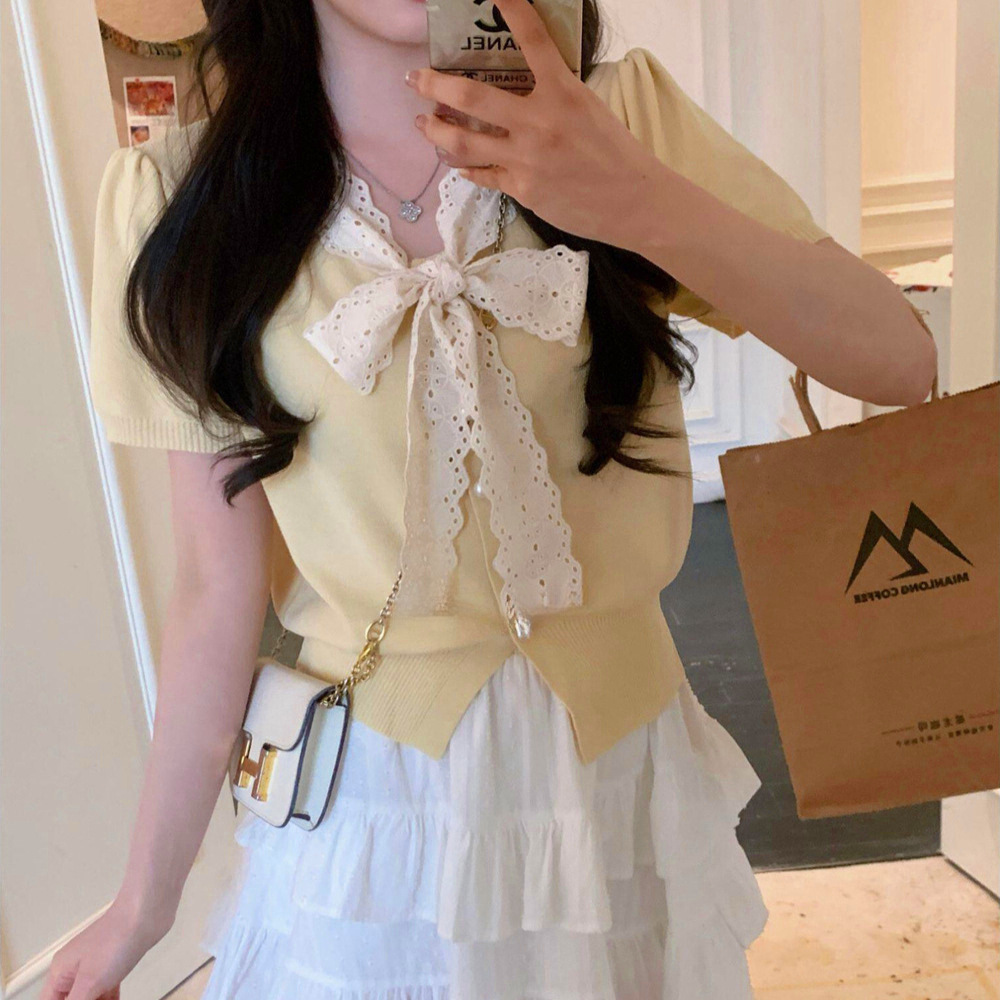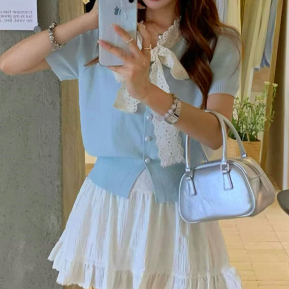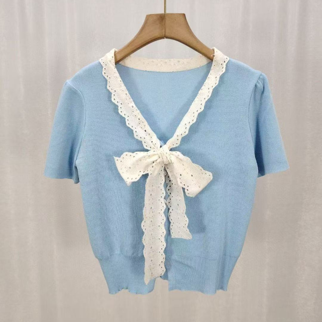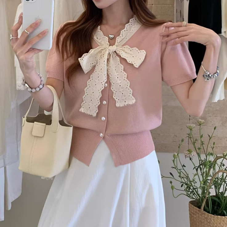 한국 스타일의 달콤한 레이스 반팔 니트 가디건 여성용 2026 여름 리본 끈 얇은 탑 셔츠스토어 가기