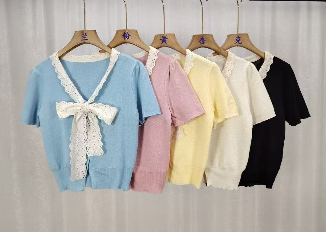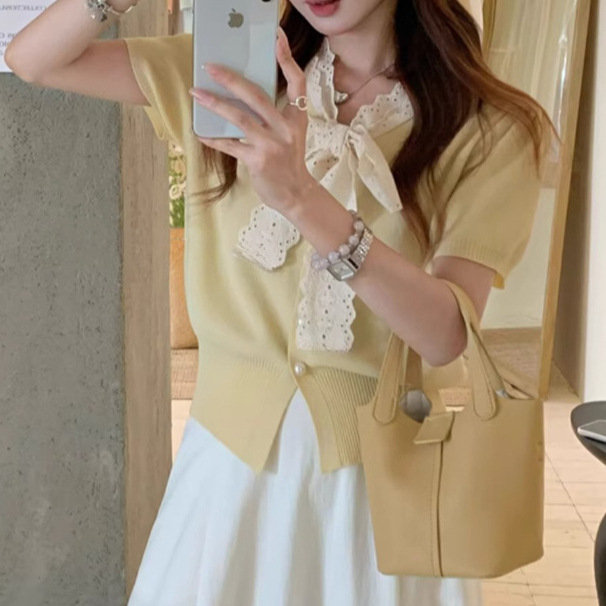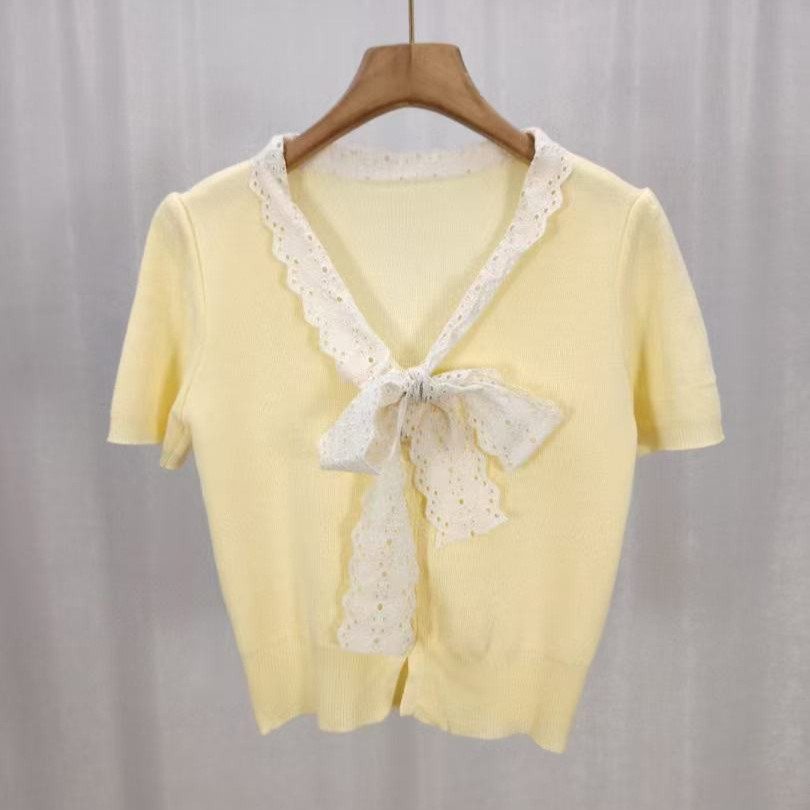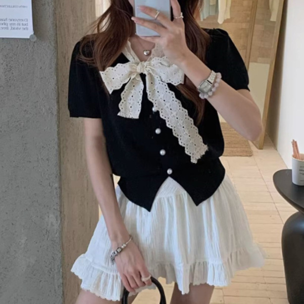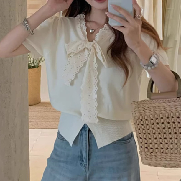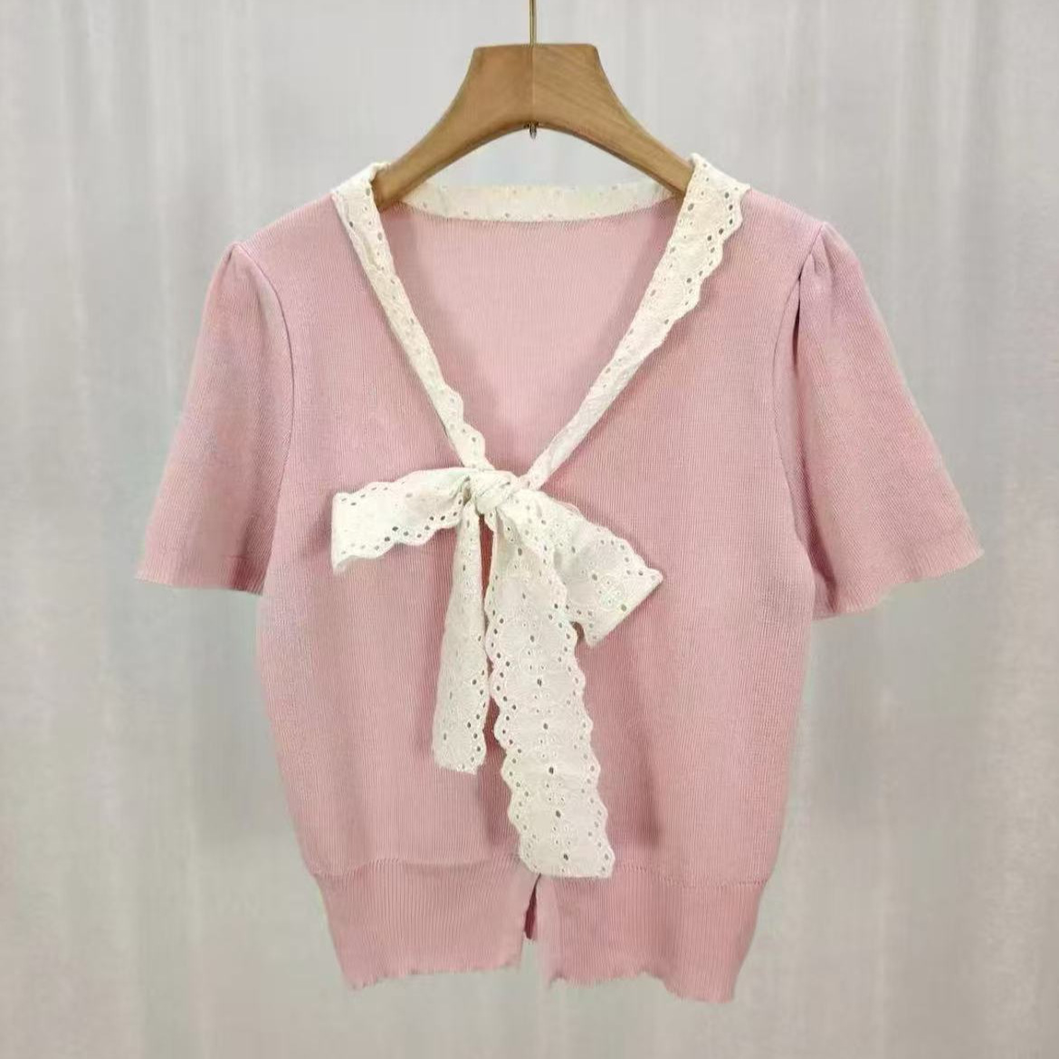 한국 스타일의 달콤한 레이스 반팔 니트 가디건 여성용 2026 여름 리본 끈 얇은 탑 셔츠스토어 가기