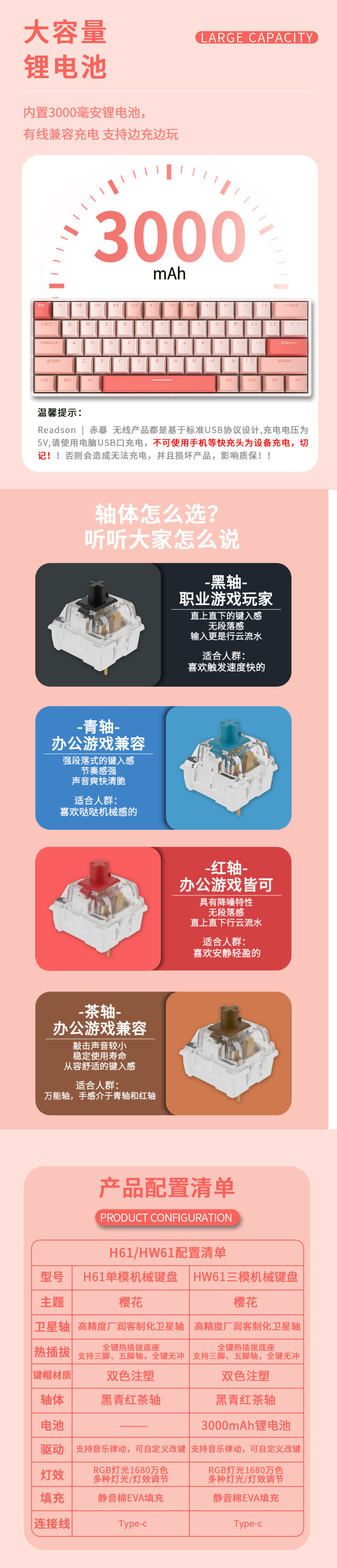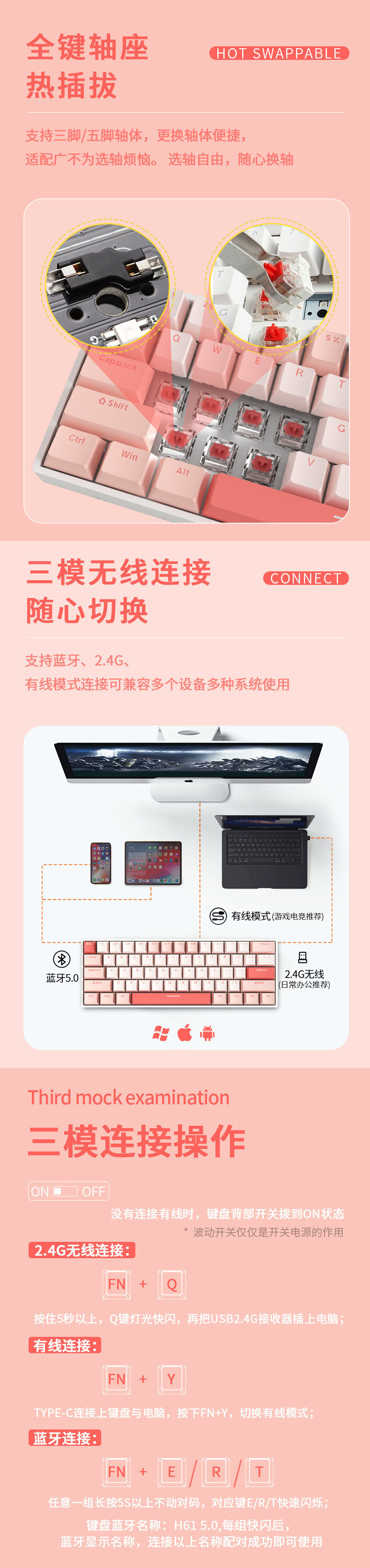 • 61키 백색광 버전 - 무선 3가지 모드 버전 - 빨간색 축 [풀 키 핫 스왑 가능]