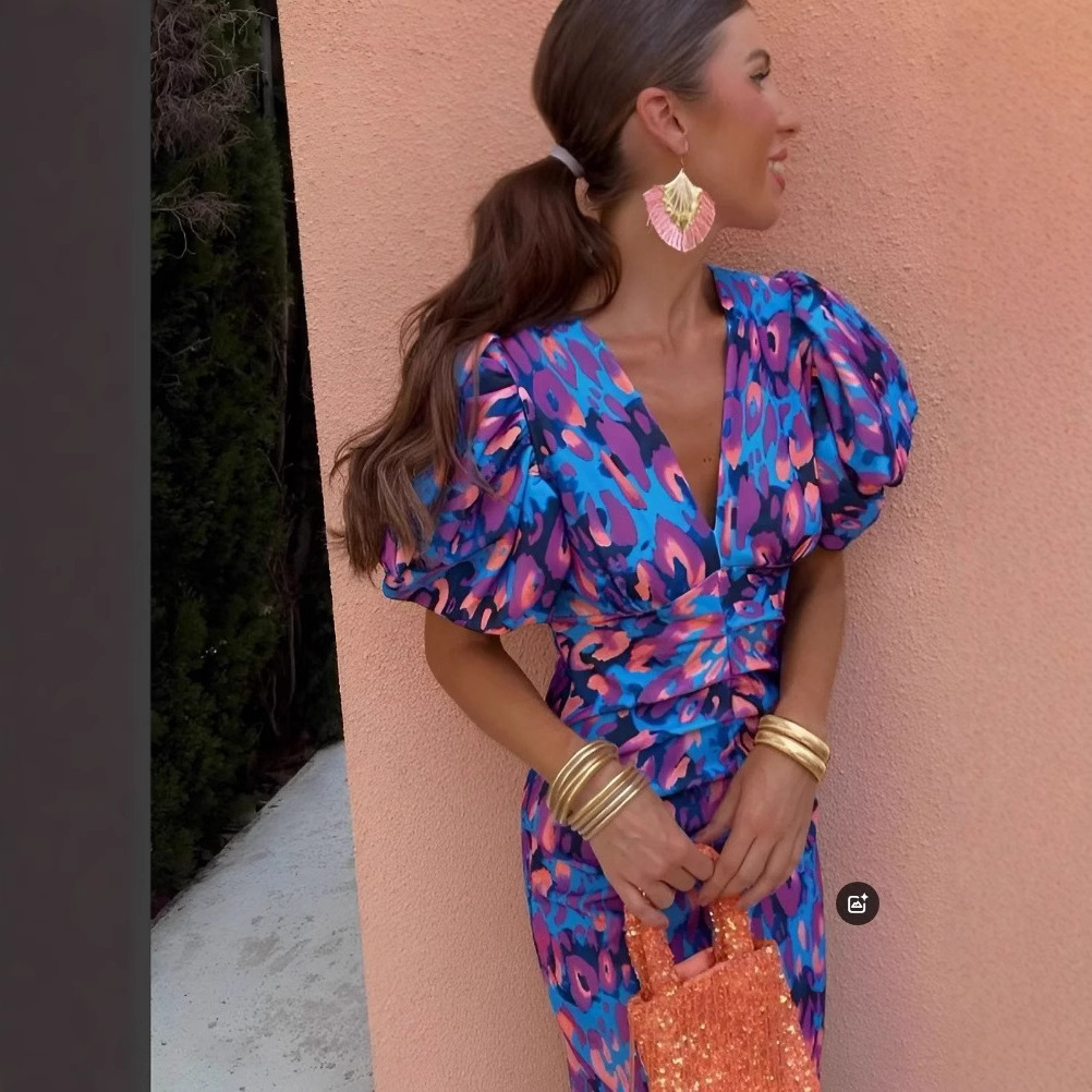 2025 새로운 크로스보더 유럽과 미국 아마존 프린트 V 넥 타이트 힙 커버 허리 버블 반팔 여성 드레스