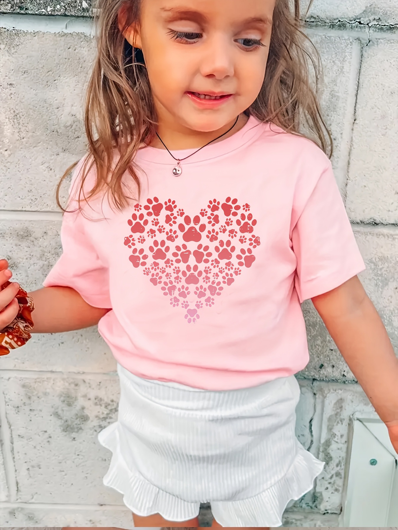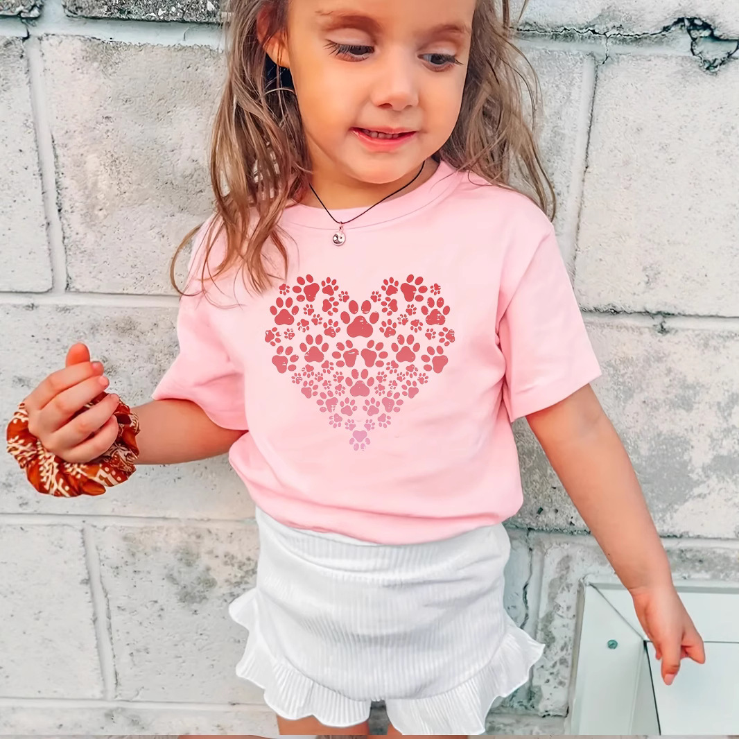국경 간 대외 무역 INS 소녀의 사랑 발자국 패턴 프린트 라운드 넥 반팔 티셔츠 캐주얼 여름 착용 1-8 세에 적합스토어 가기