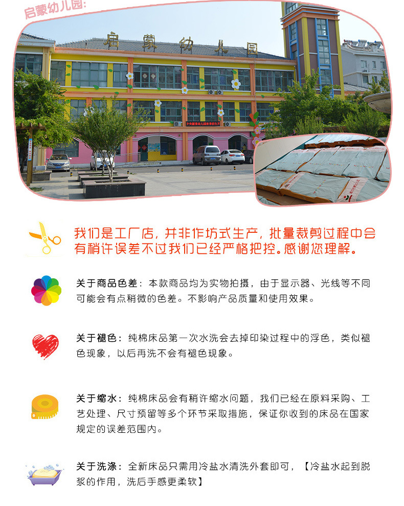 注意事项:在订购产品前请先确定学校床的大小,虽然幼儿园床基本都差不多, 但是还是有误差的,请测量床的内径实际尺寸,这样我们的报价才更精准!