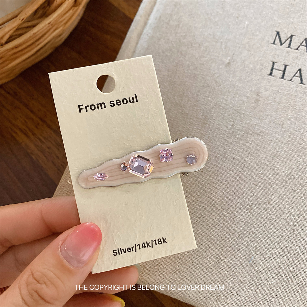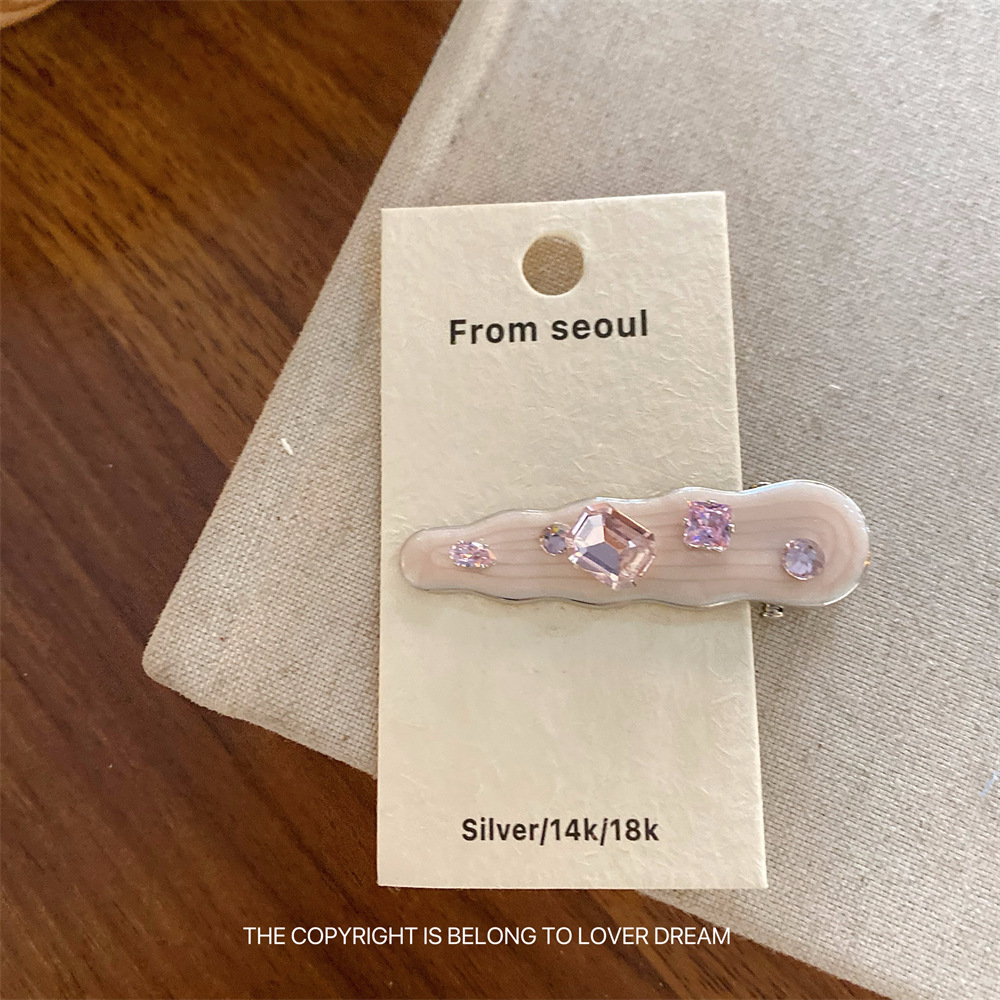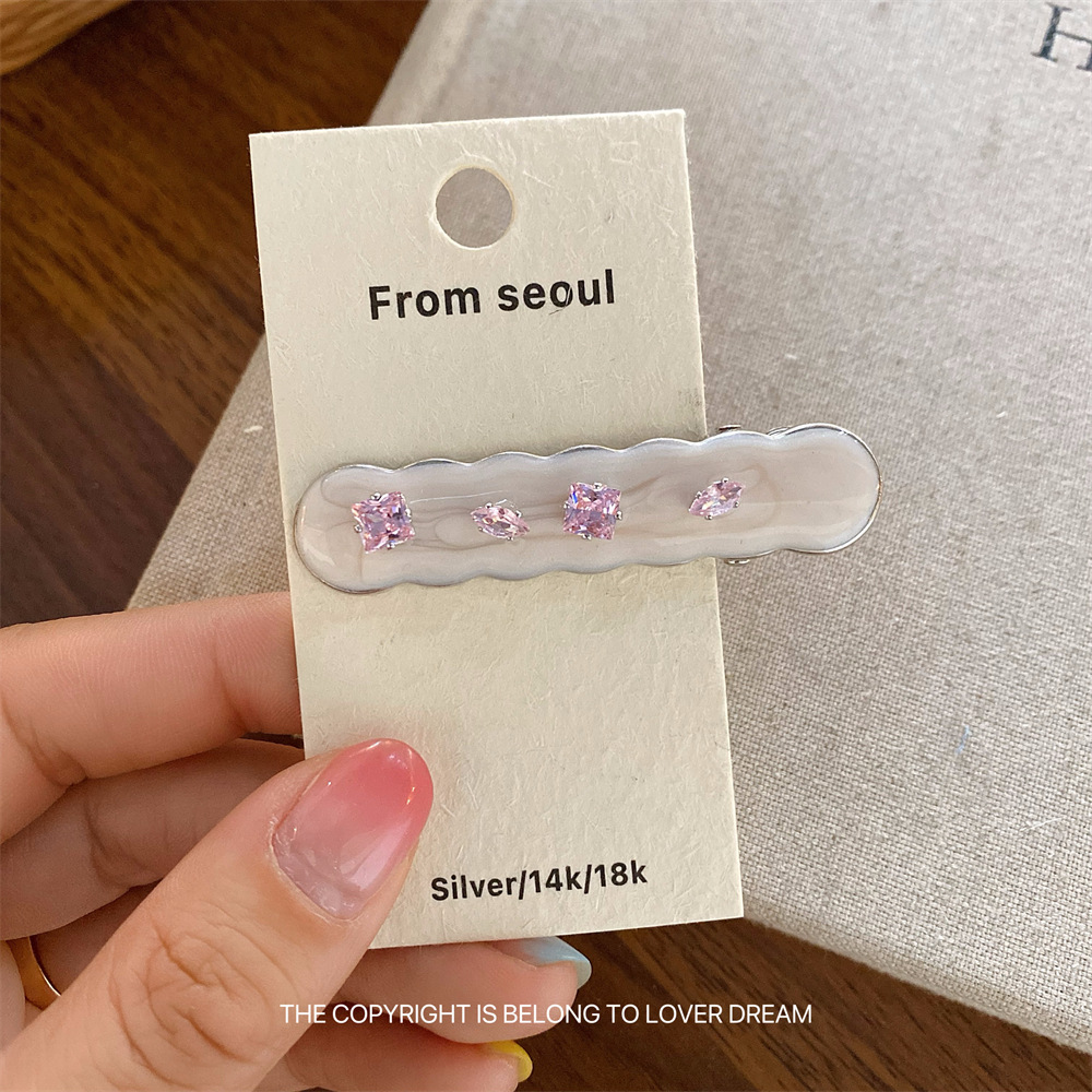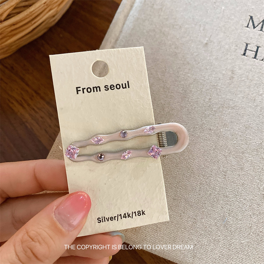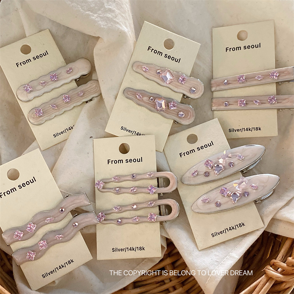 한국의 새로운 핑크 라인스톤 오일 드립 기하학 머리핀, 달콤하고 패셔너블한 앞머리 클립, 덕빌 클립, 헤어 액세서리스토어 가기