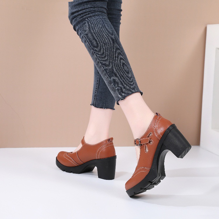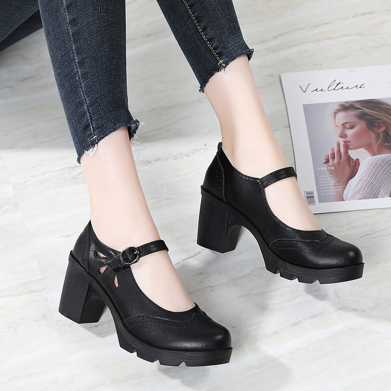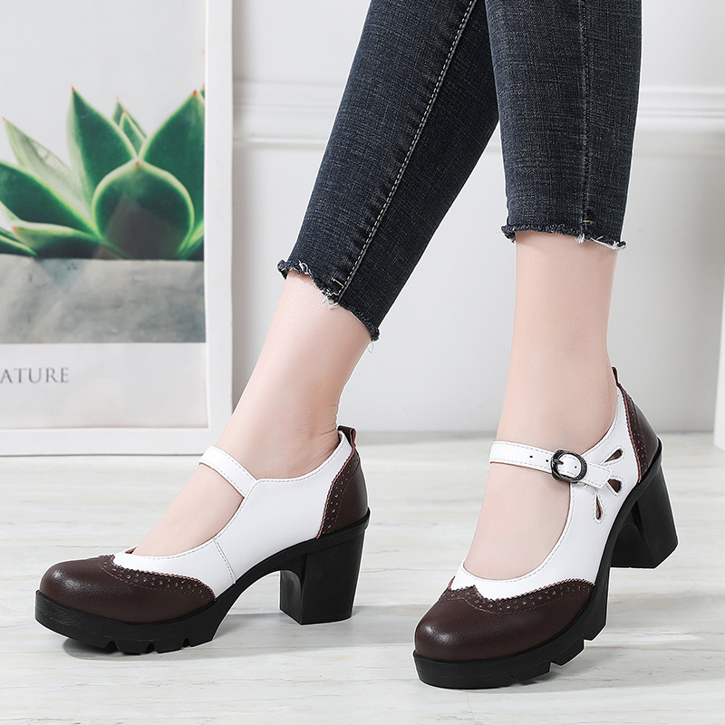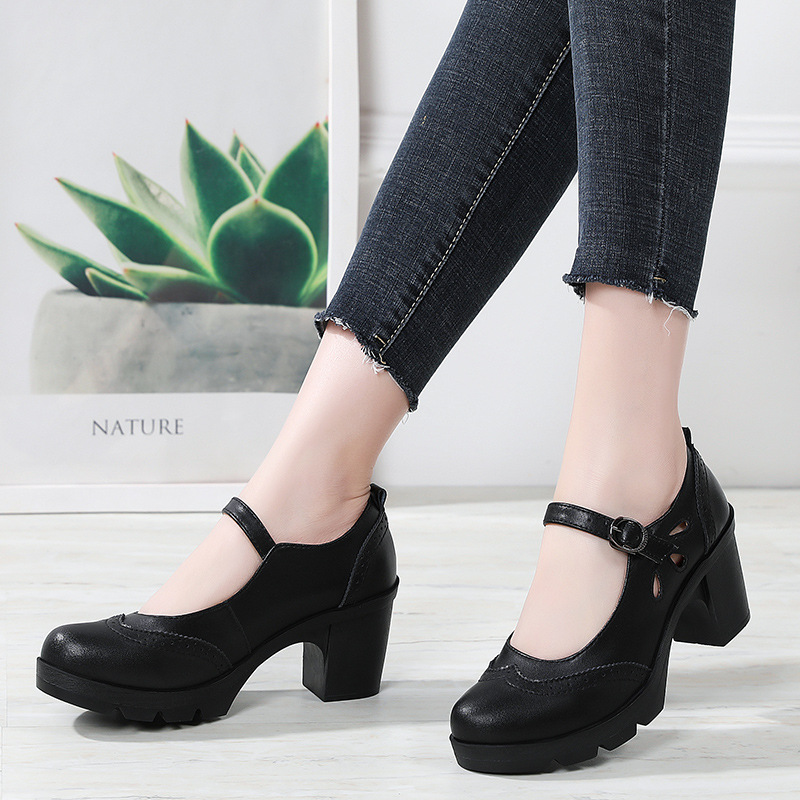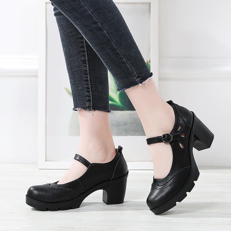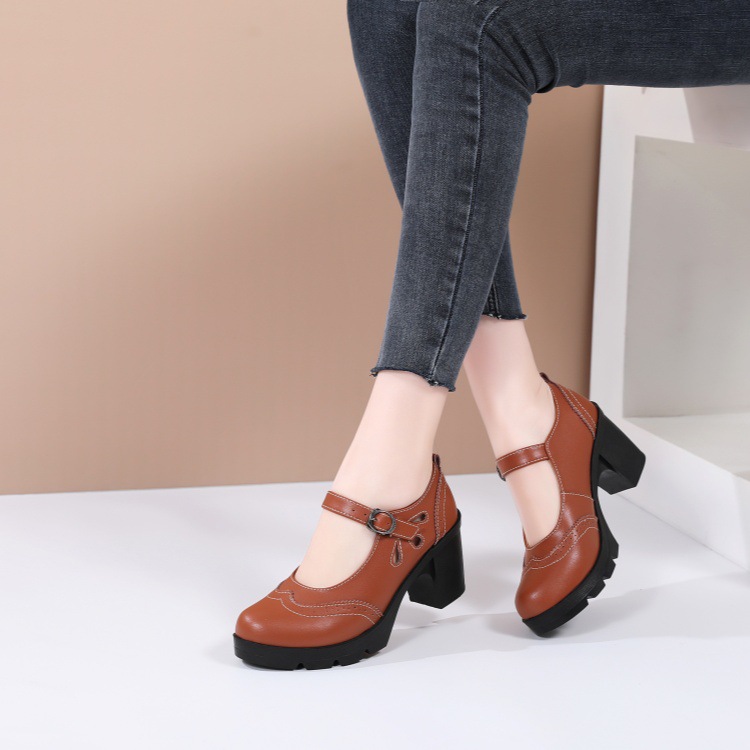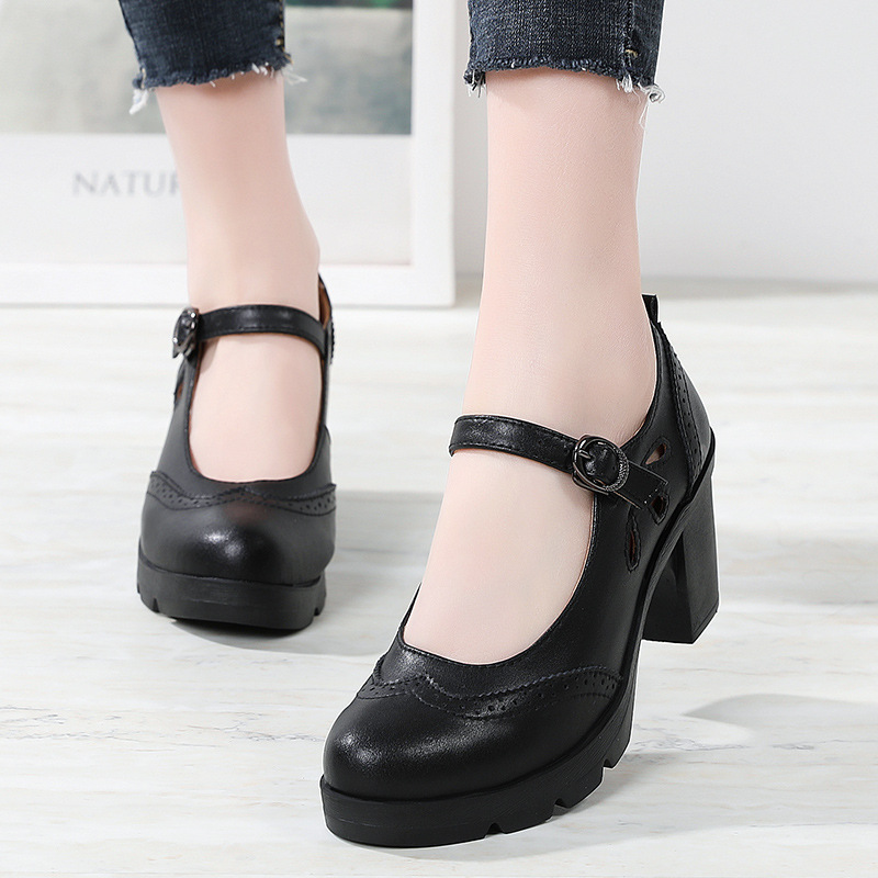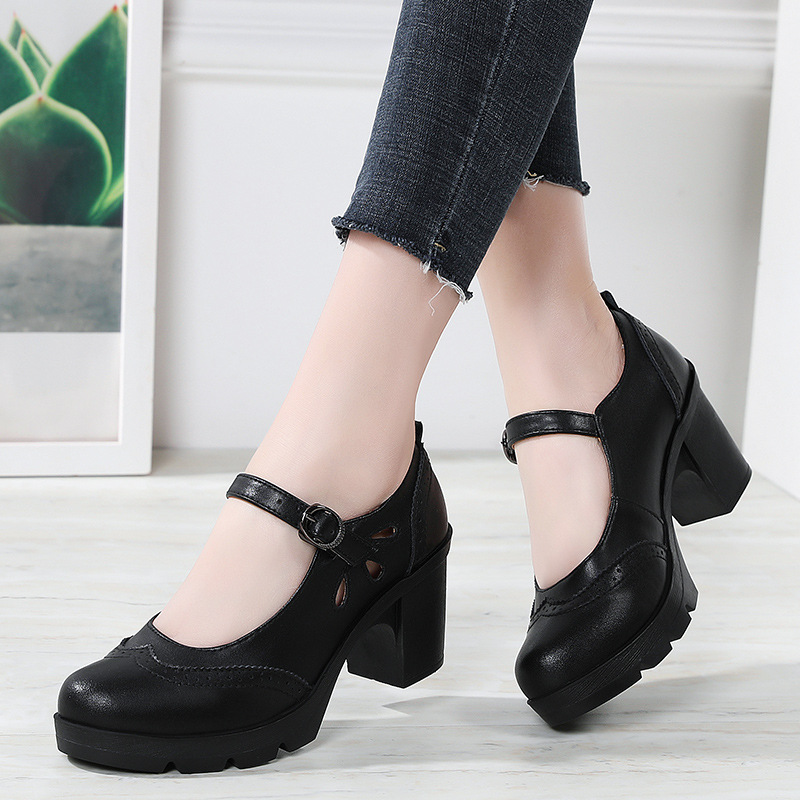 봄, 가을 클래식 다용도 두꺼운 굽 대형 여성용 복고풍 원라인 버클 미드 힐 통러 작은 가죽 신발 여성용 하이힐 싱글 슈즈스토어 가기