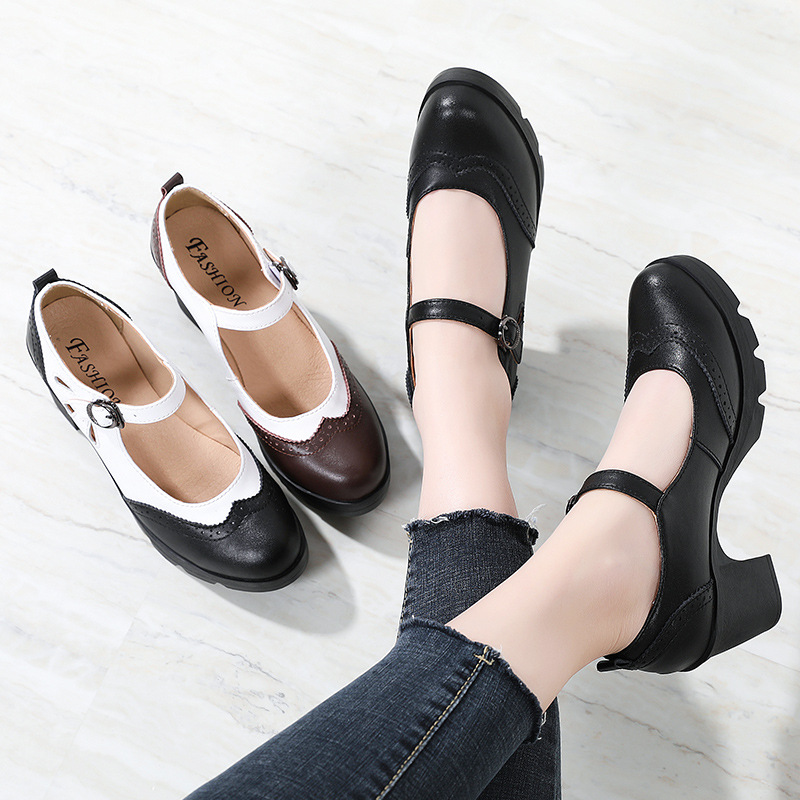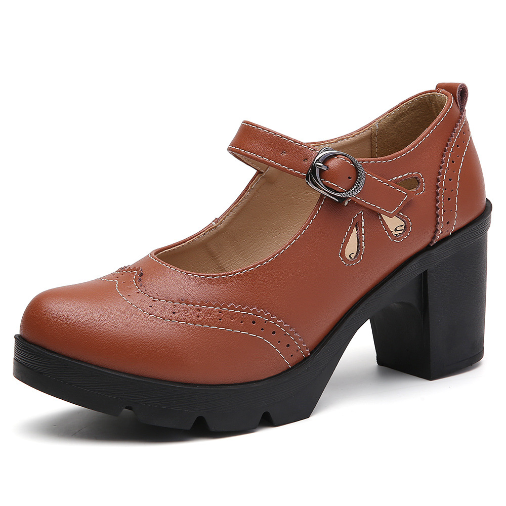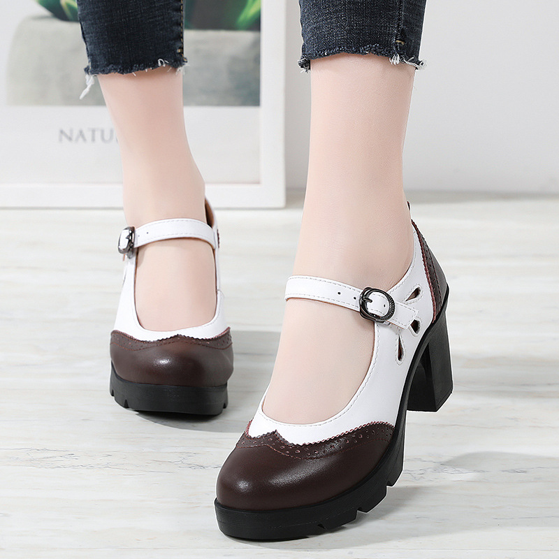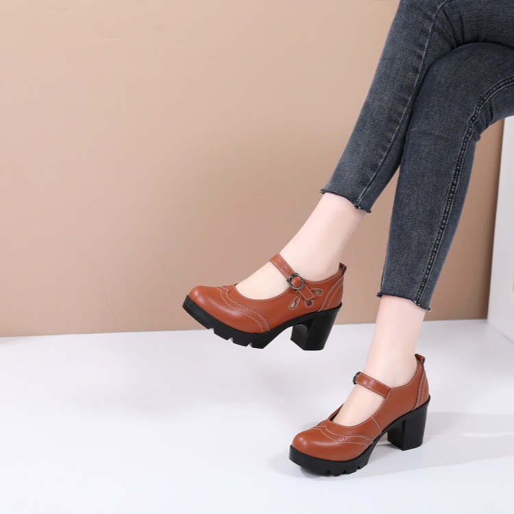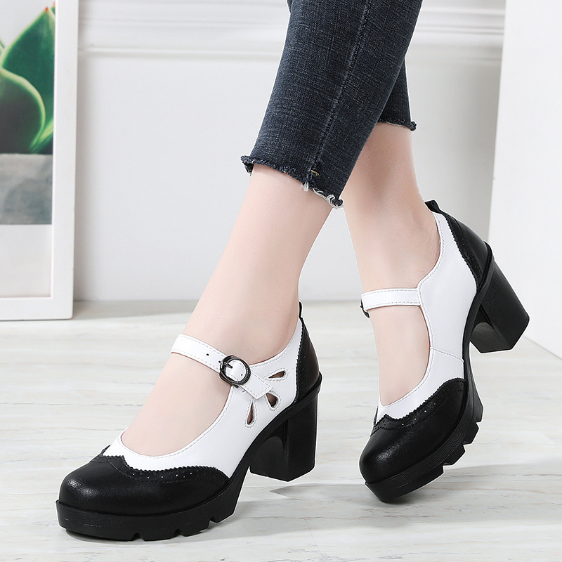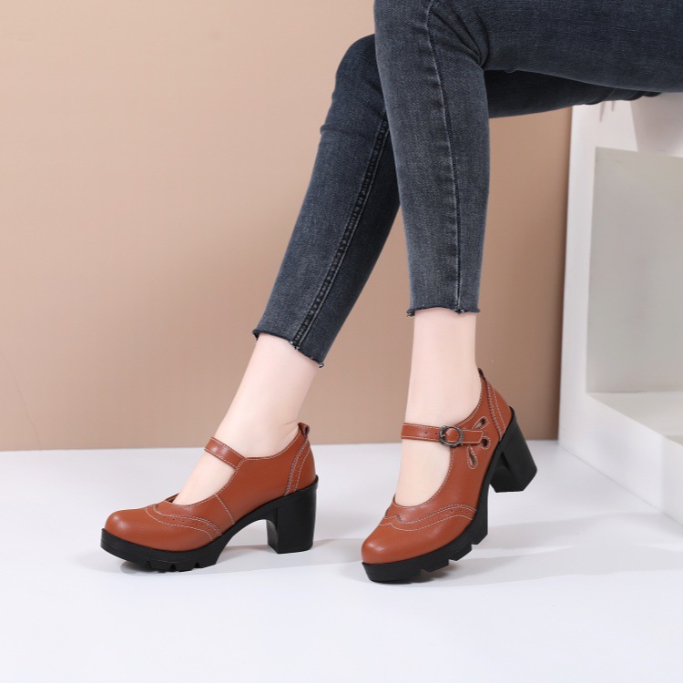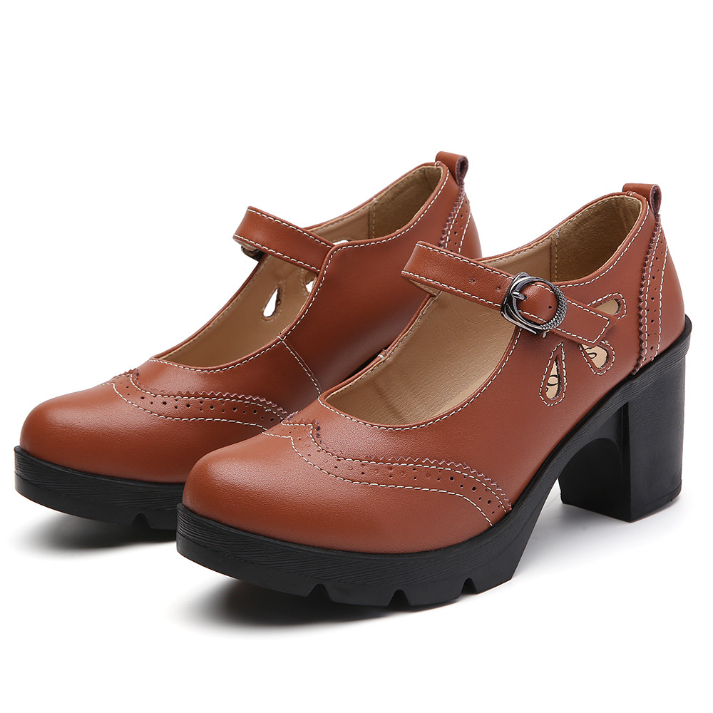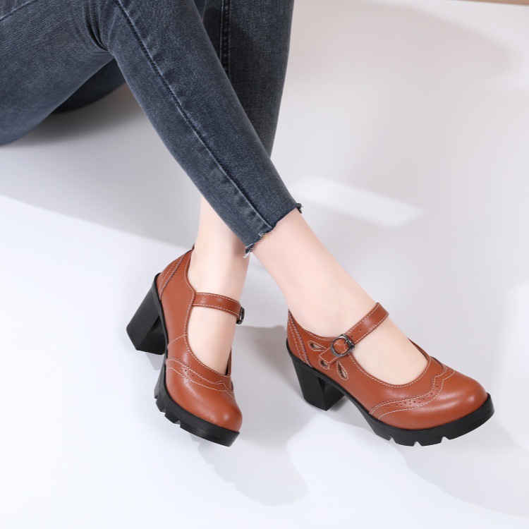 봄, 가을 클래식 다용도 두꺼운 굽 대형 여성용 복고풍 원라인 버클 미드 힐 통러 작은 가죽 신발 여성용 하이힐 싱글 슈즈스토어 가기