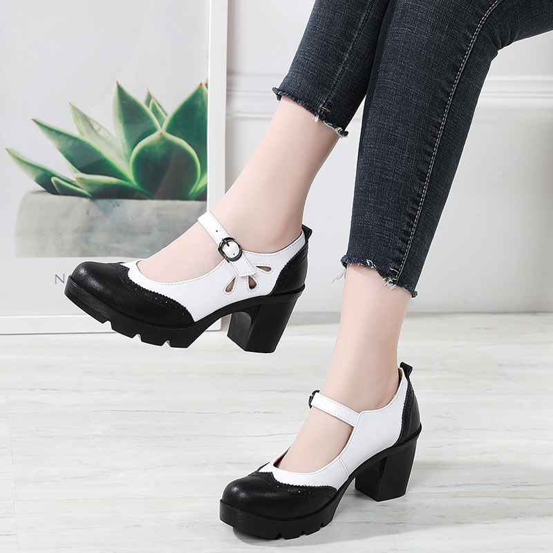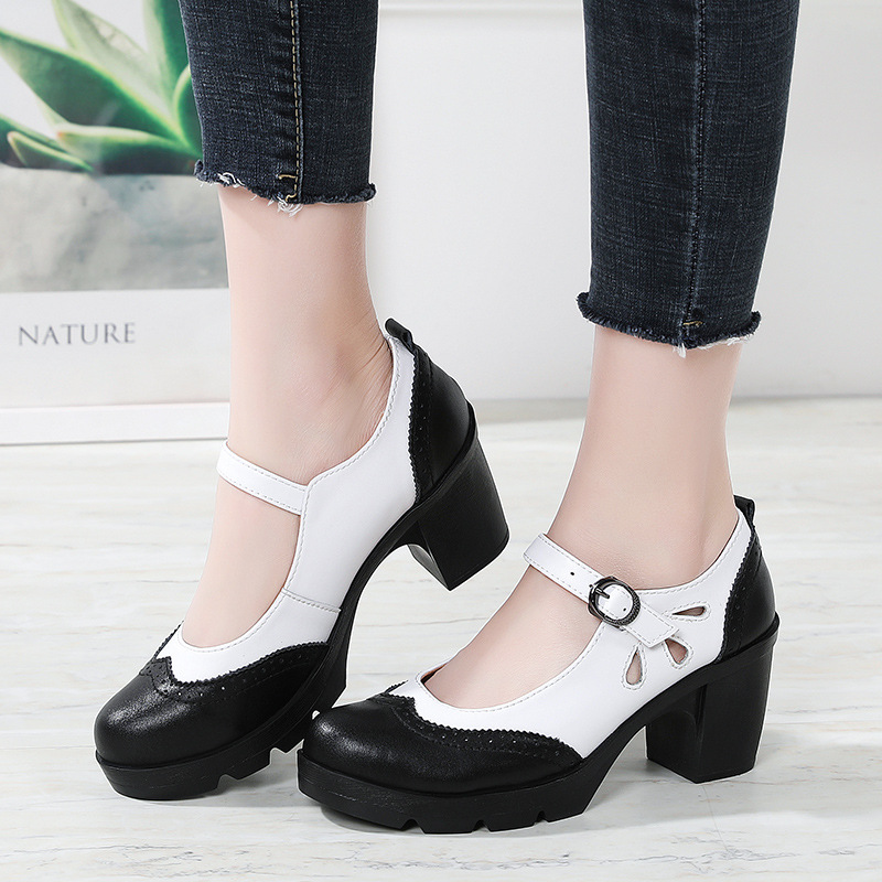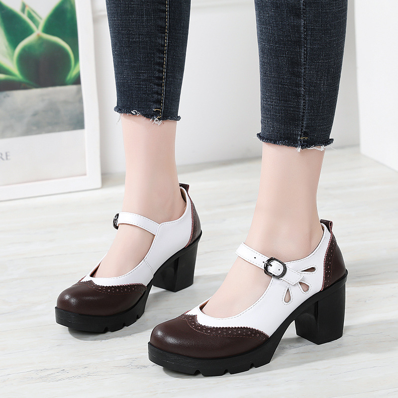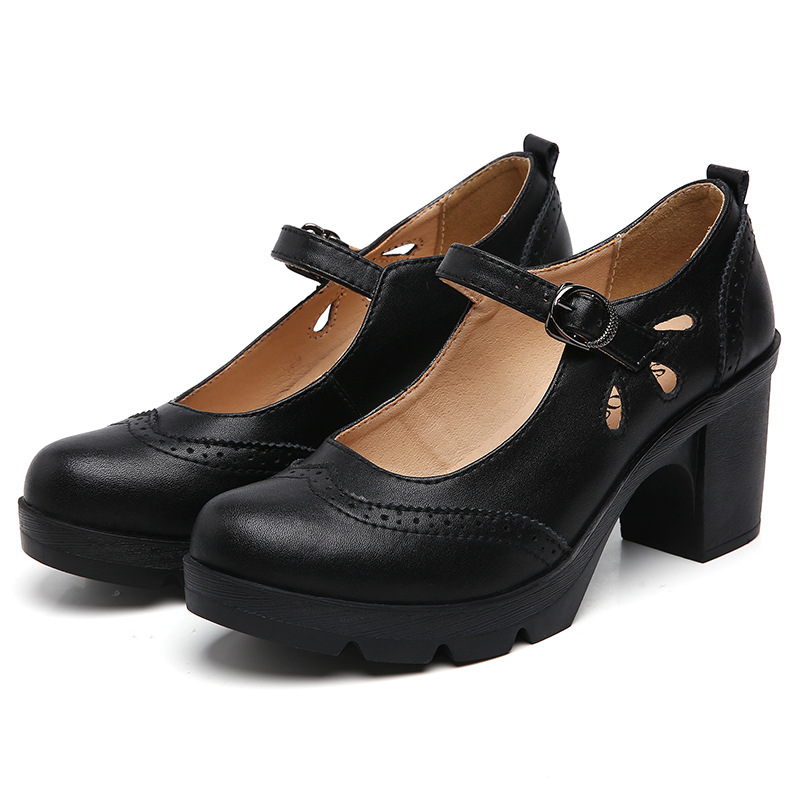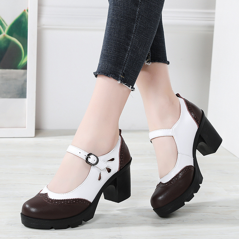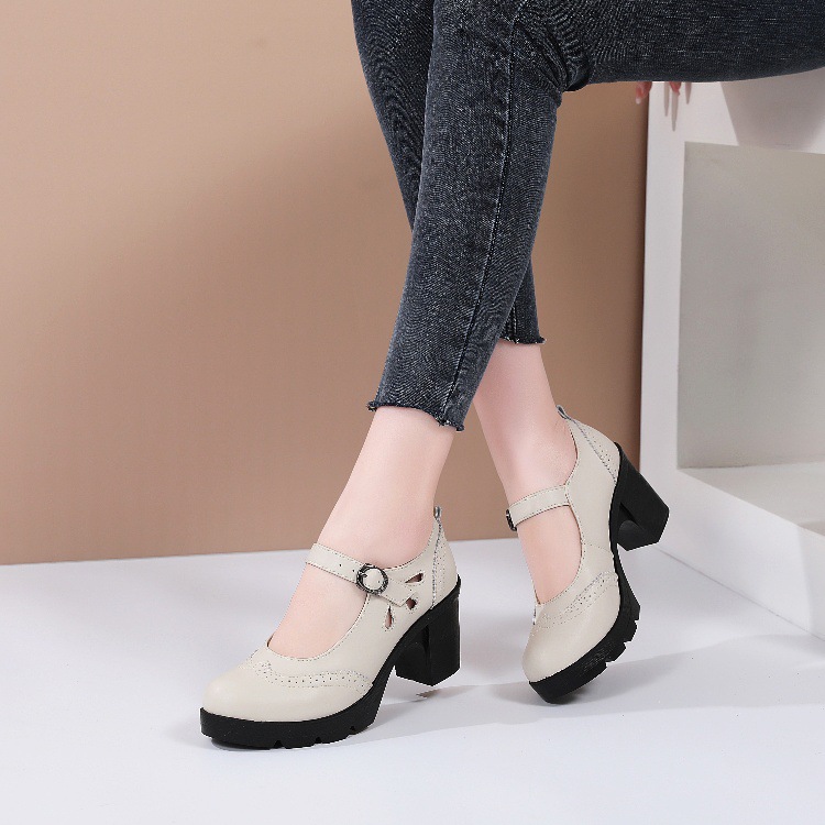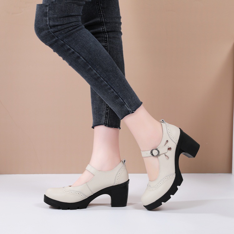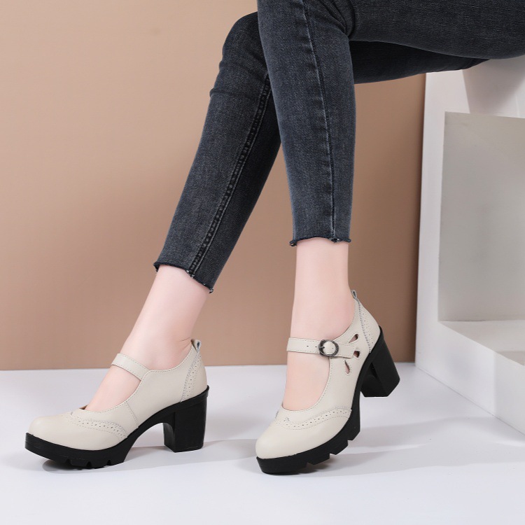 봄, 가을 클래식 다용도 두꺼운 굽 대형 여성용 복고풍 원라인 버클 미드 힐 통러 작은 가죽 신발 여성용 하이힐 싱글 슈즈스토어 가기