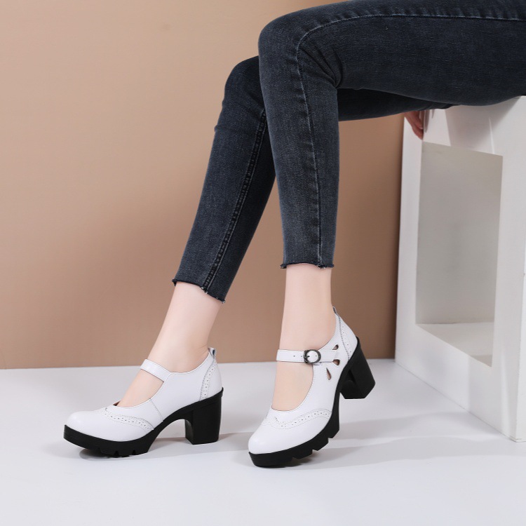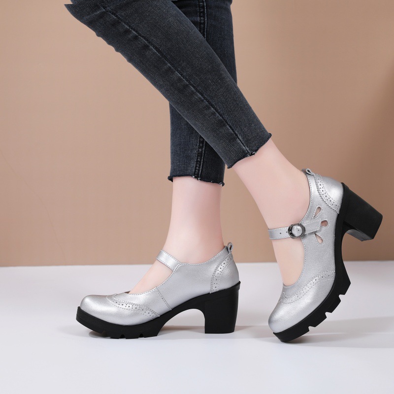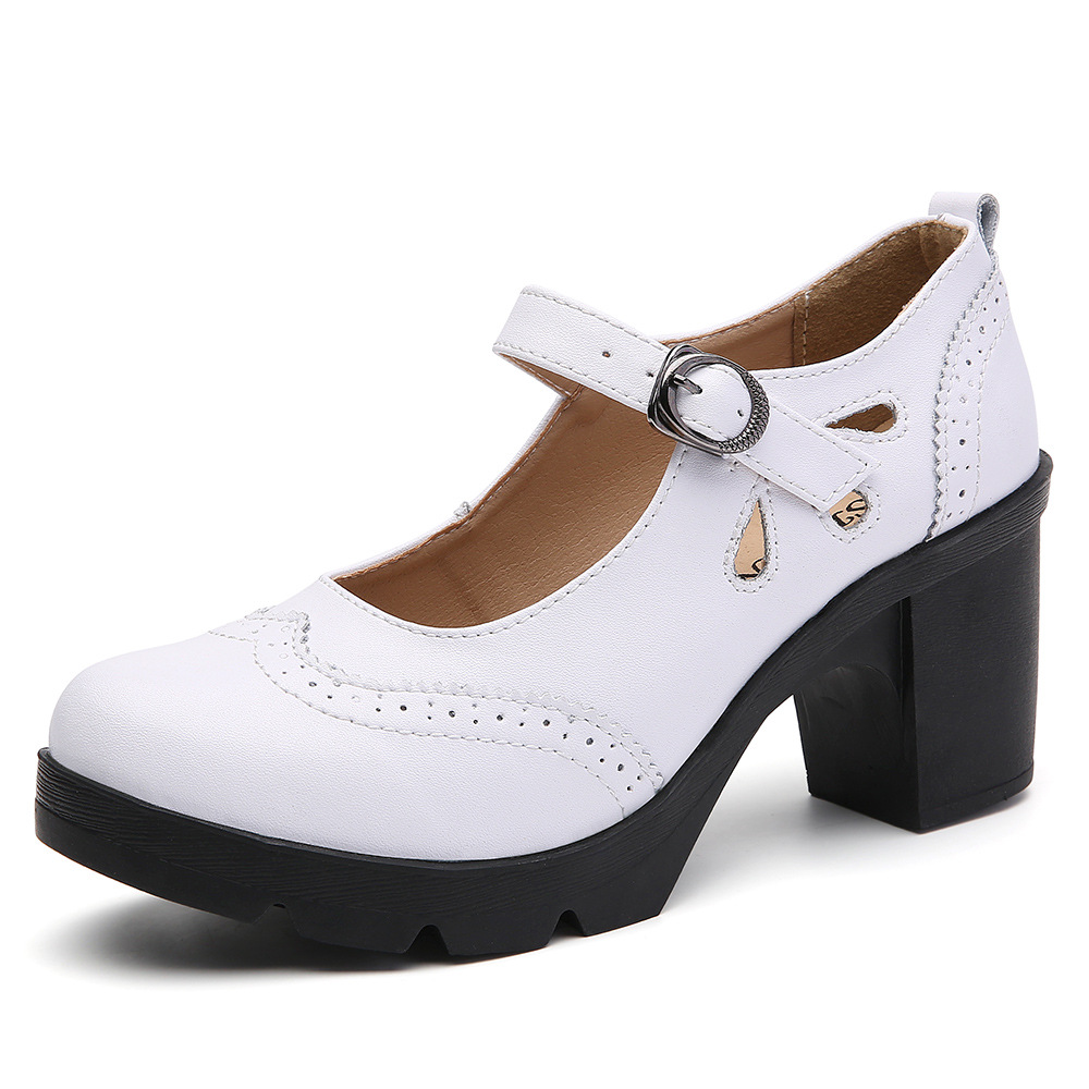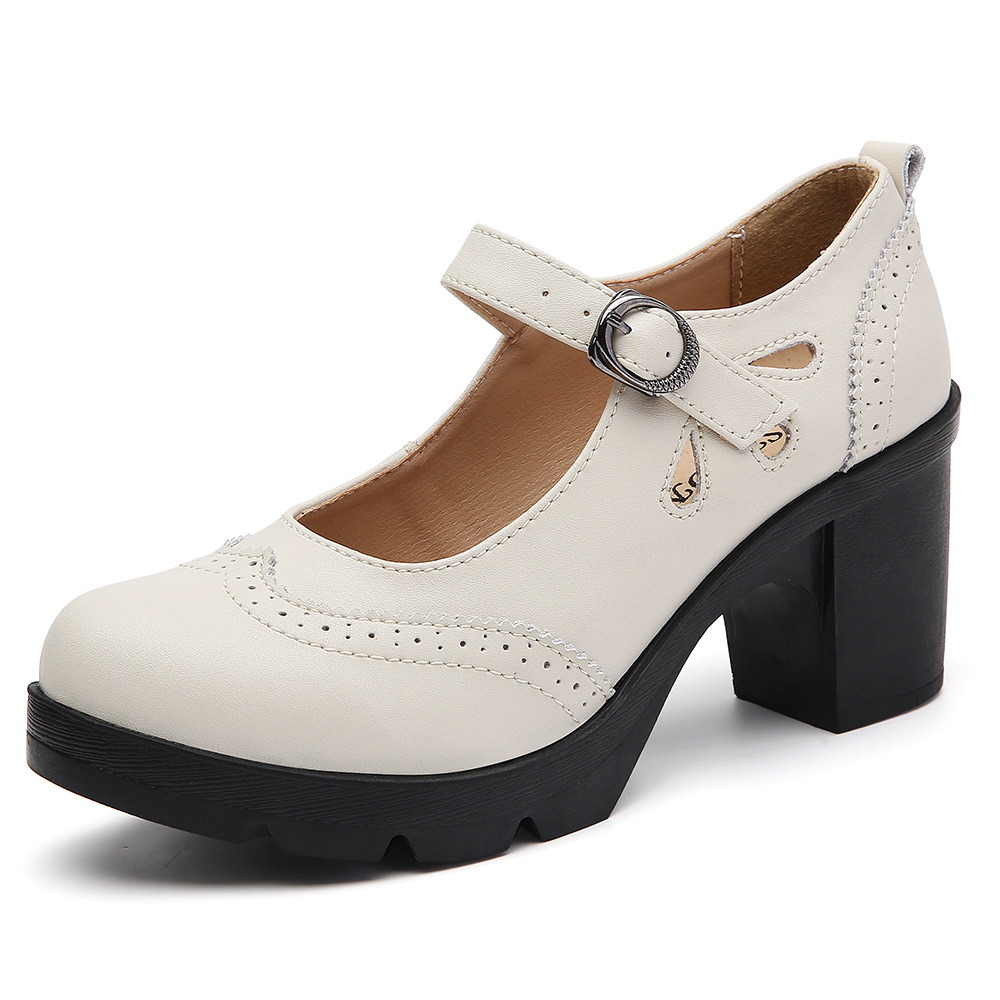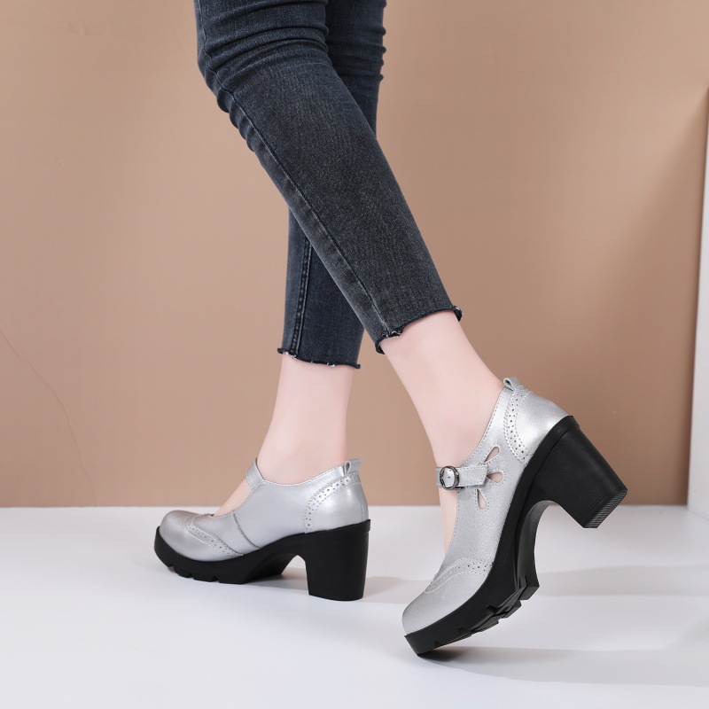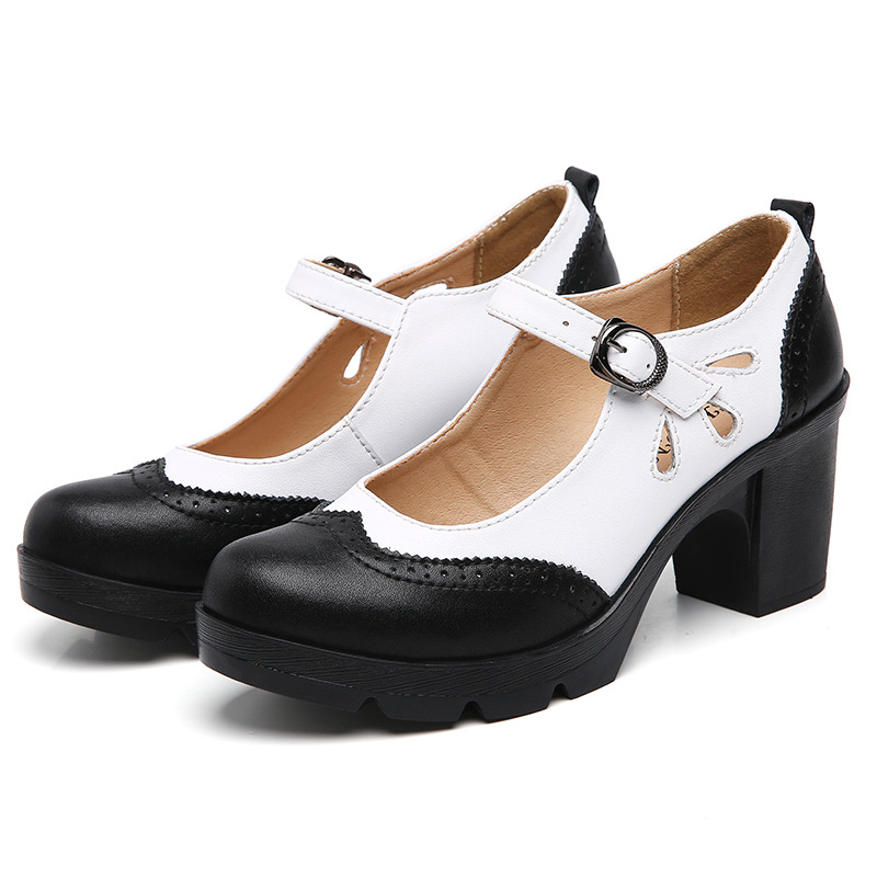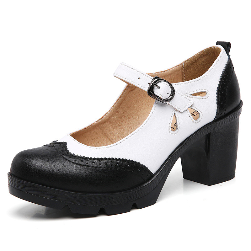 봄, 가을 클래식 다용도 두꺼운 굽 대형 여성용 복고풍 원라인 버클 미드 힐 통러 작은 가죽 신발 여성용 하이힐 싱글 슈즈스토어 가기