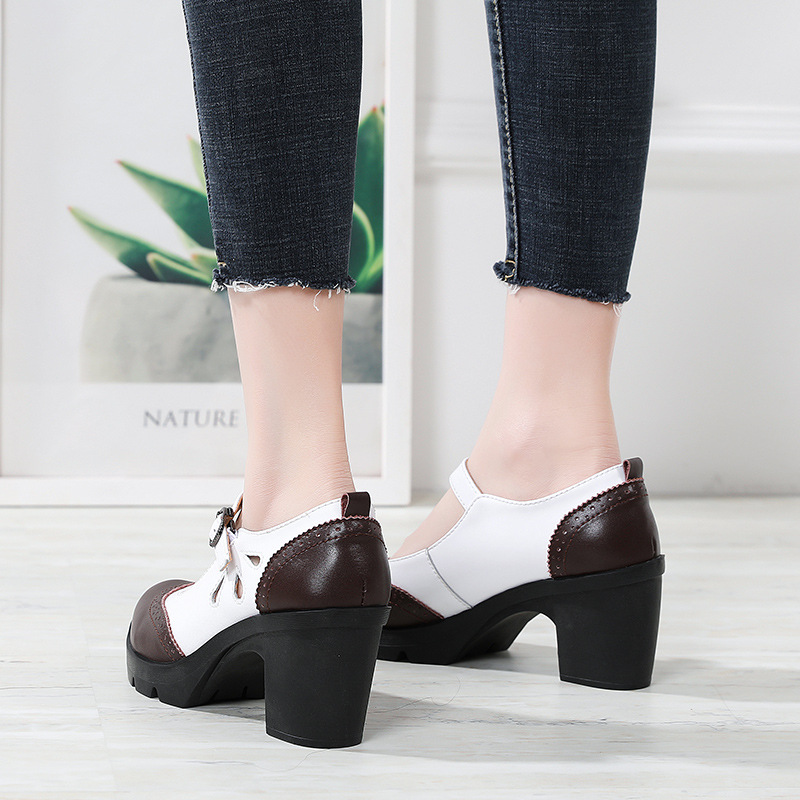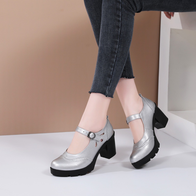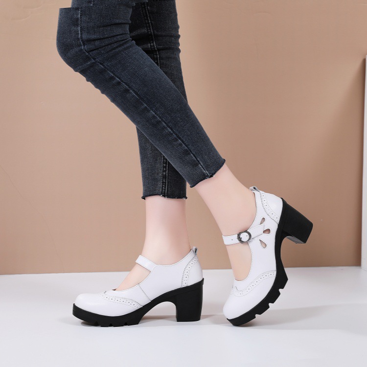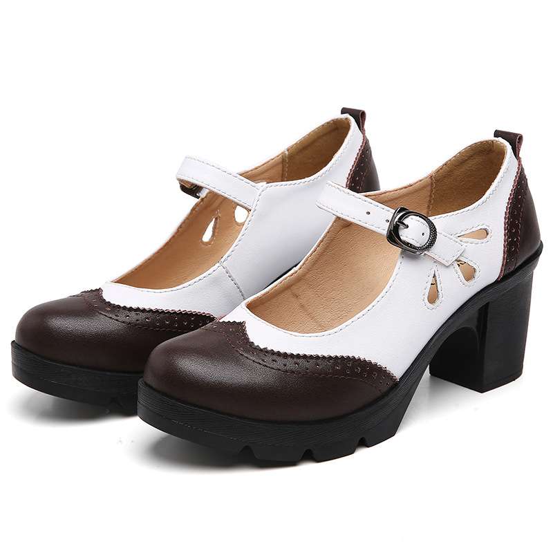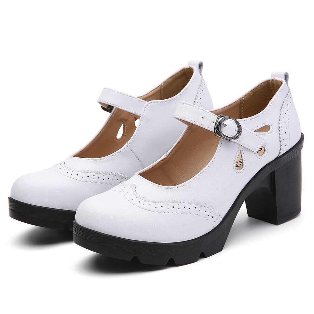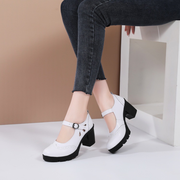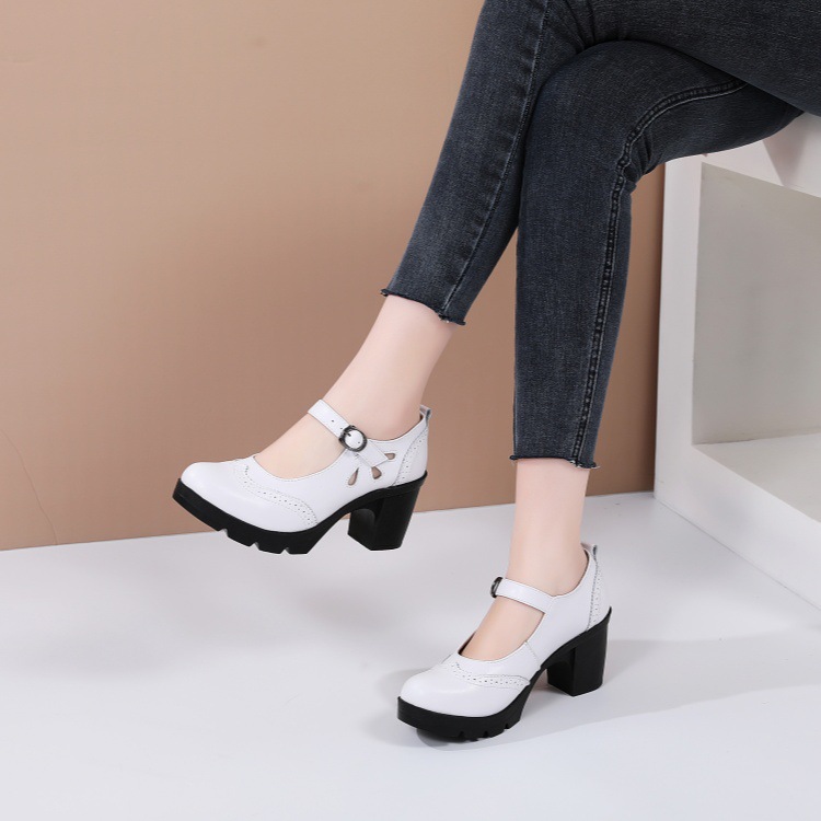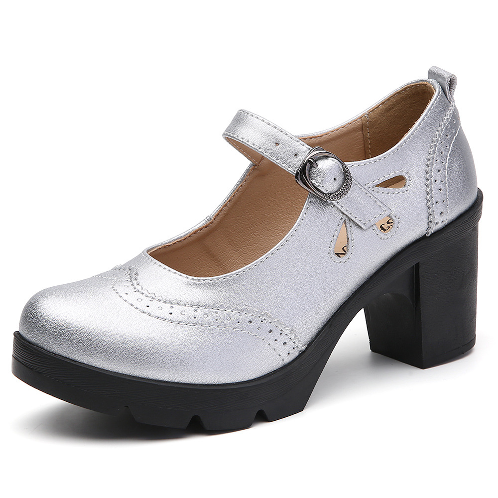 봄, 가을 클래식 다용도 두꺼운 굽 대형 여성용 복고풍 원라인 버클 미드 힐 통러 작은 가죽 신발 여성용 하이힐 싱글 슈즈스토어 가기