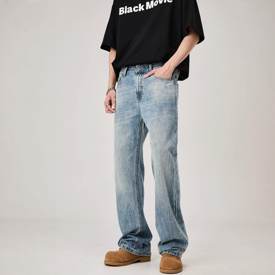 드레이핑이 뛰어나고 루즈하며 살을 커버해주고 날씬해 보이는 남성용 아메리칸 헤비웨이트 워싱 찢어진 와이드 레그 청바지, 캐주얼하고 활용도가 높은 스트레이트 팬츠