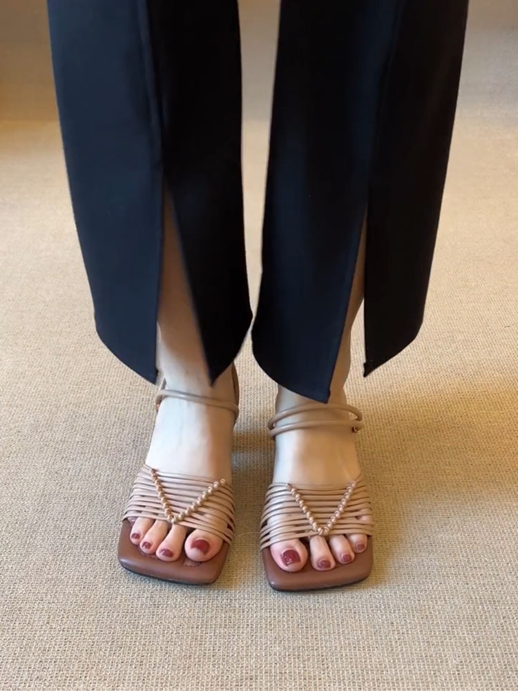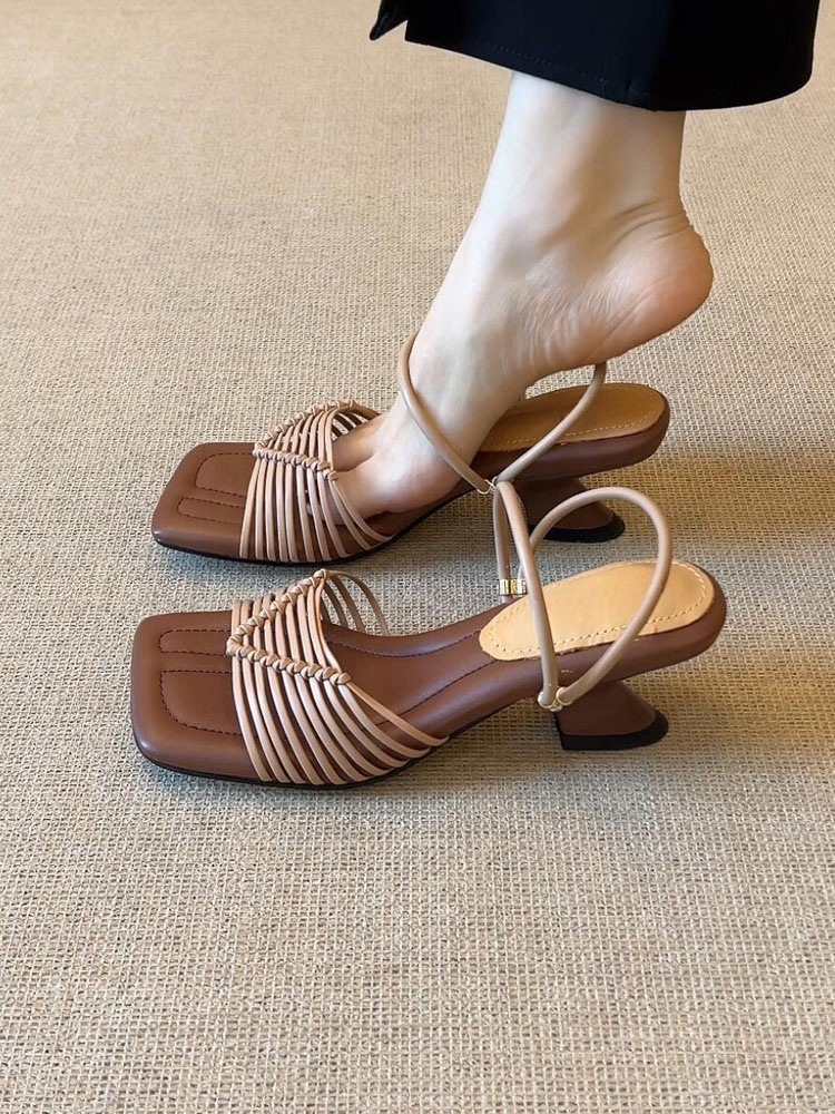 배설물 느낌을 밟는 작은 군중 ~ 양가죽 프랑스 복고풍 짠 샌들 여성의 2025 년 여름 새로운 사각형 모양의 하이힐스토어 가기