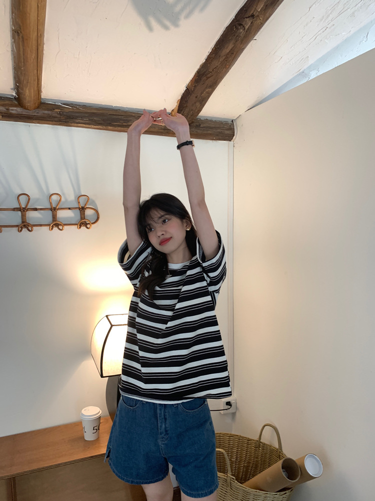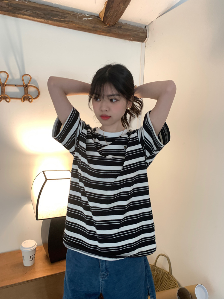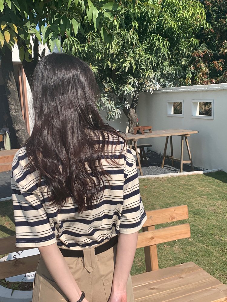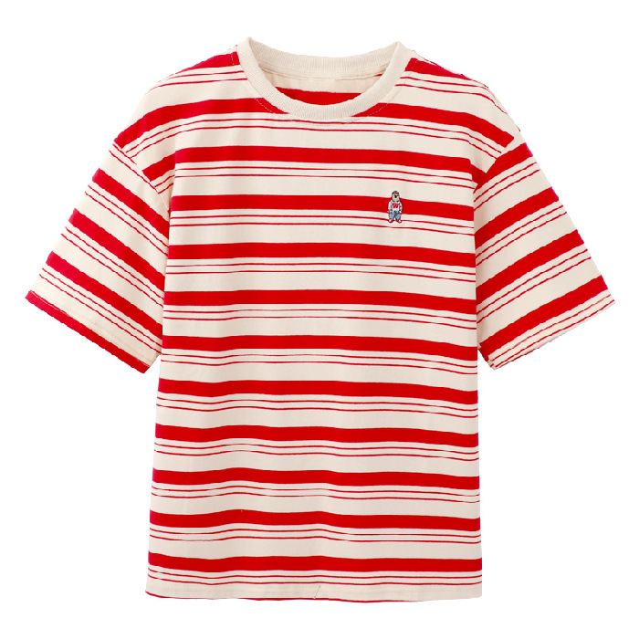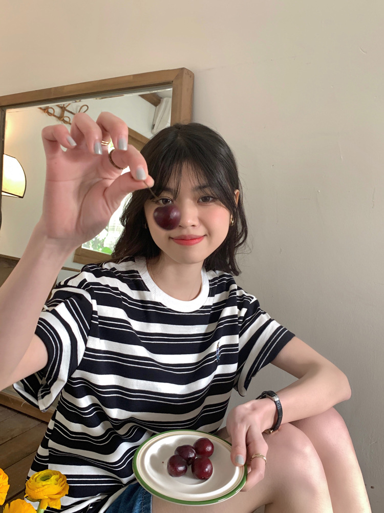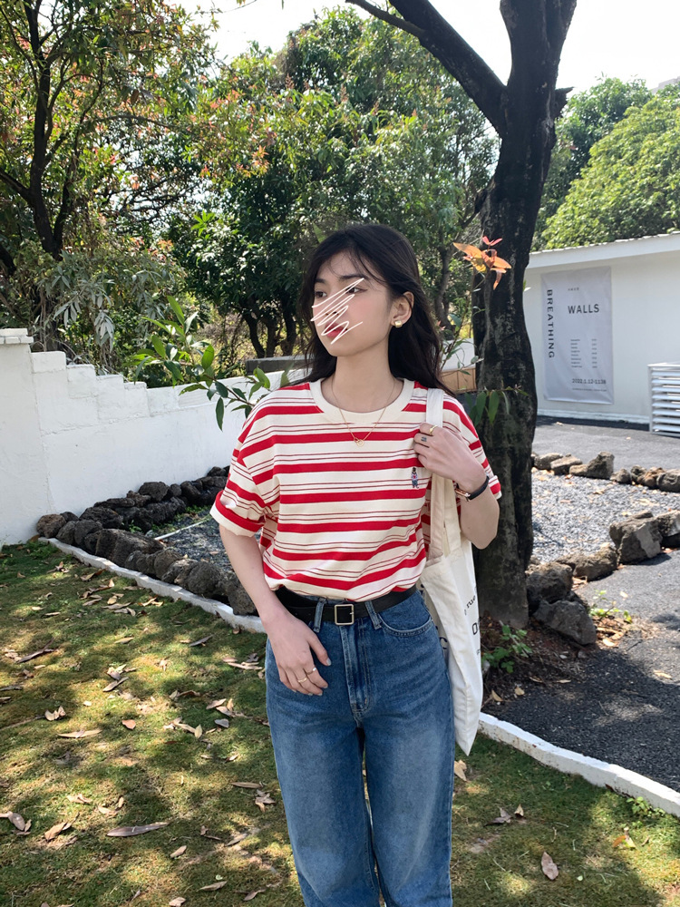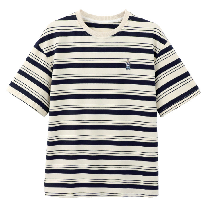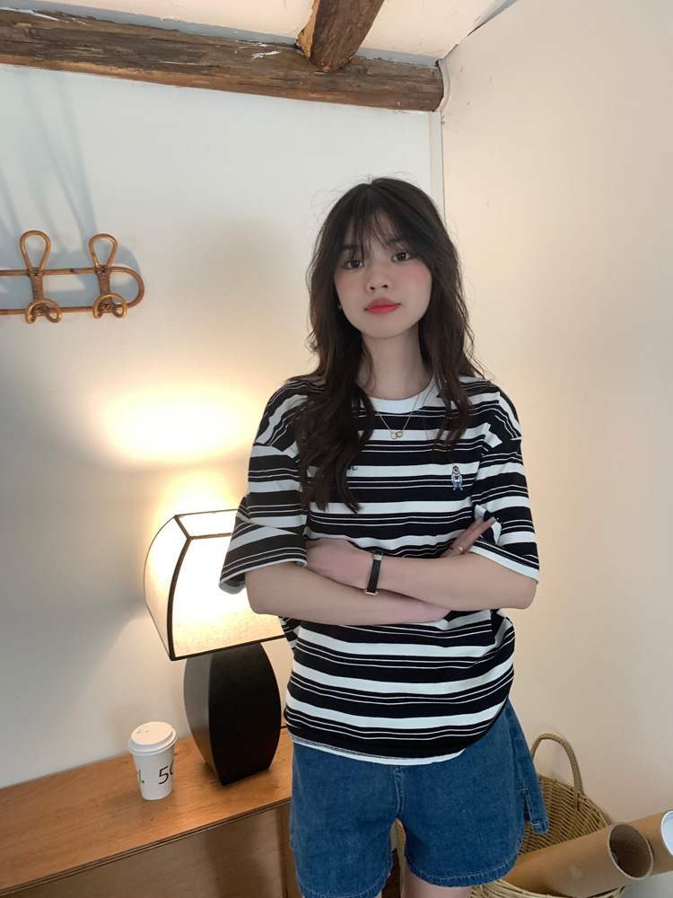 Spot 2025 베어 자수 스트라이프 티셔츠 여성 여름 한국 스타일 시크 루즈 반팔 인 트렌디 반팔 탑스토어 가기