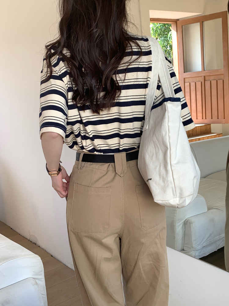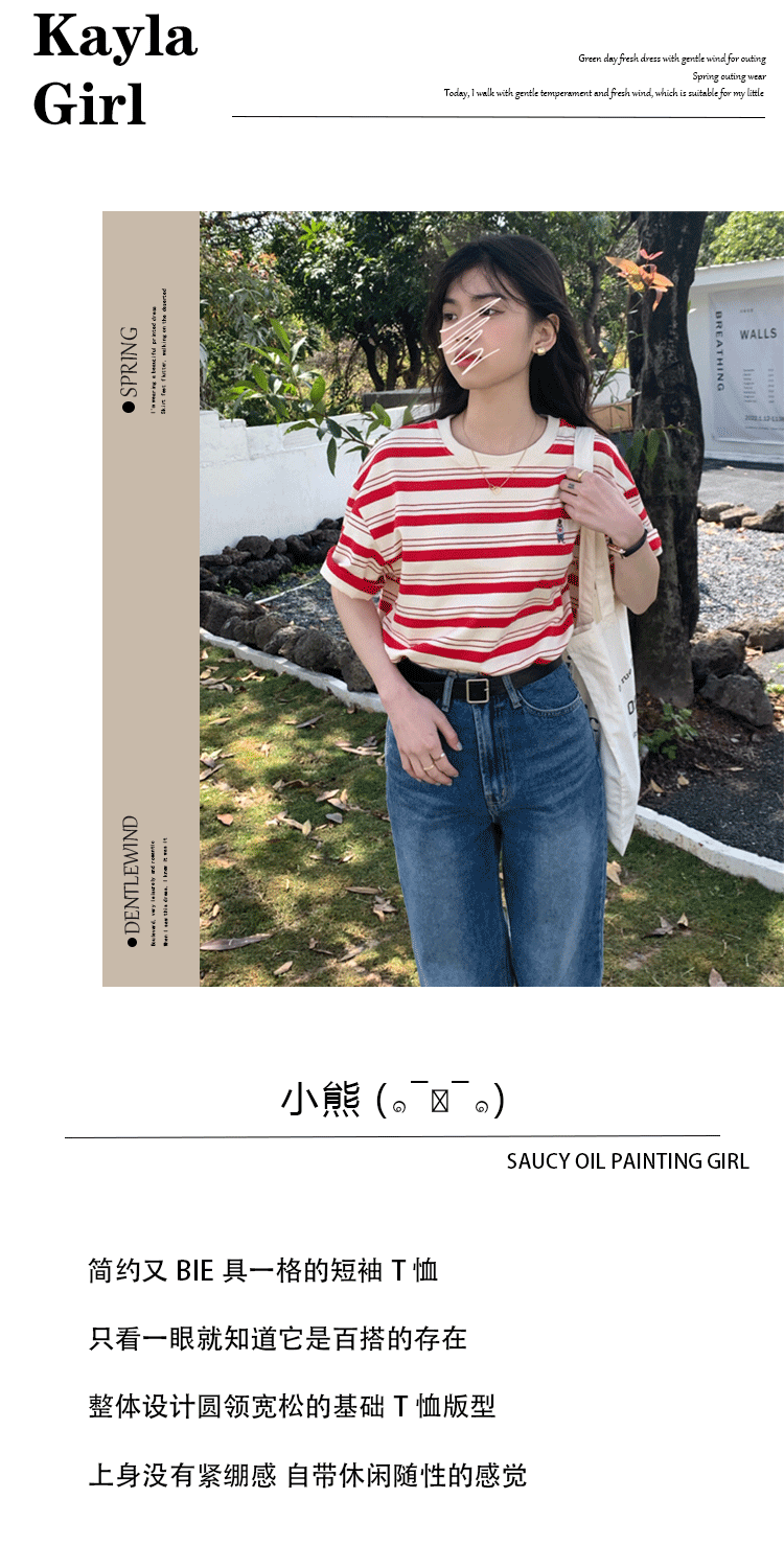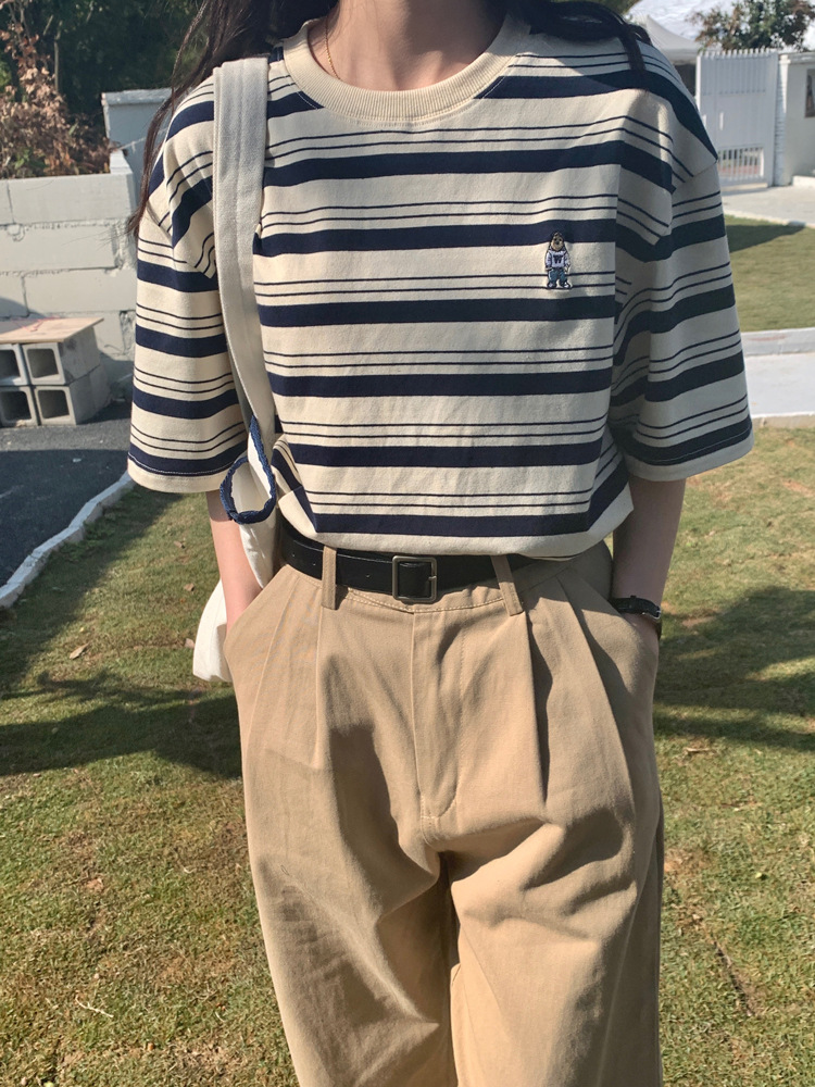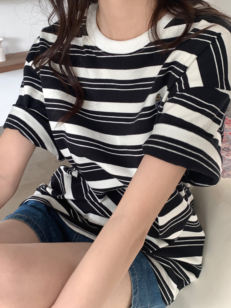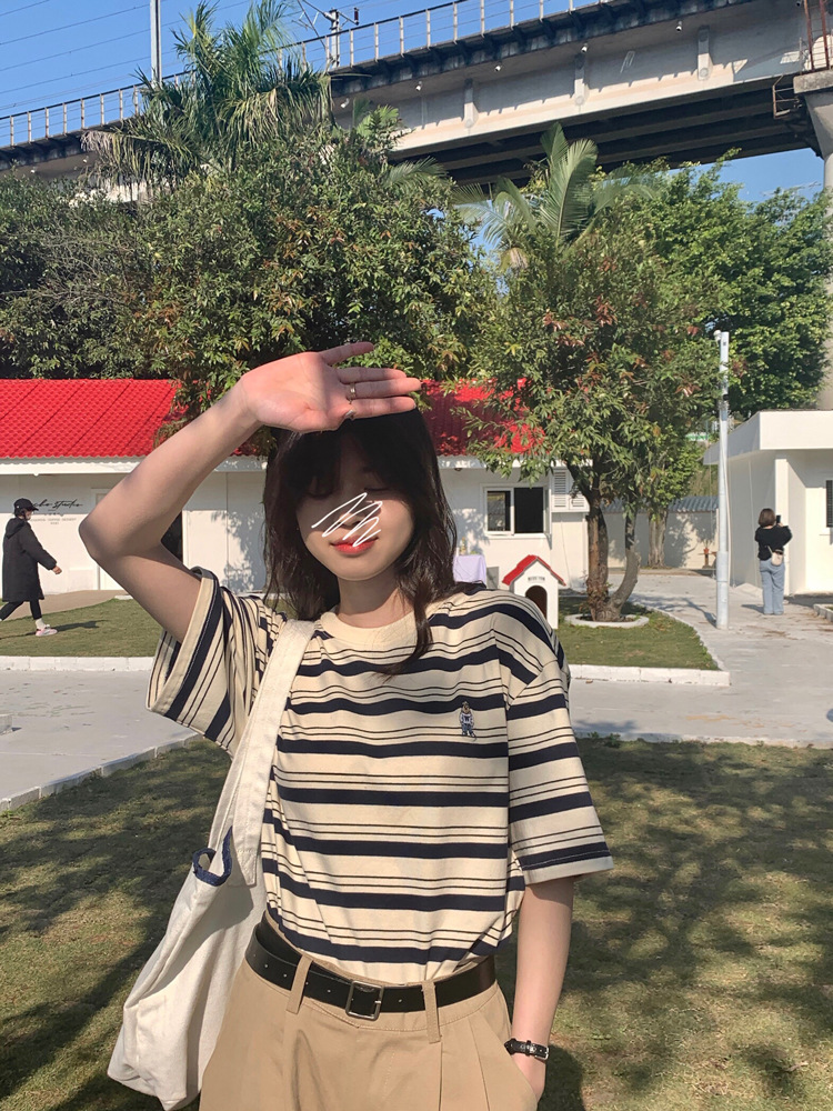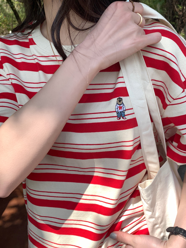 Z0113#冰丝小熊刺绣条纹T恤女夏季韩版chic宽松半袖ins潮短袖上衣