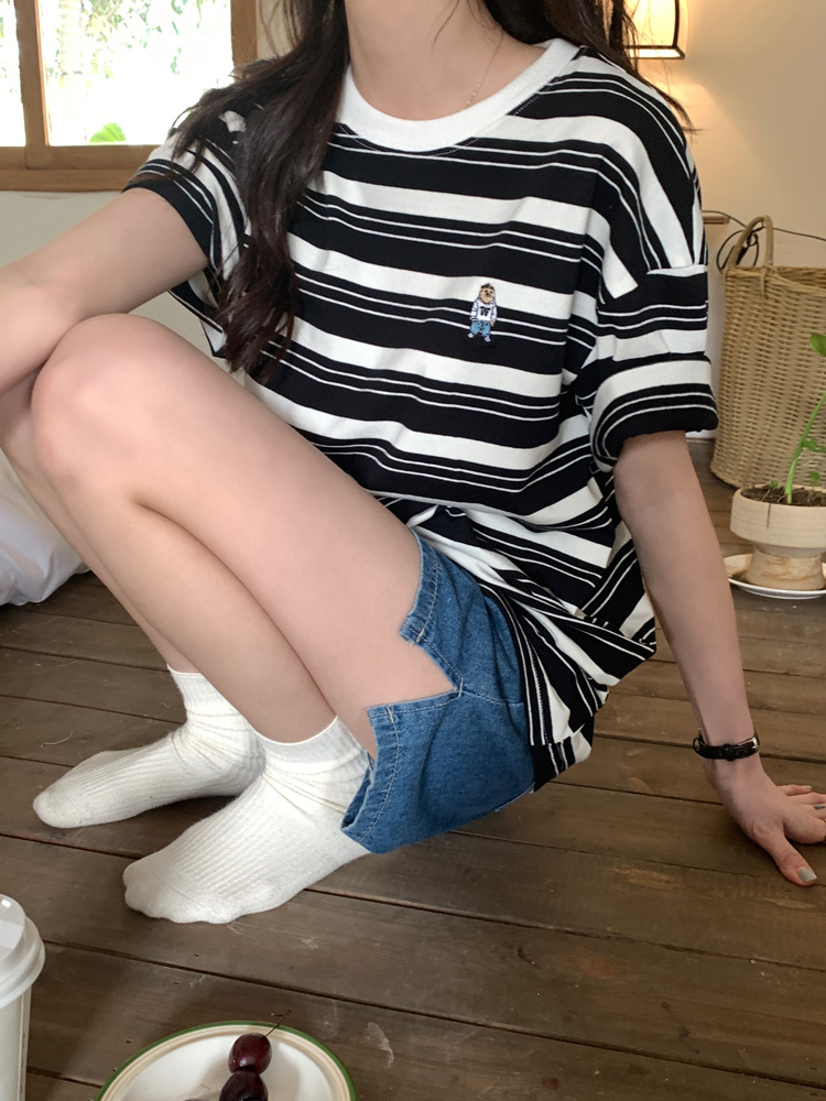 Spot 2025 베어 자수 스트라이프 티셔츠 여성 여름 한국 스타일 시크 루즈 반팔 인 트렌디 반팔 탑