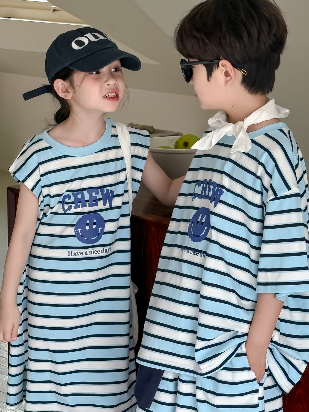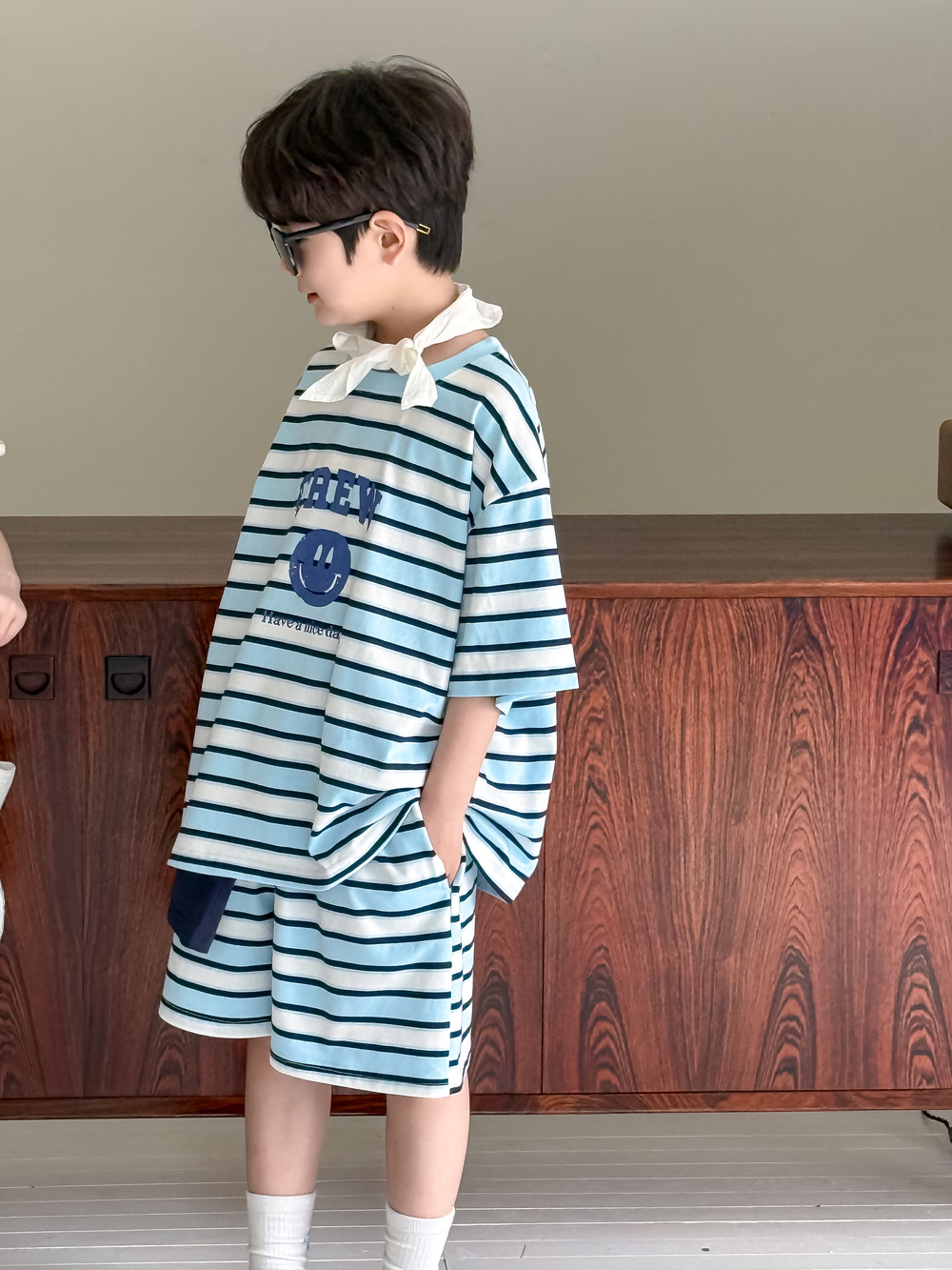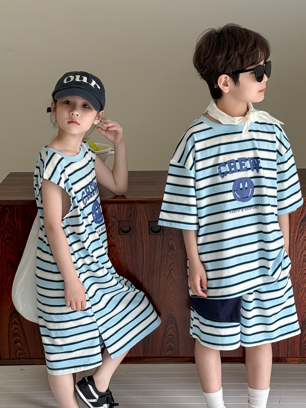 아동복 세트 2026 여름 남아 여아 한국 스타일 레터링 반팔 반바지 투피스 세트 아동용 라운드넥 스트라이프 원피스스토어 가기
