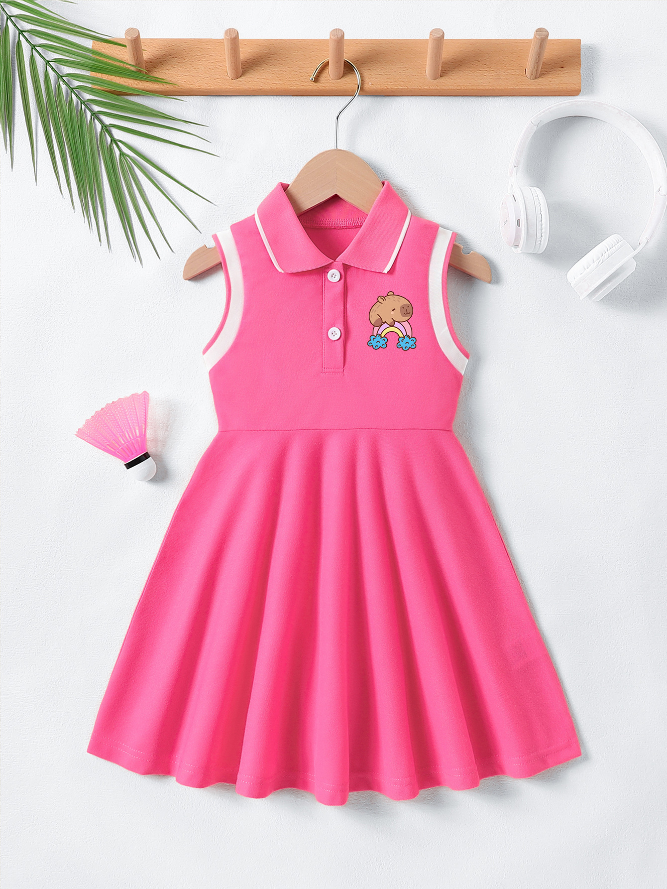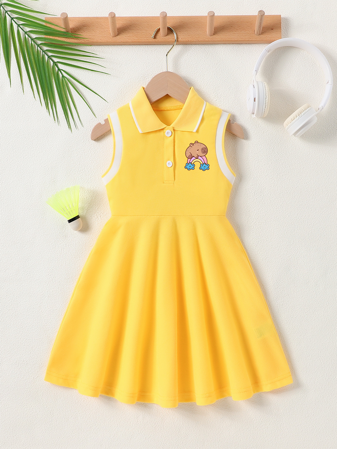 여자 만화 귀여운 카비 바라 프린트 폴로 칼라 민소매 드레스스토어 가기