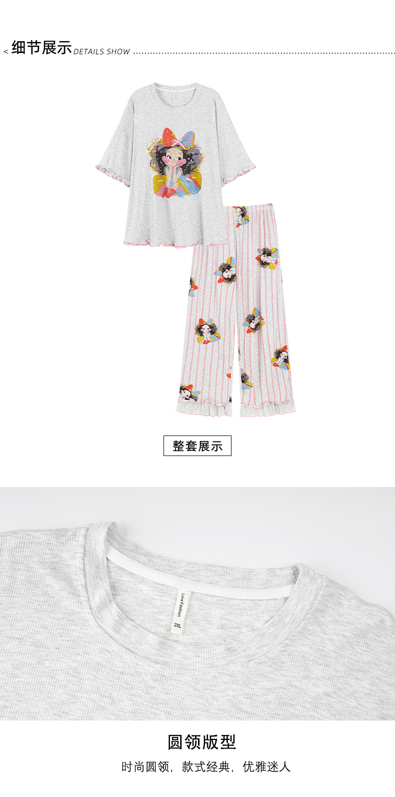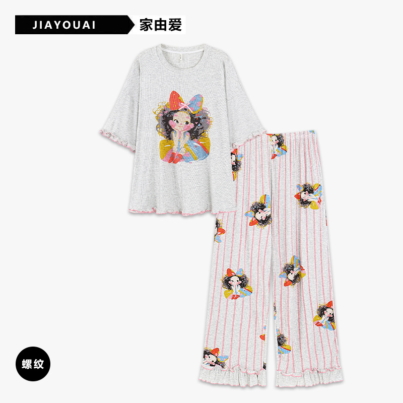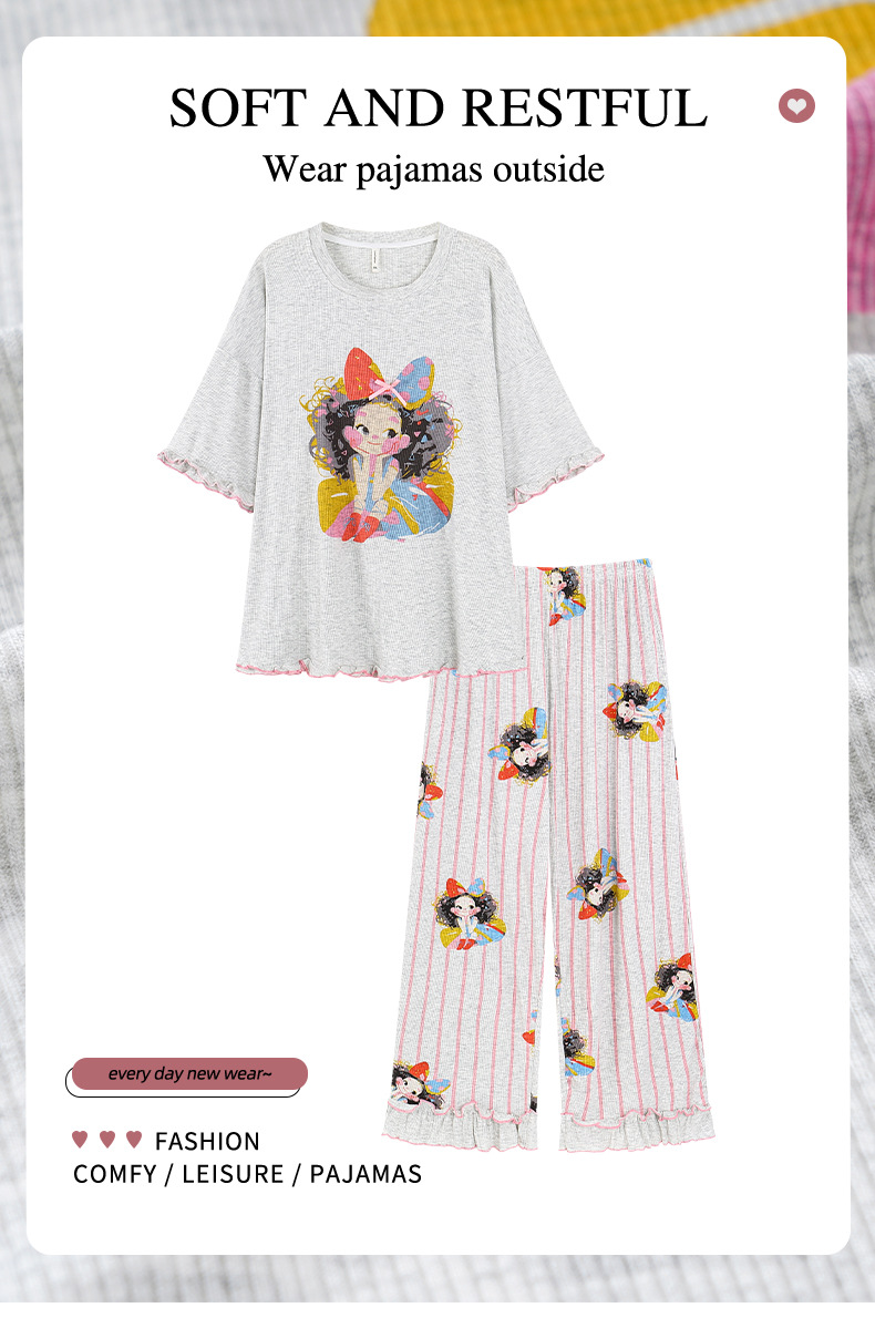 잠옷 여성의 여름 귀여운 만화 인쇄 반팔 플러스 사이즈 줄무늬 바지 세트 시원한 느낌의 홈 옷을 입을 수 있습니다스토어 가기