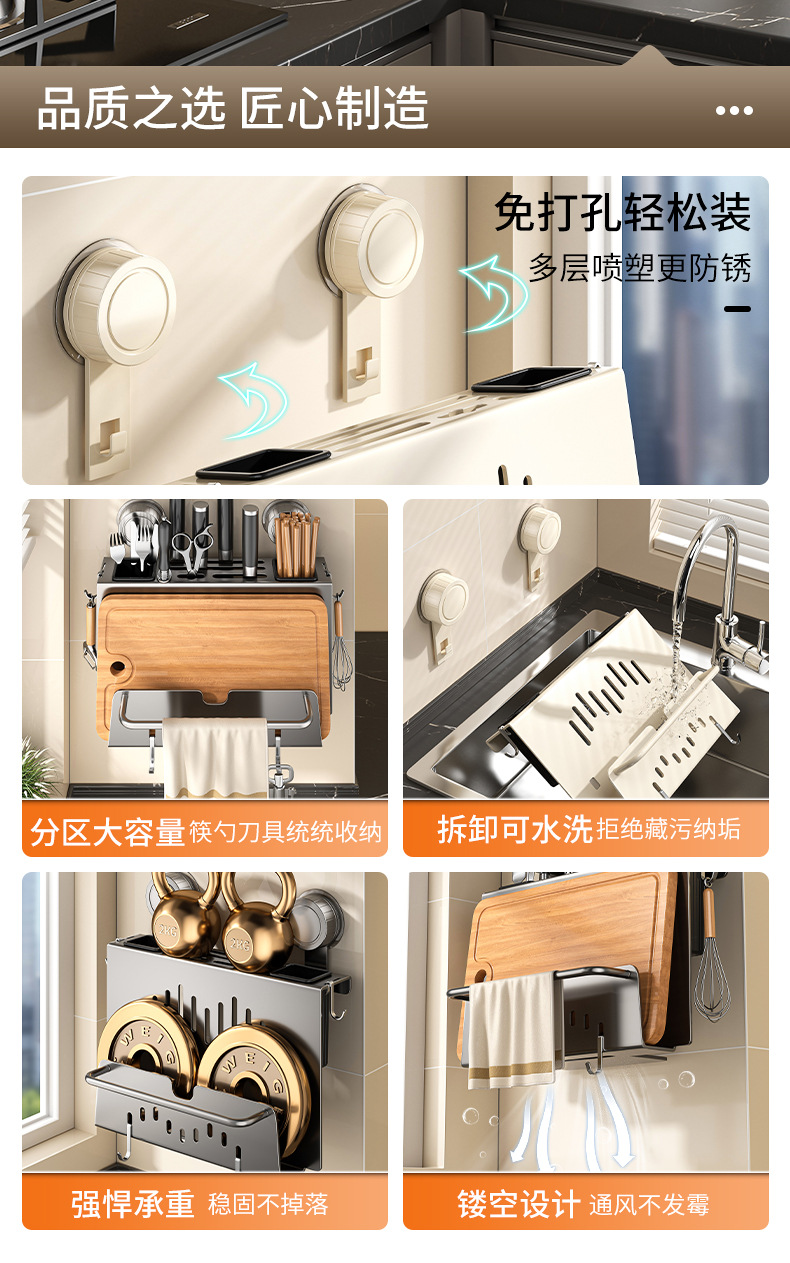 흡입 컵 못없는 벽에 장착 된 주방 칼 홀더 펀치 무료 다기능 벽 랙 가정용 젓가락 보관 랙