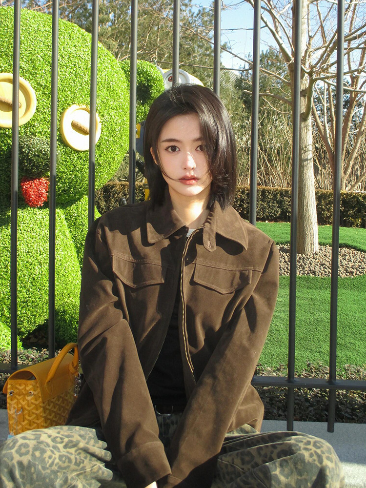 여성용 브라운 스웨이드 재킷 2025 봄 새로운 루즈하고 다재다능한 짧은 지퍼 캐주얼 재킷 탑 트렌디스토어 가기