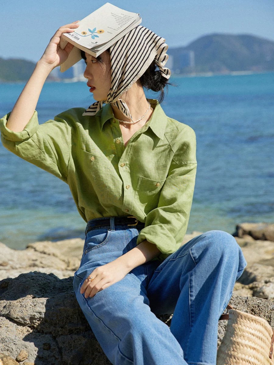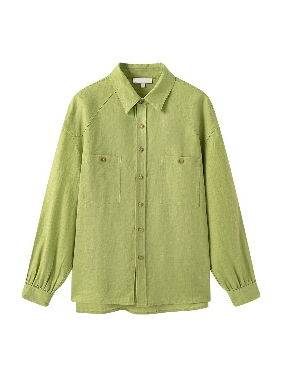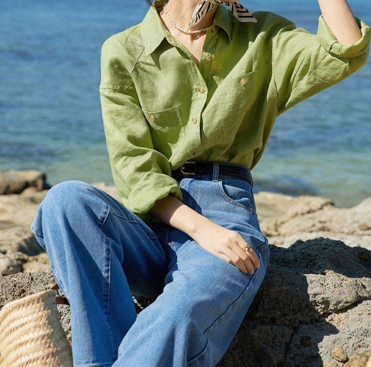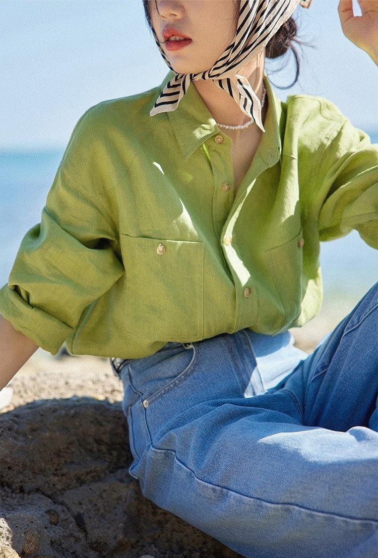 프랑스 복고풍 14 카운트 린넨 녹색 긴팔 소금 셔츠 여성 봄, 여름 새로운 캐주얼 루즈 셔츠스토어 가기