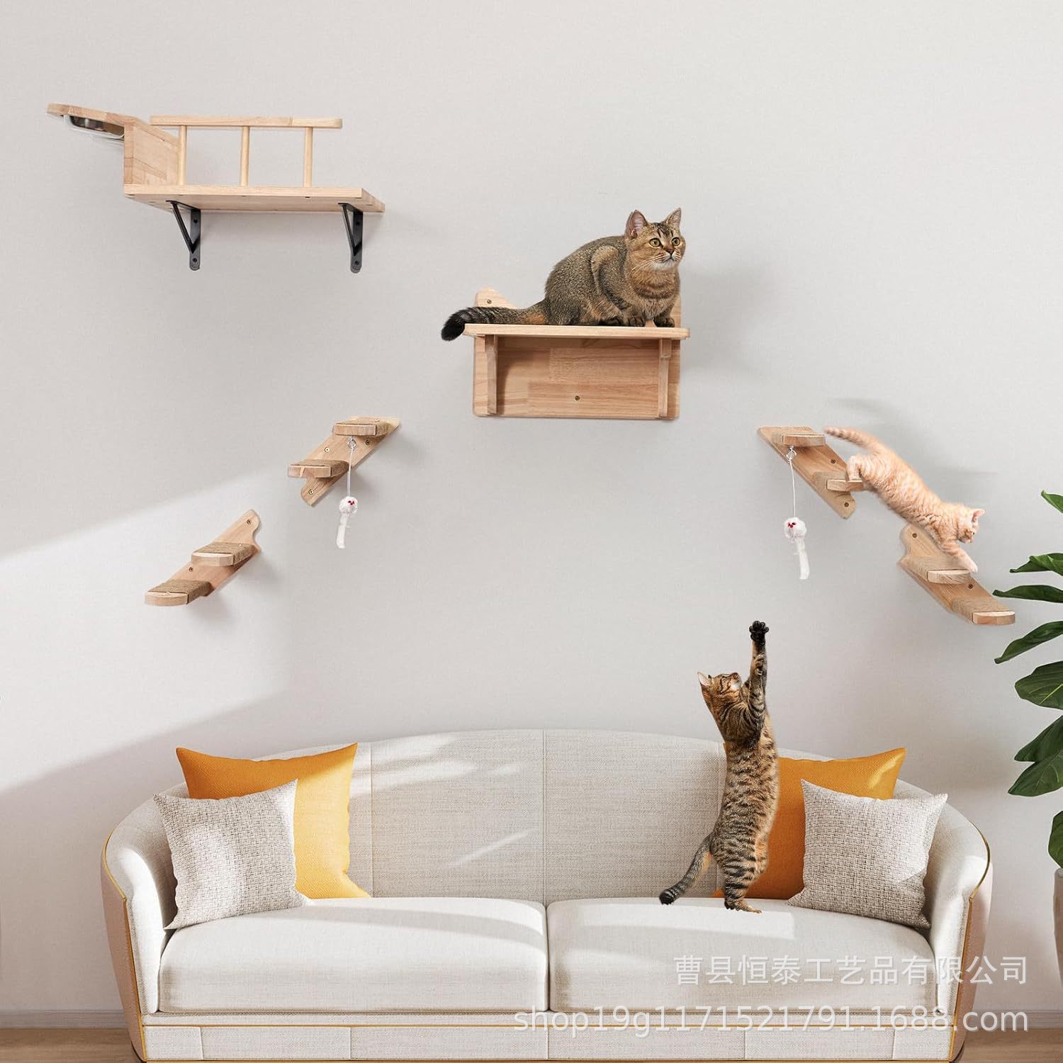 现货猫爬架实木墙上猫窝壁挂式双碗倾斜式喂食架宠物猫跳台猫爬梯