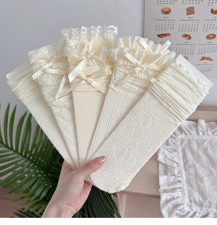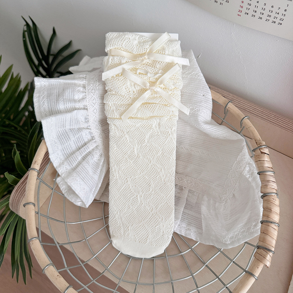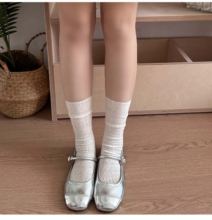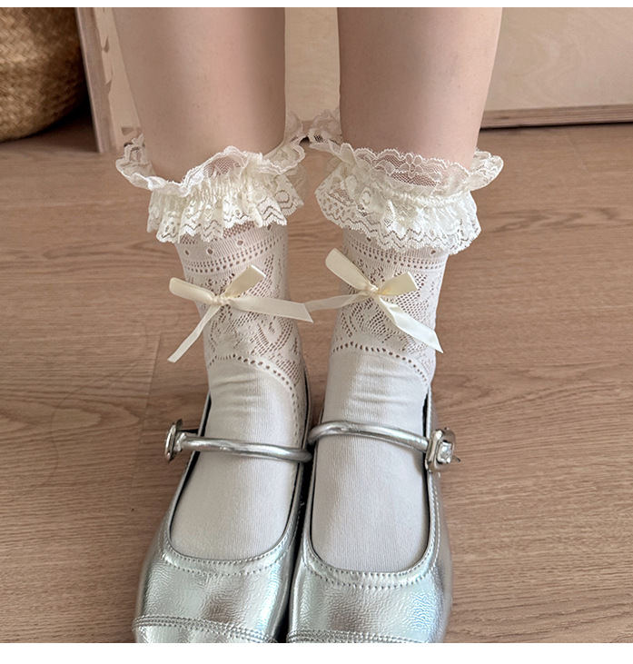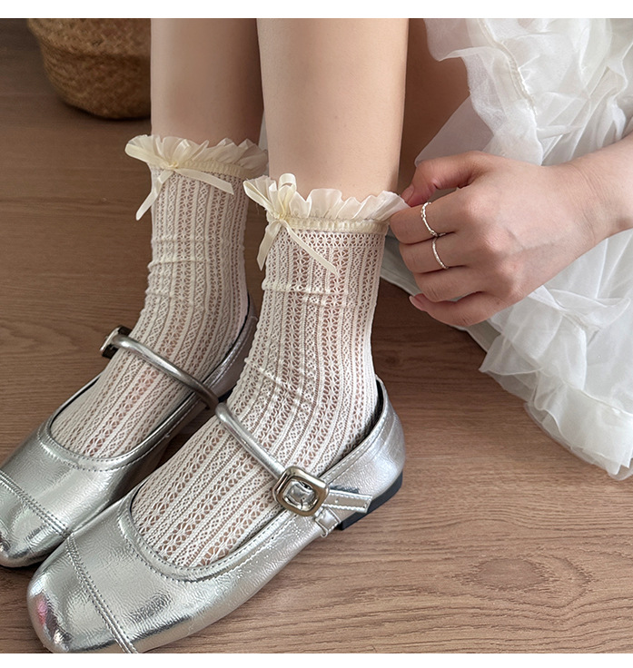 작은 가죽 신발 "여름 여성용 발레 스타일 레이스 양말 얇은 리본 miu 스타일 스택 스타킹 유백색