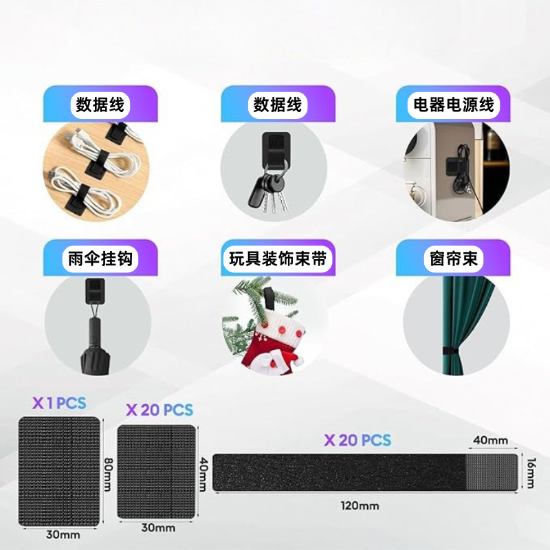 • 한 세트에는 30*80 후크 1개, 30*40 후크 20개, 120*16 양면 헤어 20개가 포함됩니다.