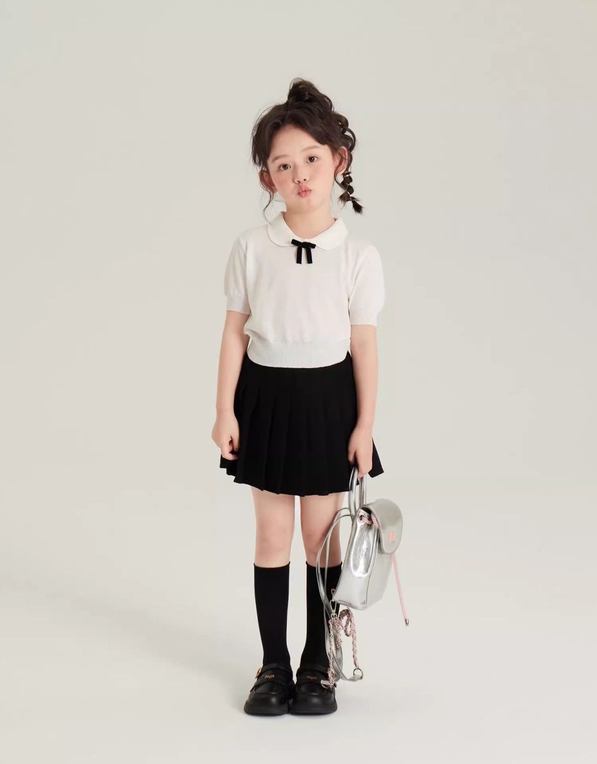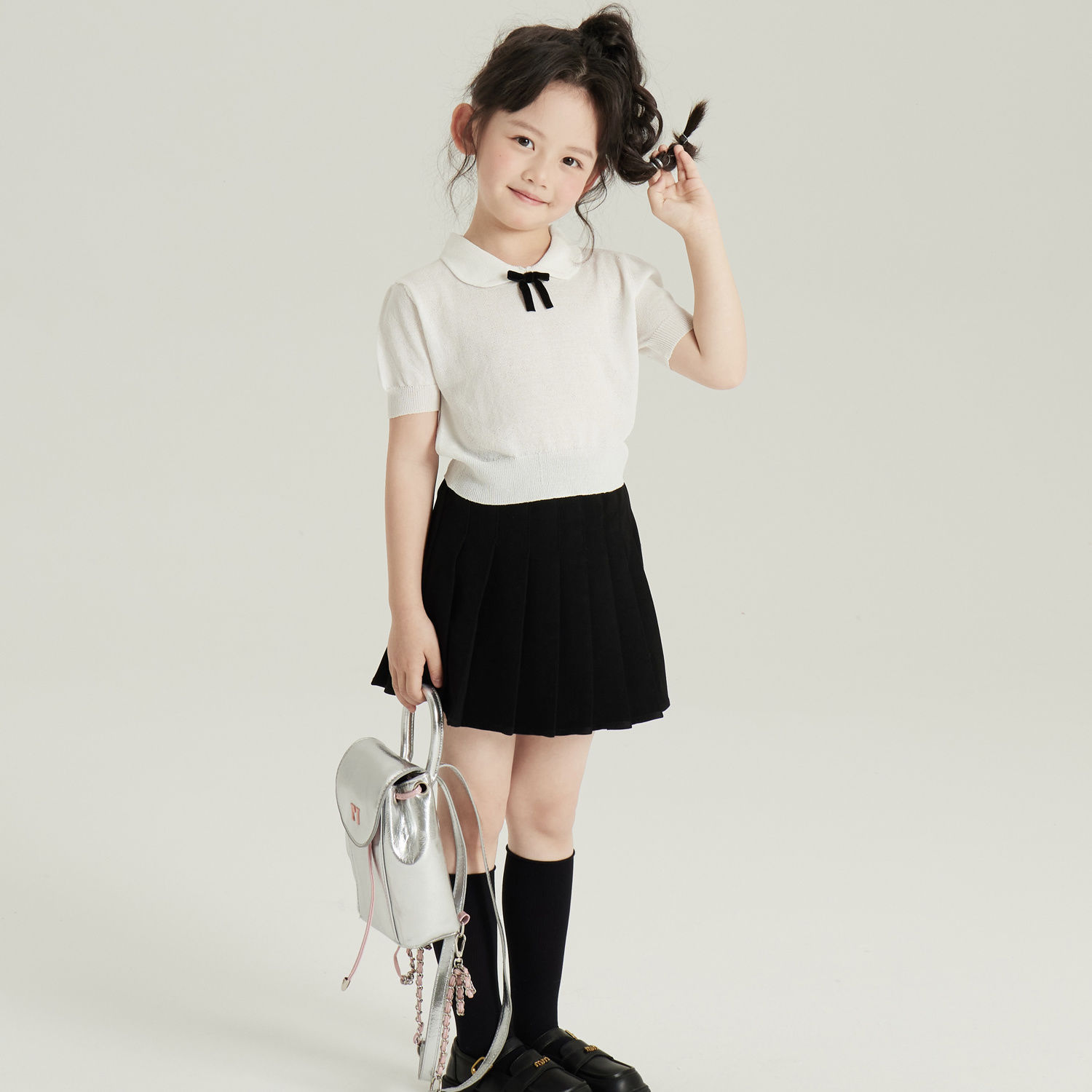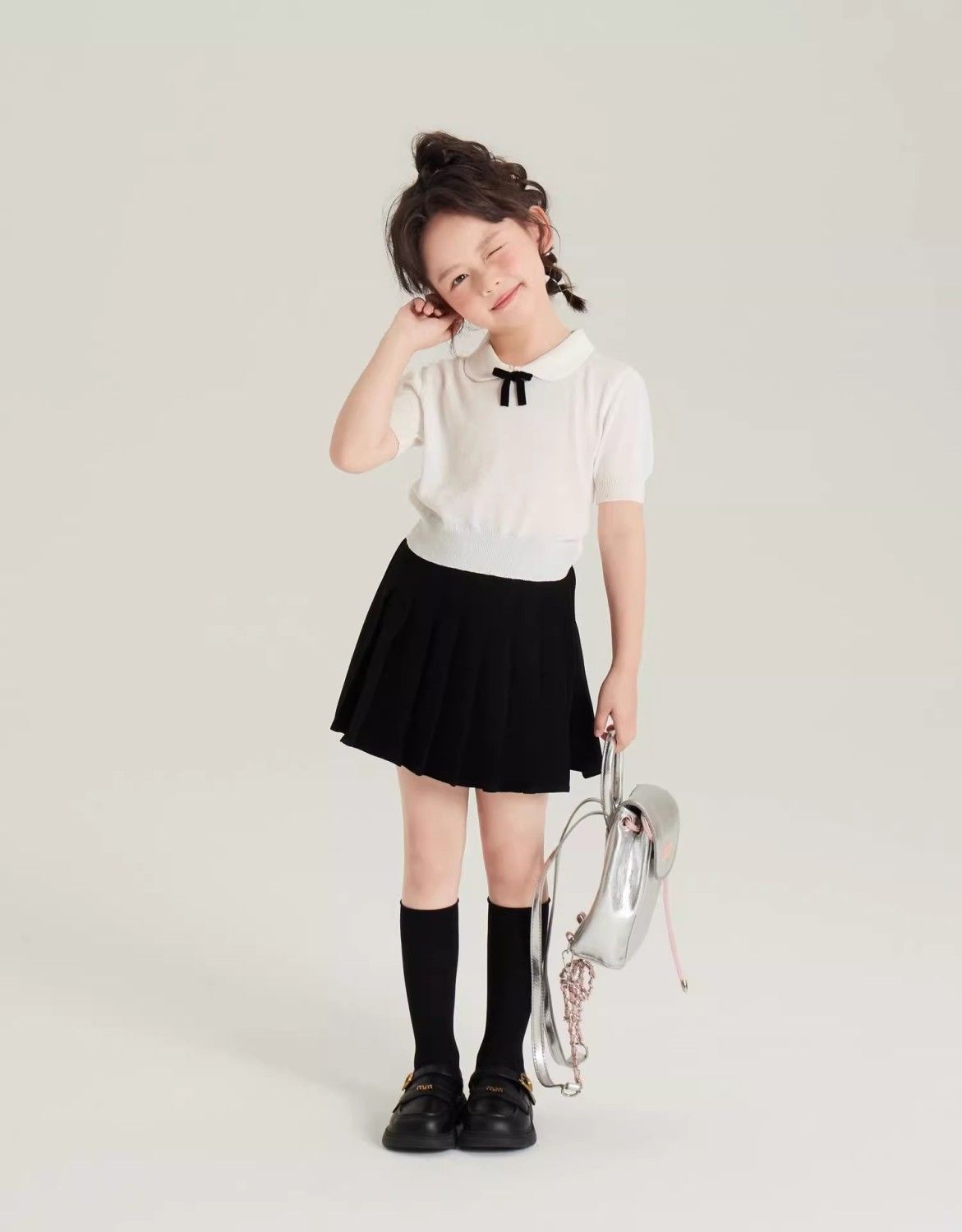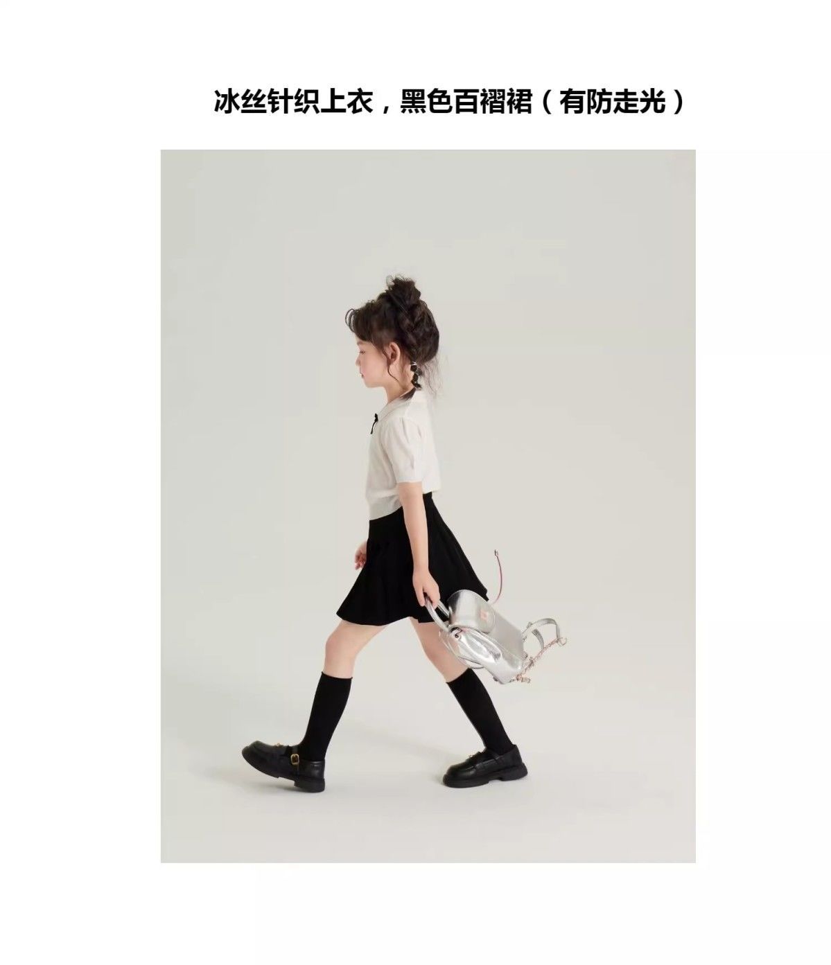 • 화이트 아이스 실크 스웨터 + 노출 방지 플리츠 스커트
