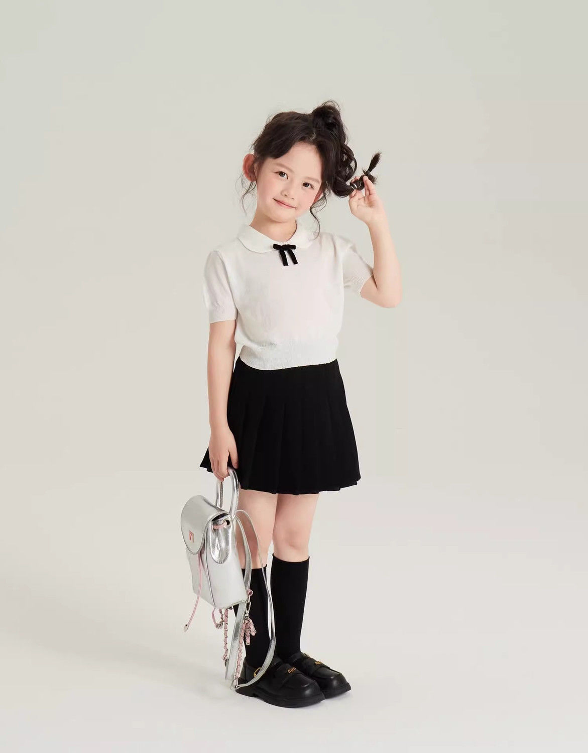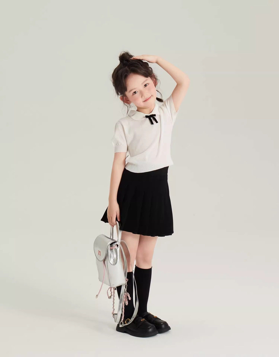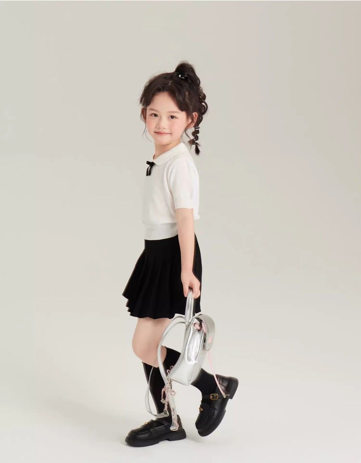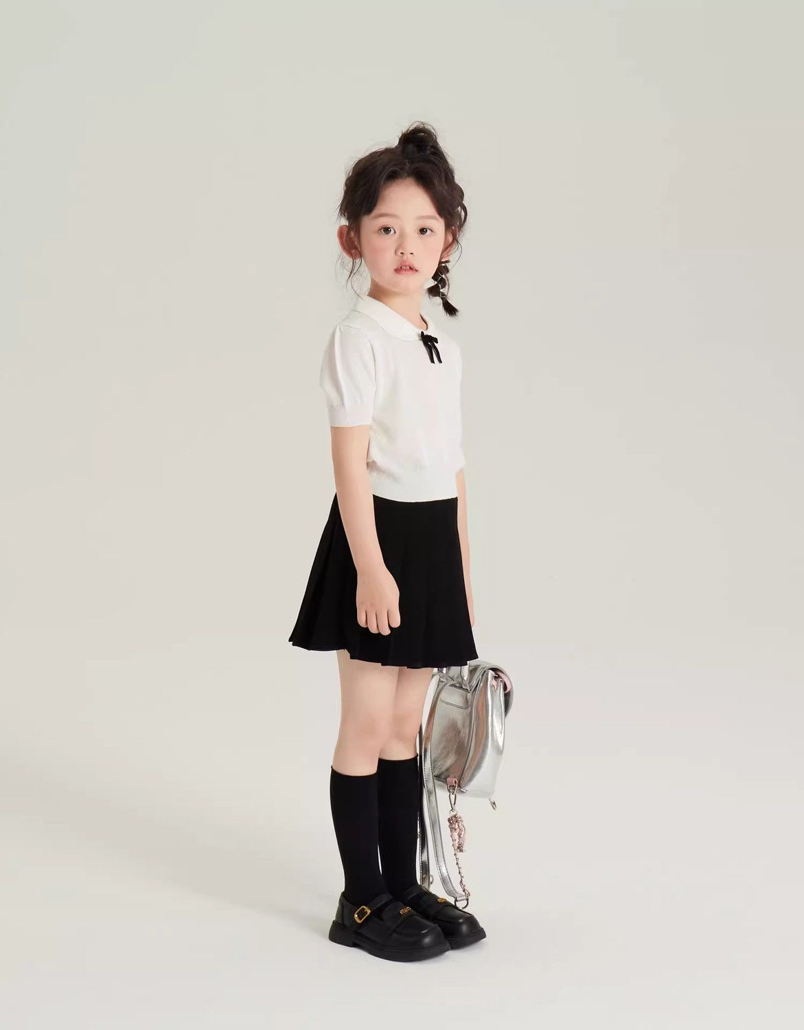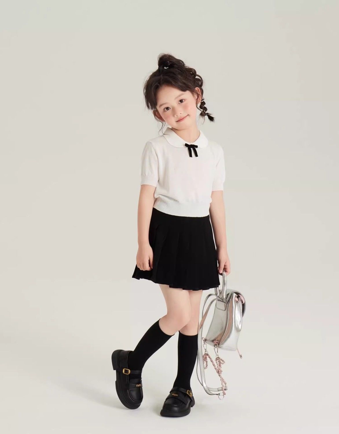 • 화이트 아이스 실크 스웨터 + 노출 방지 플리츠 스커트