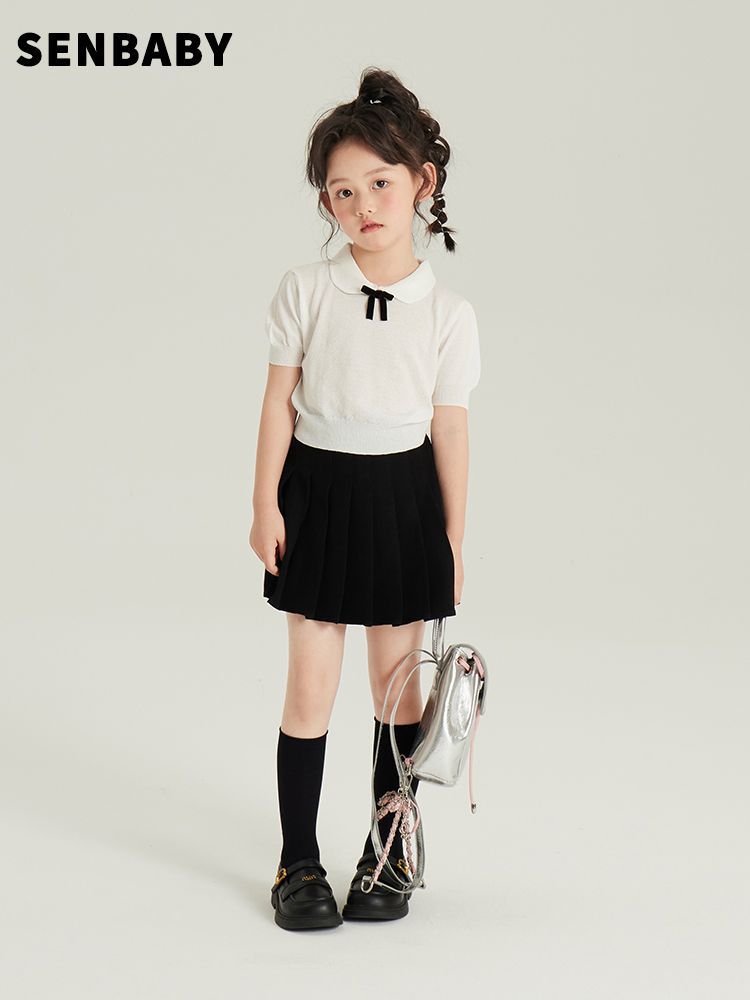 Senbaby 어린이 여름 반팔 중대형 아동 스타일 정장 소녀 얼음 실크 니트 탑 + 검은 주름 치마