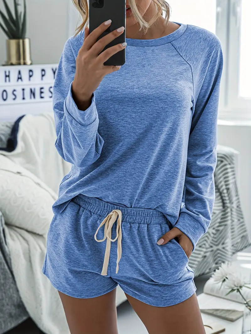 2025 유럽과 미국의 국경 여름 새로운 여성 단색 우아한 투피스 크루 넥 긴팔 반바지 홈 스포츠 세트