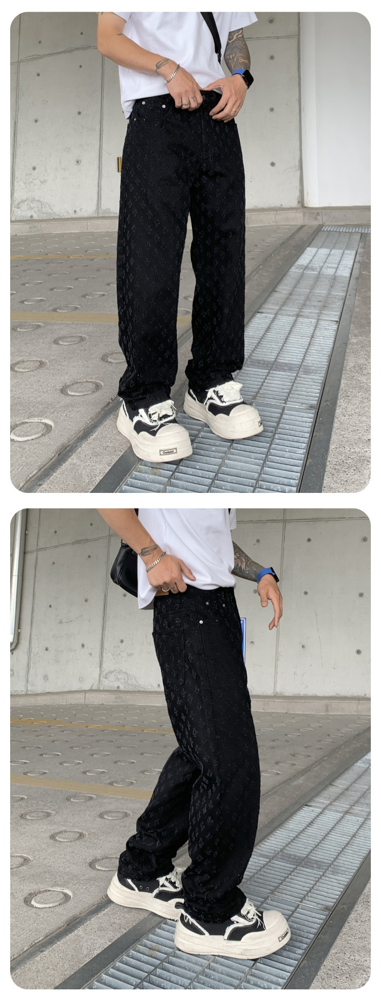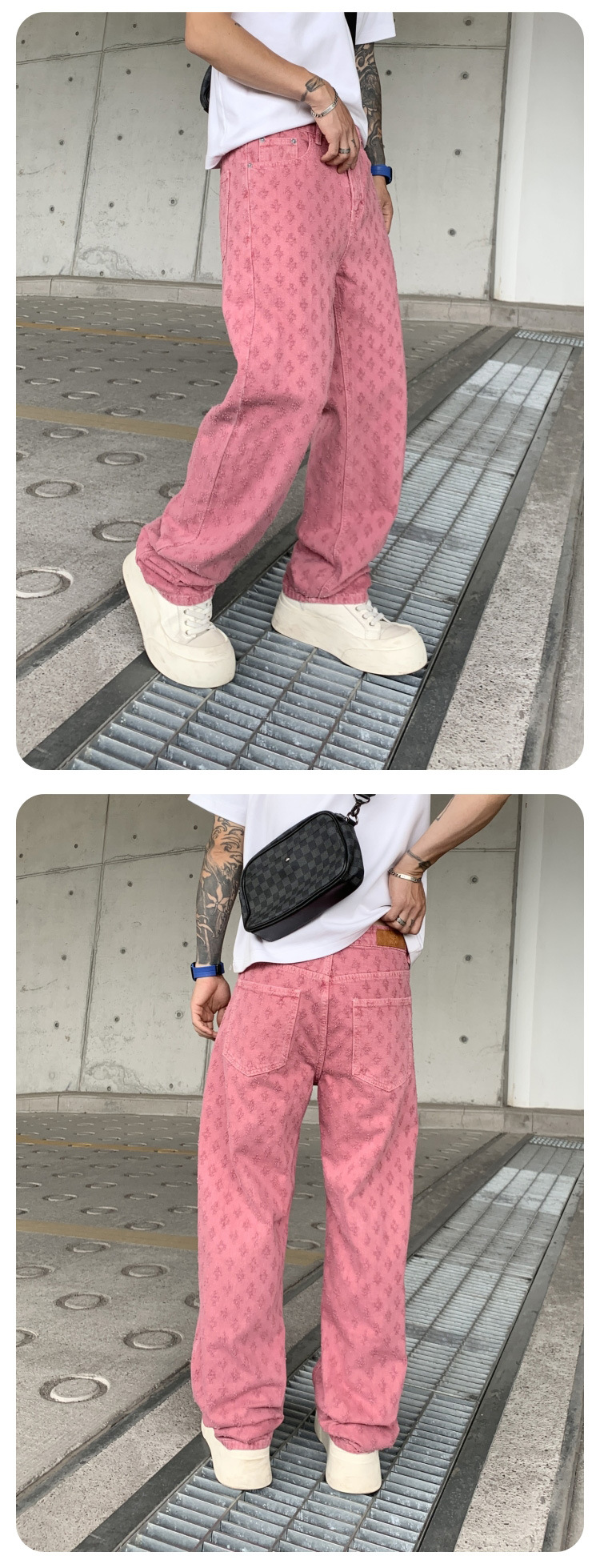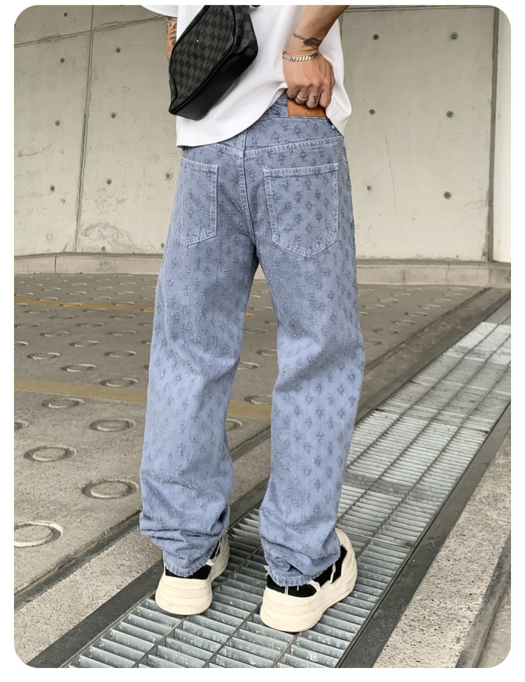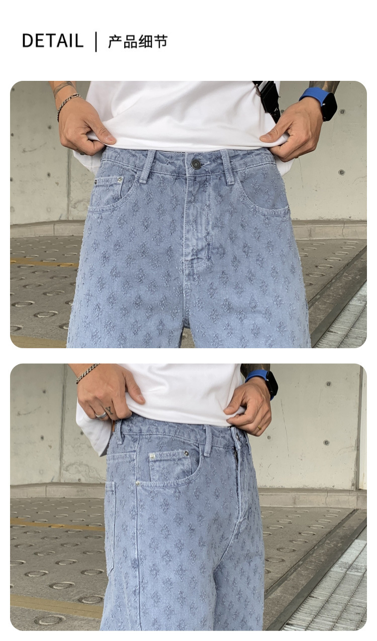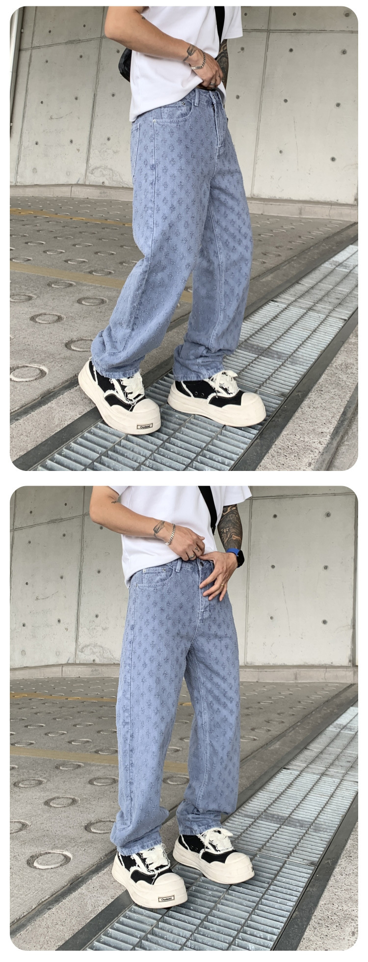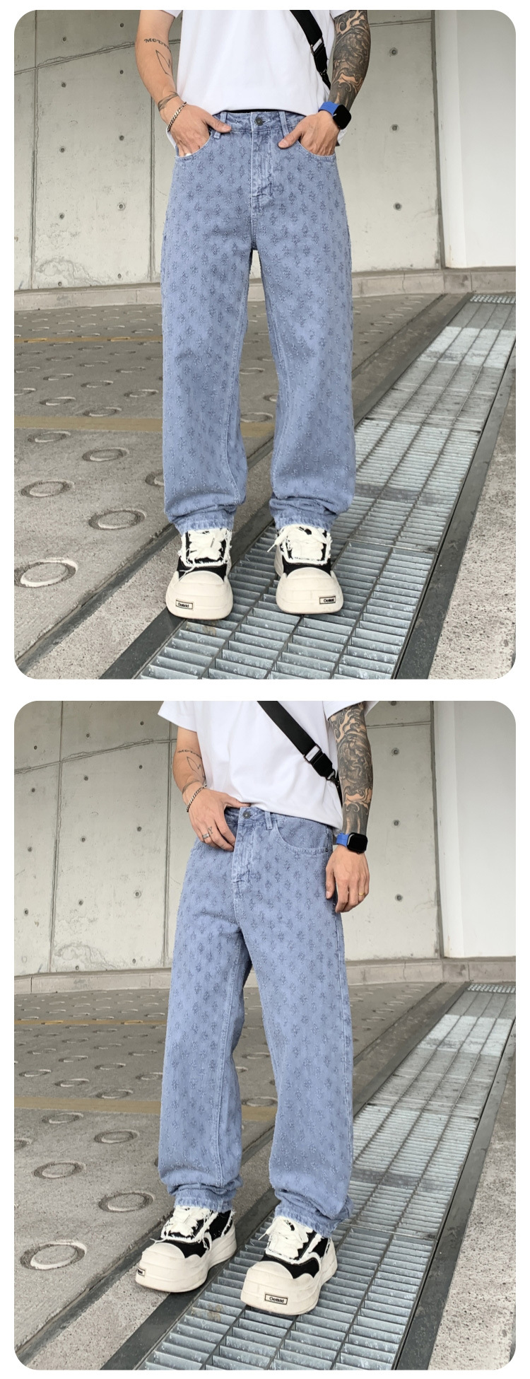 메인 추천 상품: 미국식 자카드 올오버 프린트 데님 팬츠, 남성용 여름 트렌디 브랜드 루즈핏 스트레이트 워싱 캐주얼 팬츠, 남성용 얇은 바지