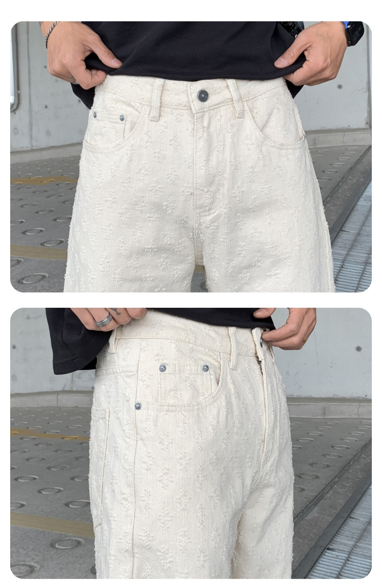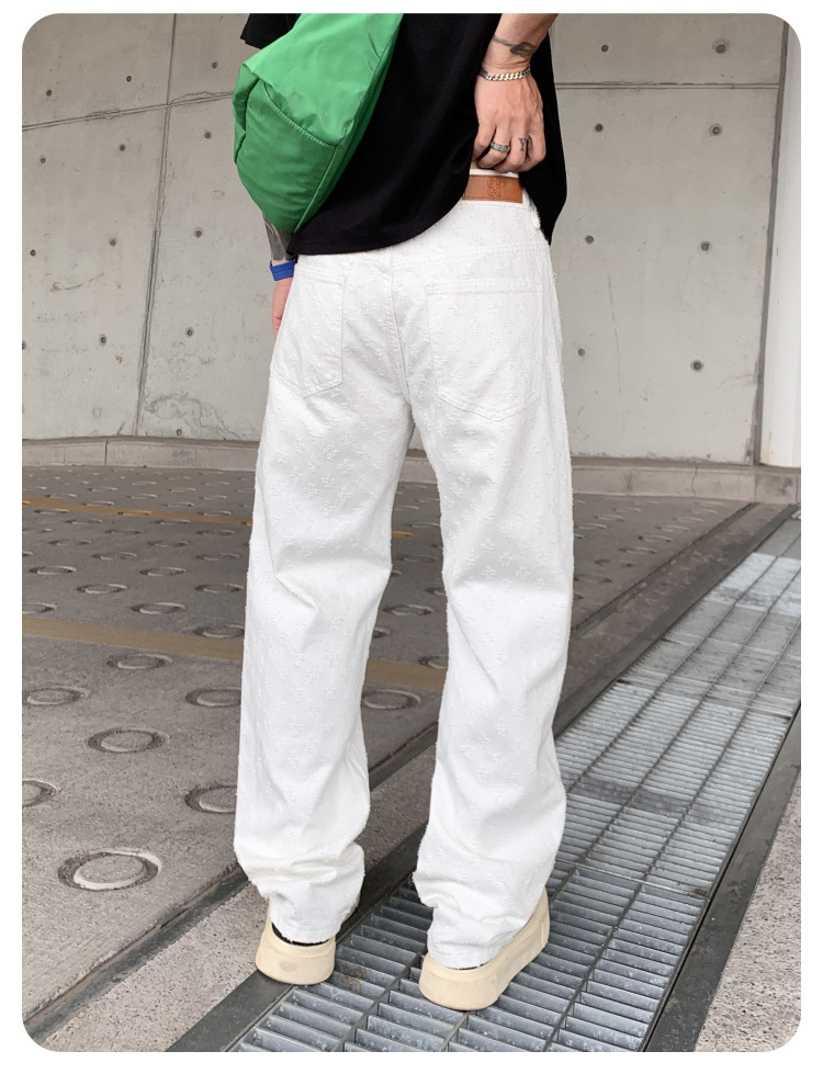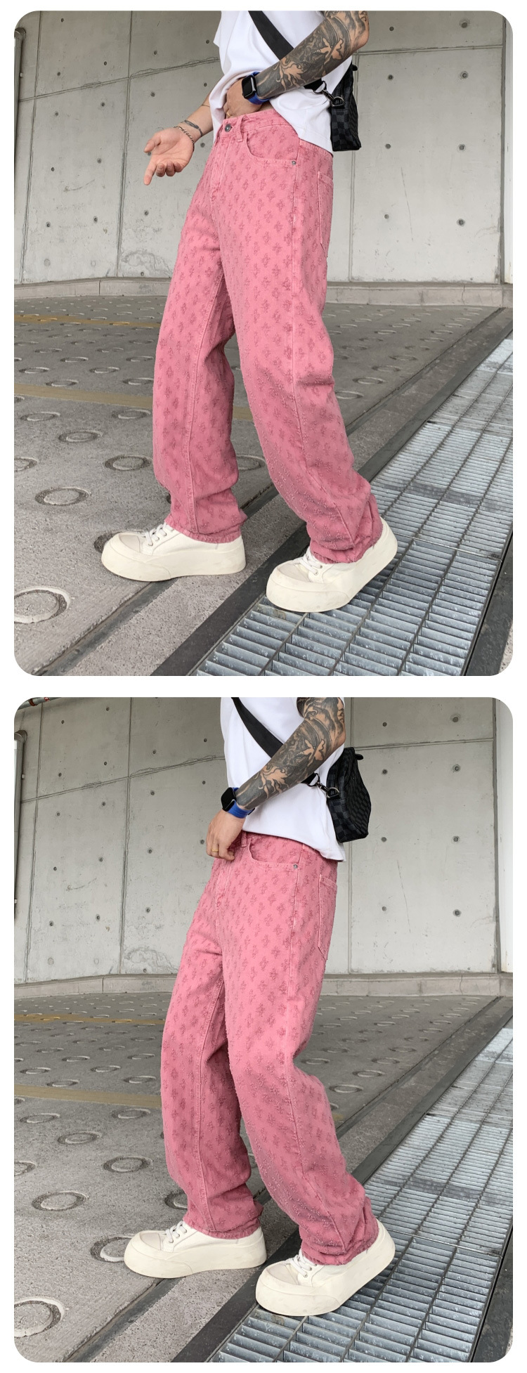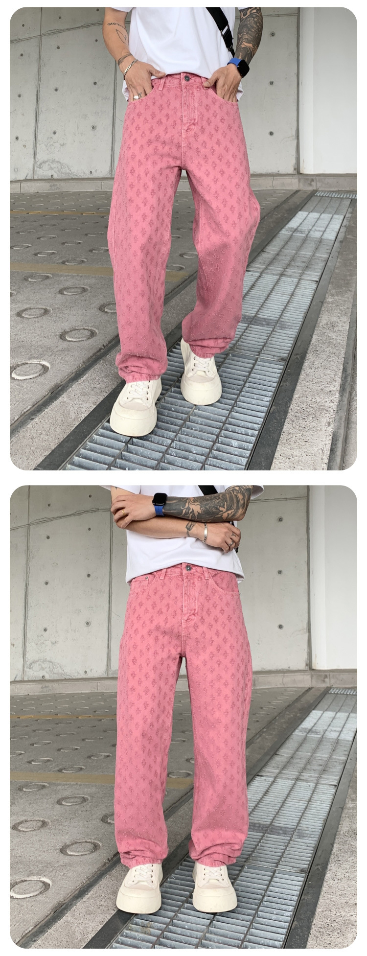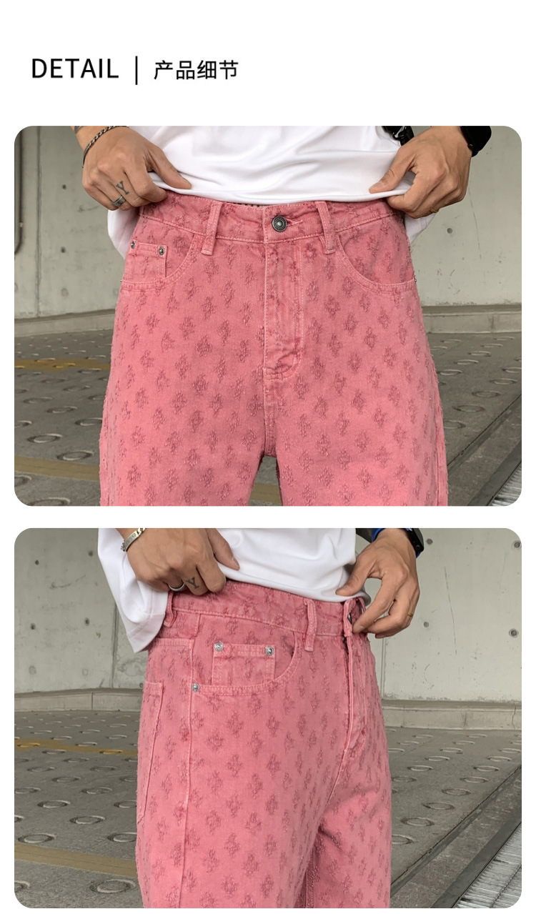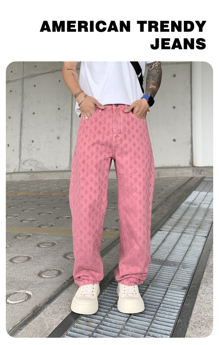 메인 추천 상품: 미국식 자카드 올오버 프린트 데님 팬츠, 남성용 여름 트렌디 브랜드 루즈핏 스트레이트 워싱 캐주얼 팬츠, 남성용 얇은 바지