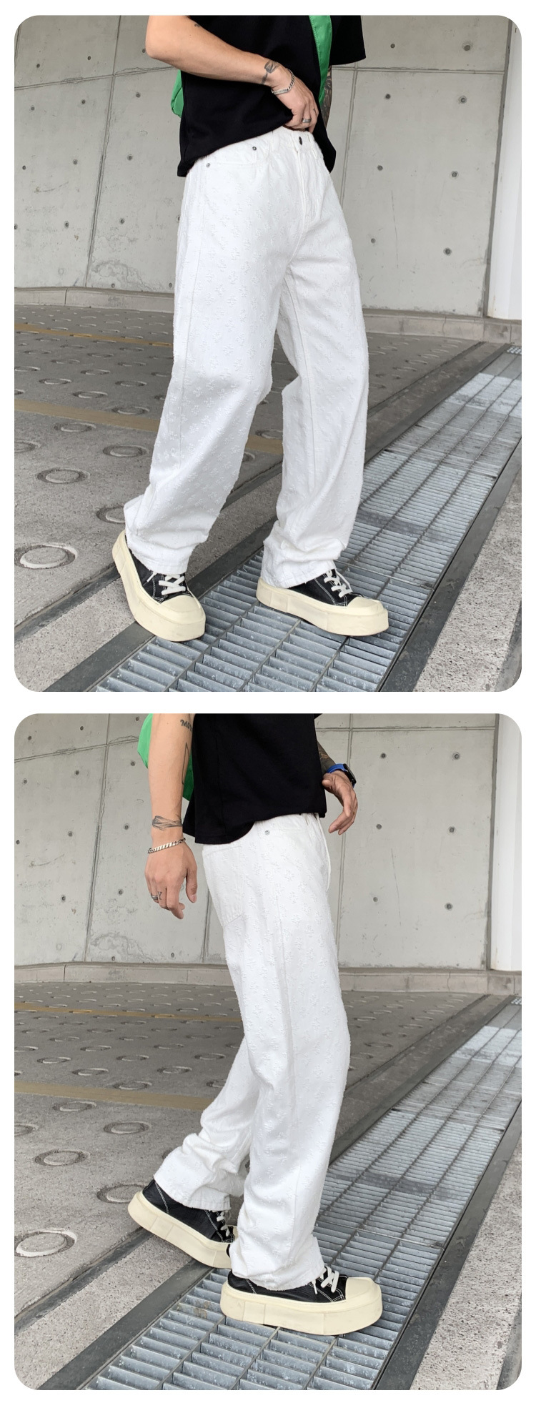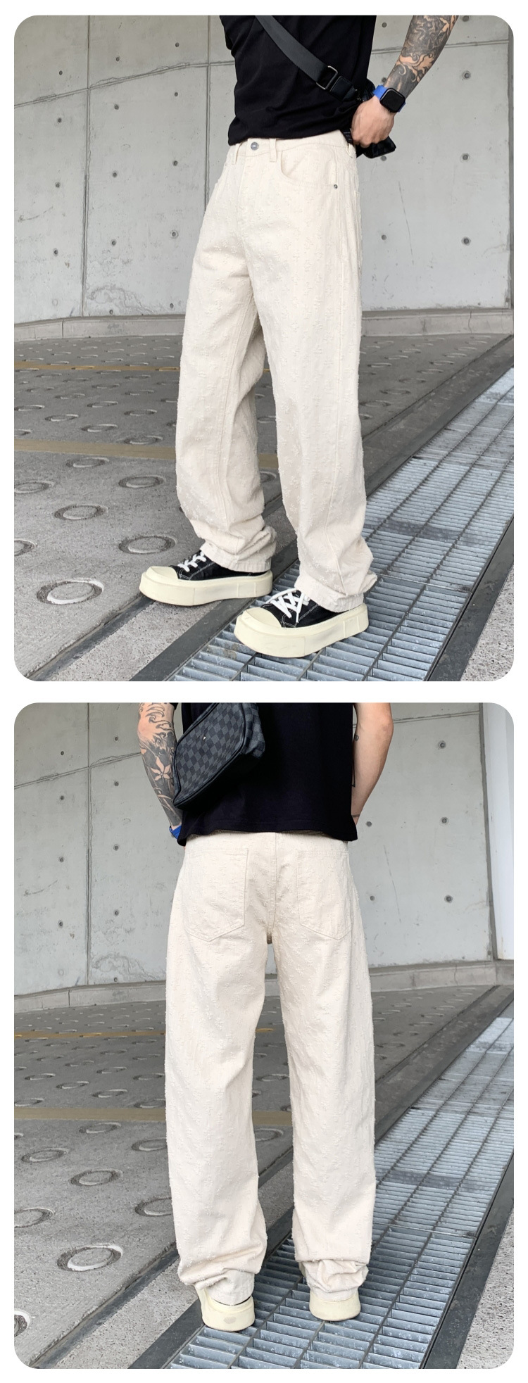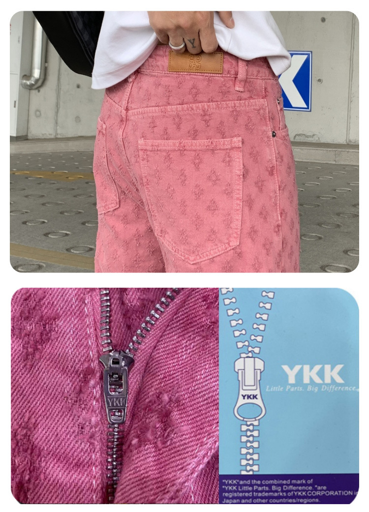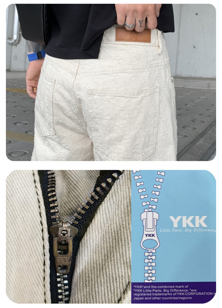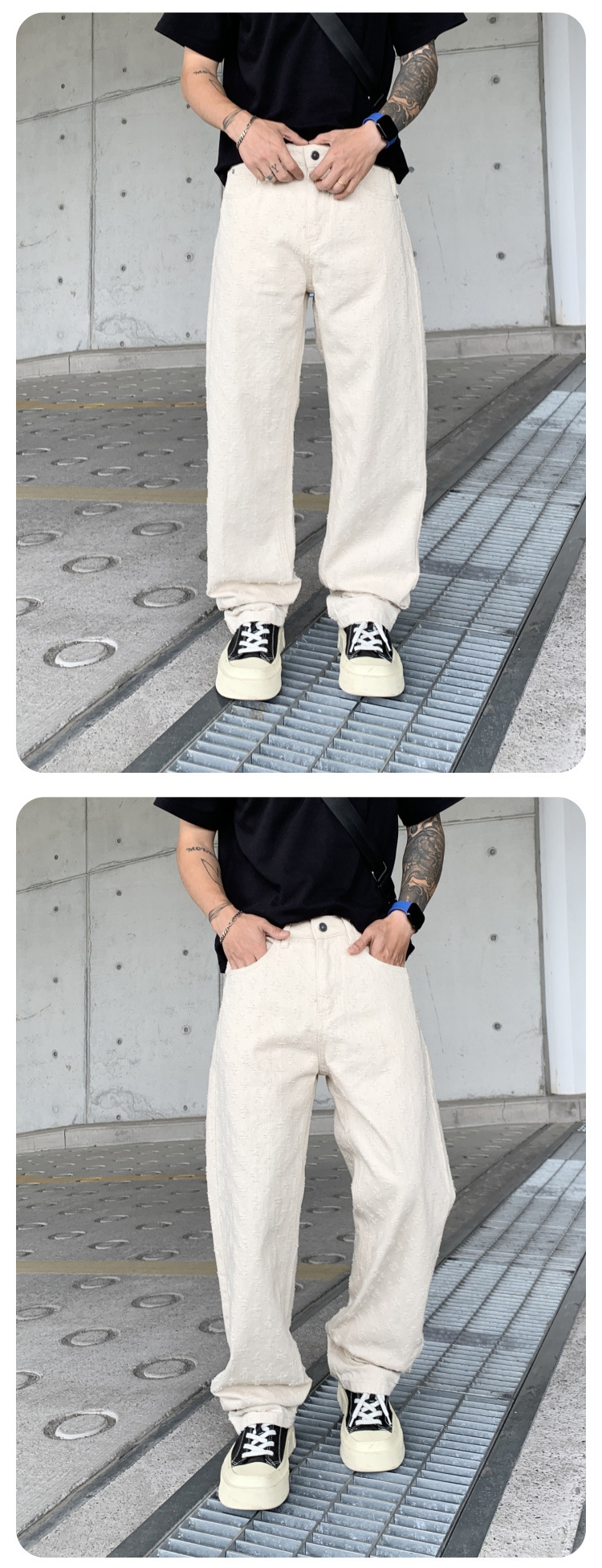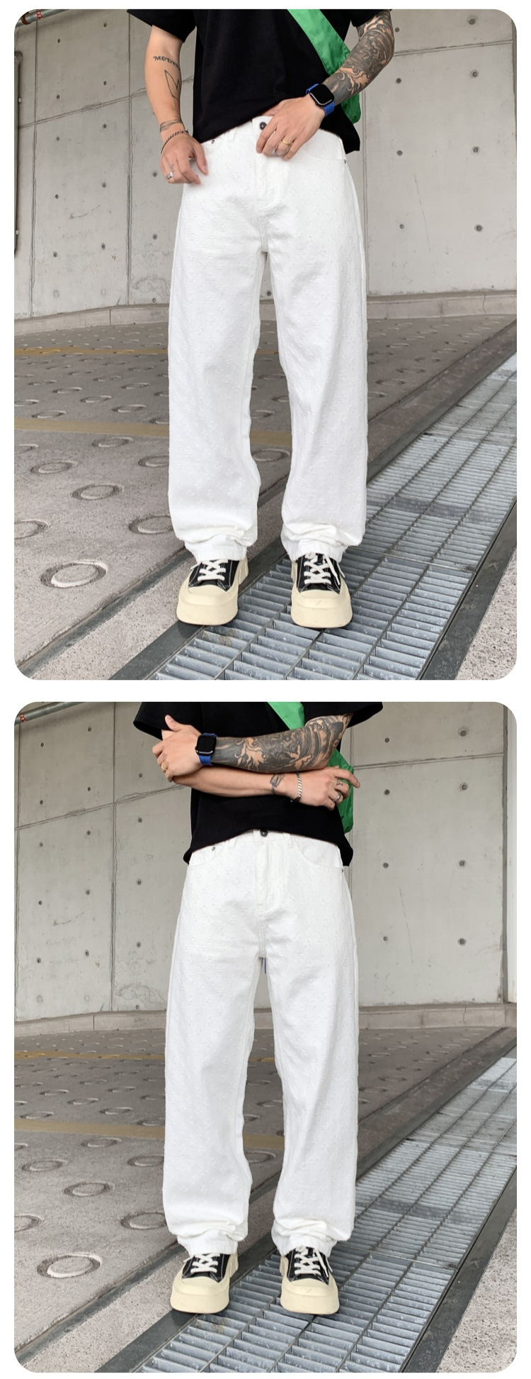 메인 추천 상품: 미국식 자카드 올오버 프린트 데님 팬츠, 남성용 여름 트렌디 브랜드 루즈핏 스트레이트 워싱 캐주얼 팬츠, 남성용 얇은 바지