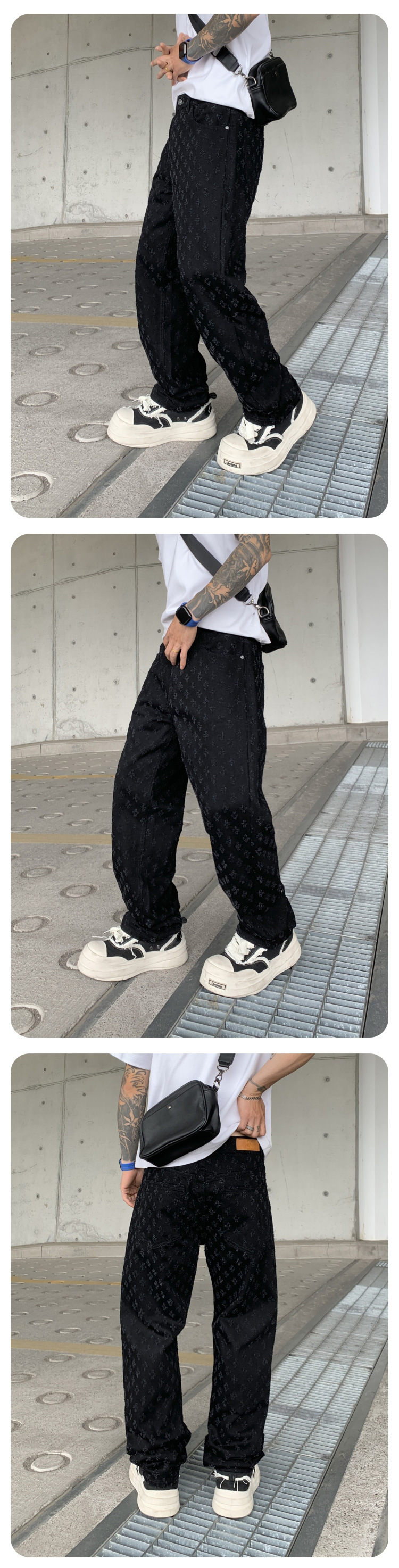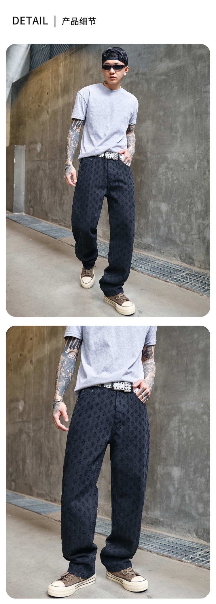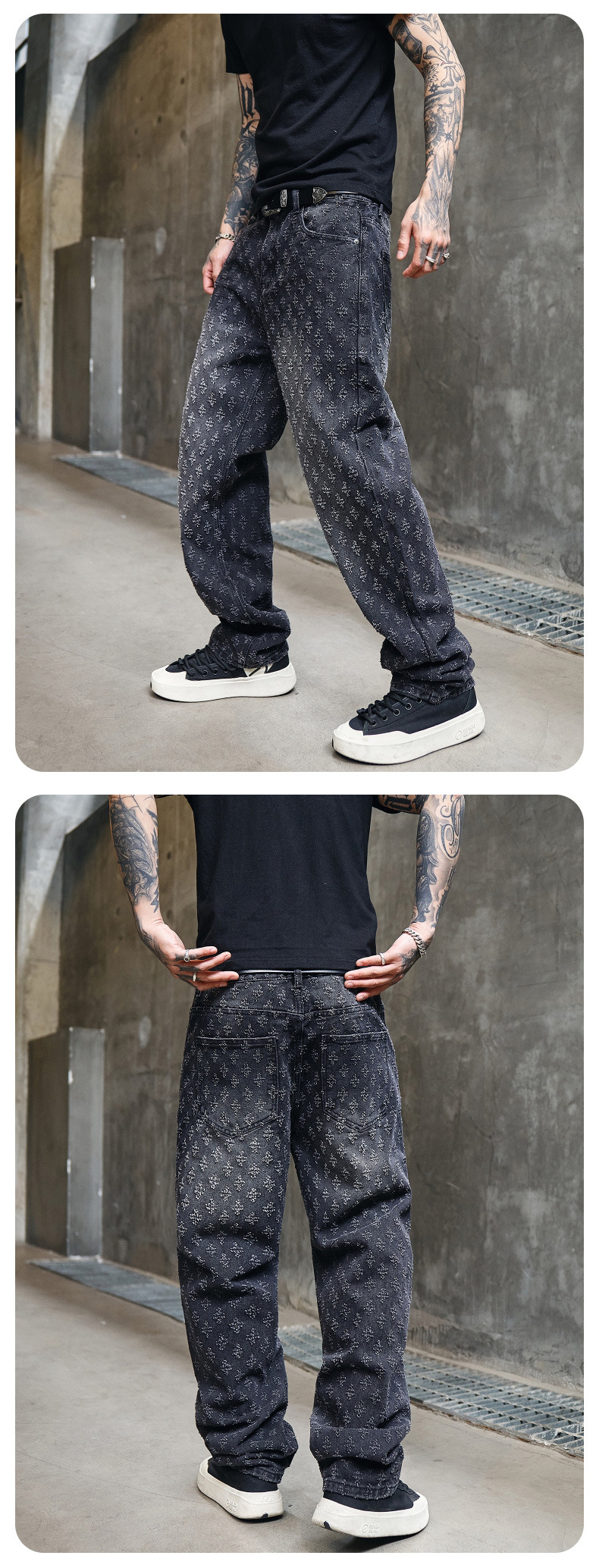 메인 추천 상품: 미국식 자카드 올오버 프린트 데님 팬츠, 남성용 여름 트렌디 브랜드 루즈핏 스트레이트 워싱 캐주얼 팬츠, 남성용 얇은 바지스토어 가기