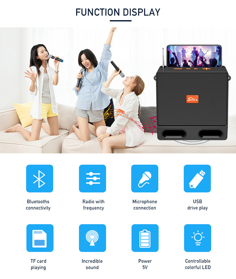 Function: Bluetooth, FM, USB, TF, MIC, DC charging dock