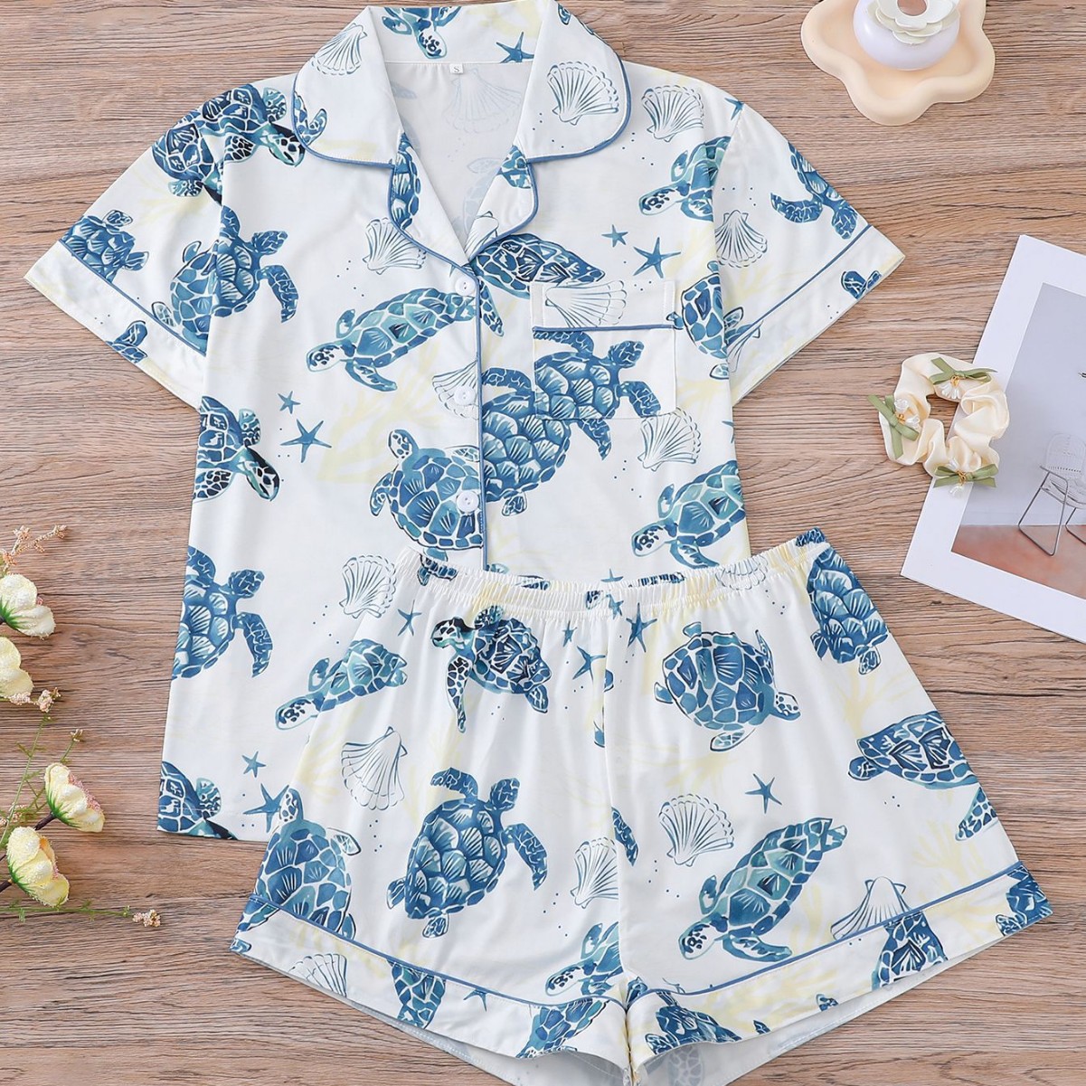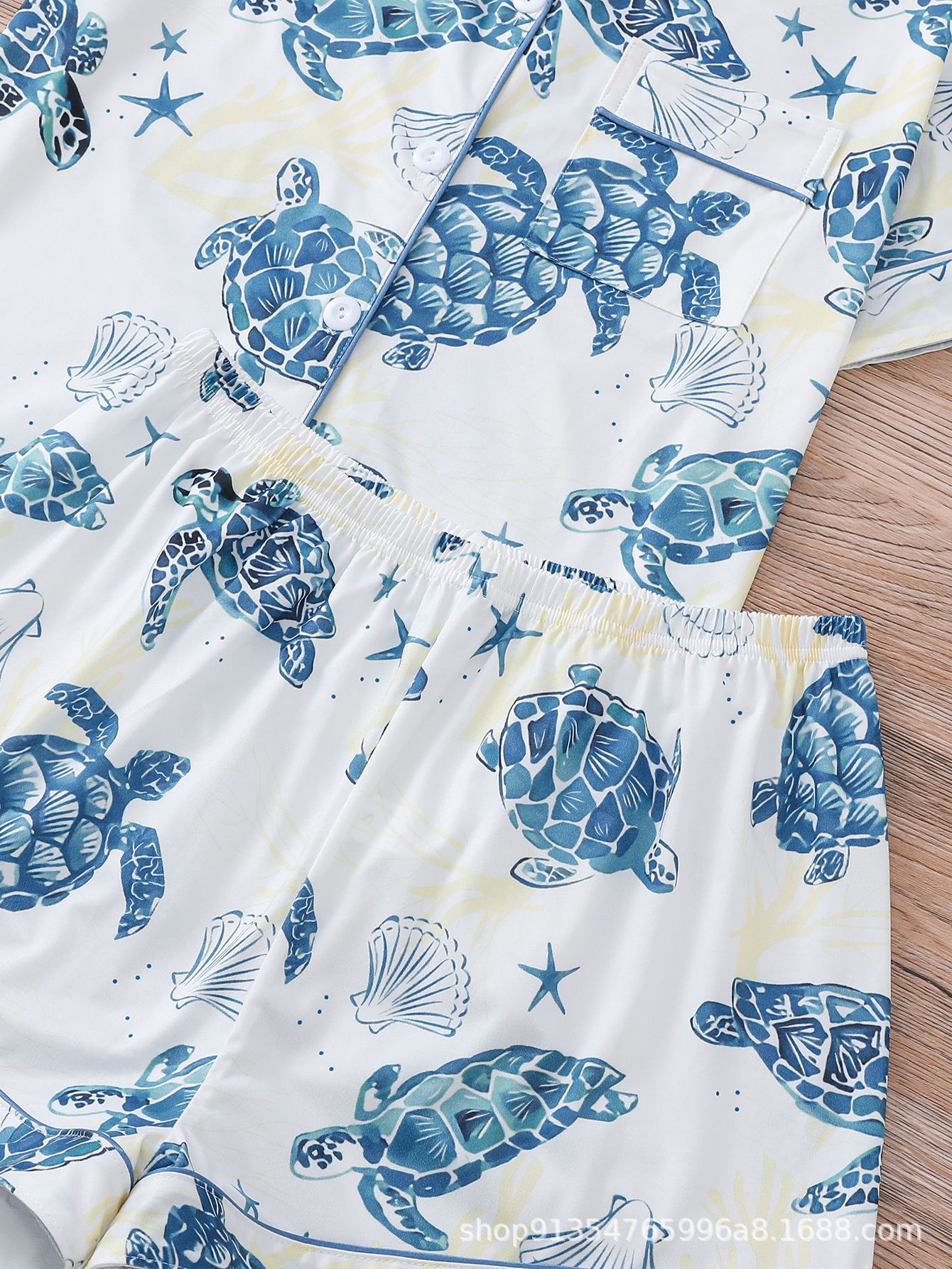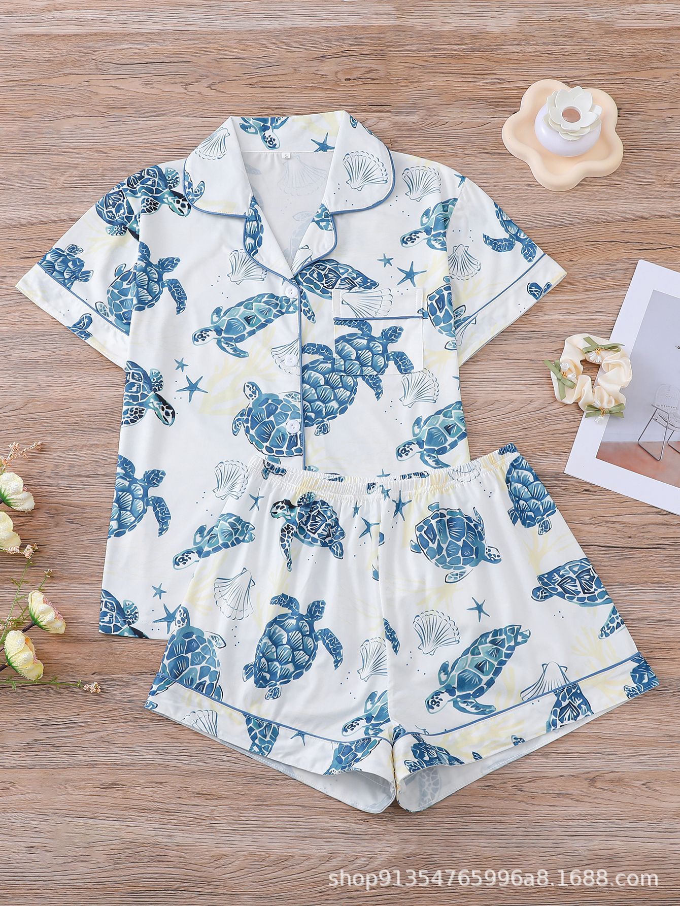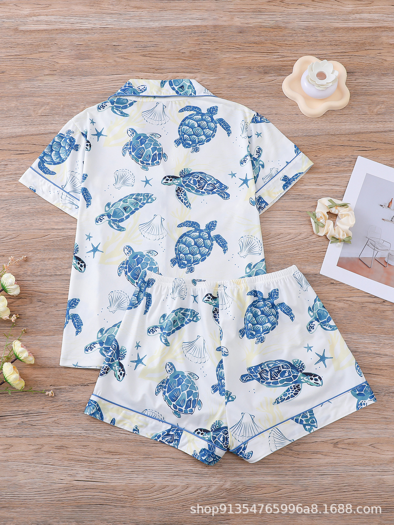 국경 간 대외 무역 폭발 여성 잠옷 사계절 거북이 인쇄 된 옷깃 짧은 소매 반바지 유럽과 미국의 가정 의류 세트