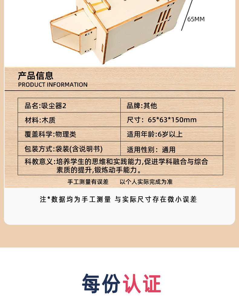 어린이 과학 실험 교육 장난감 초등학생을위한 수제 나무 수제 DIY 진공 청소기 기술 생산 재료