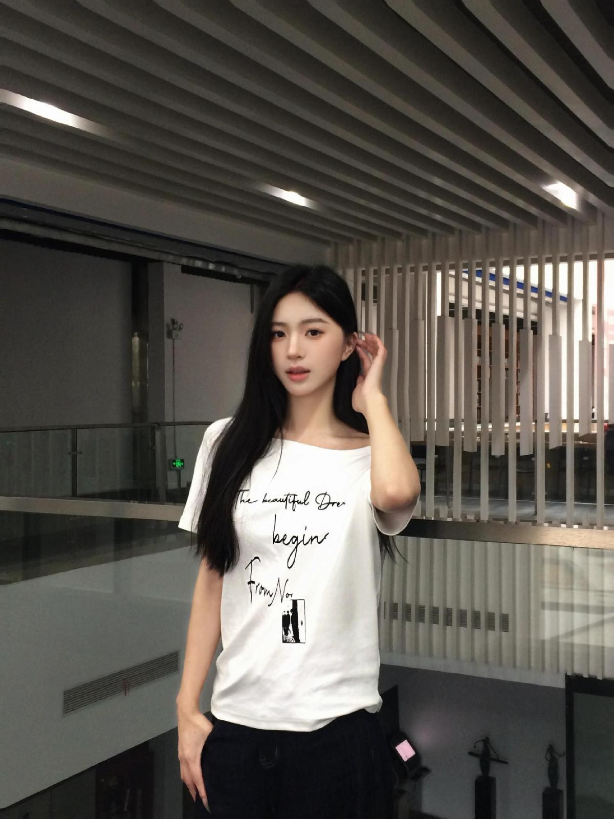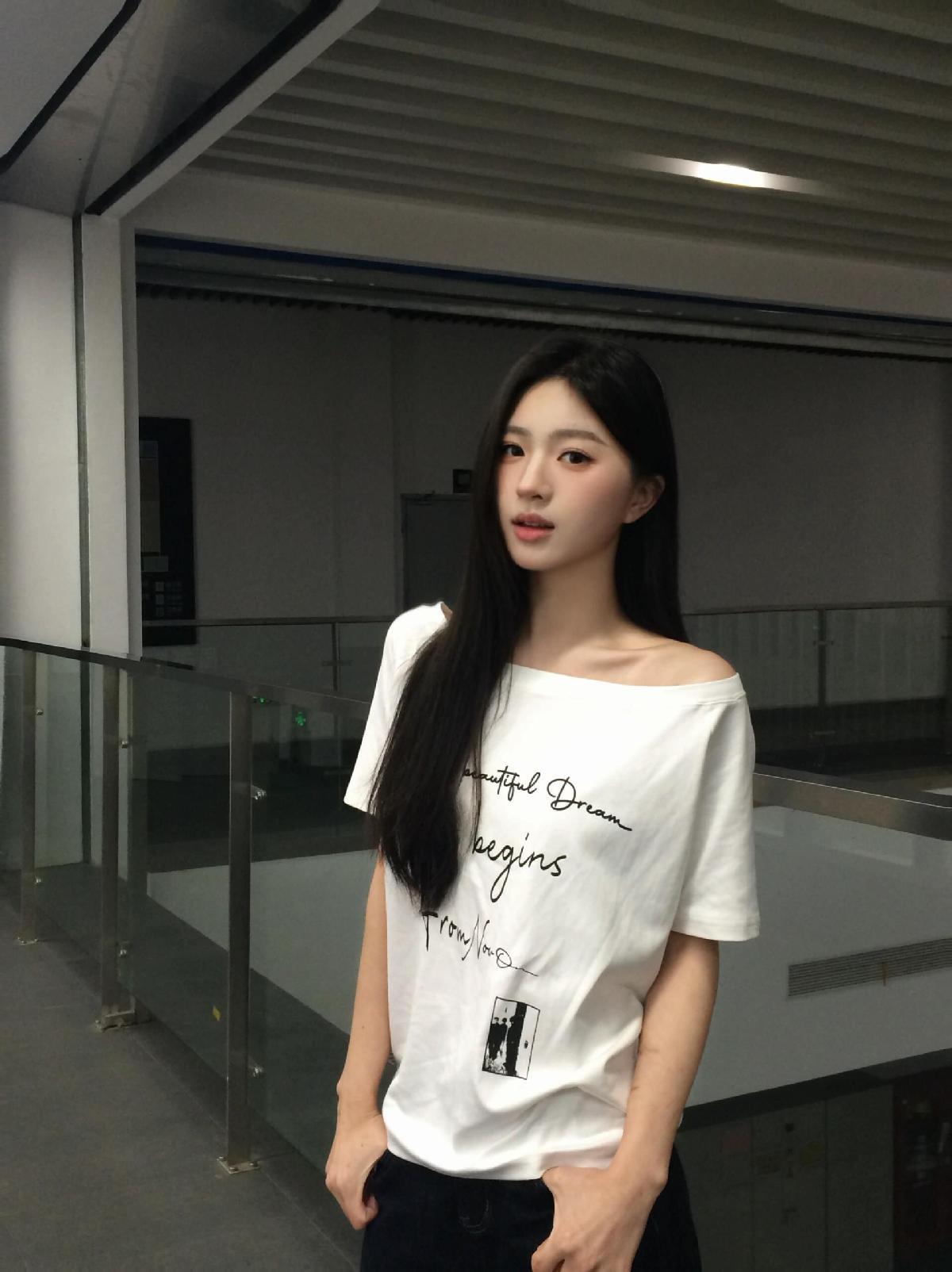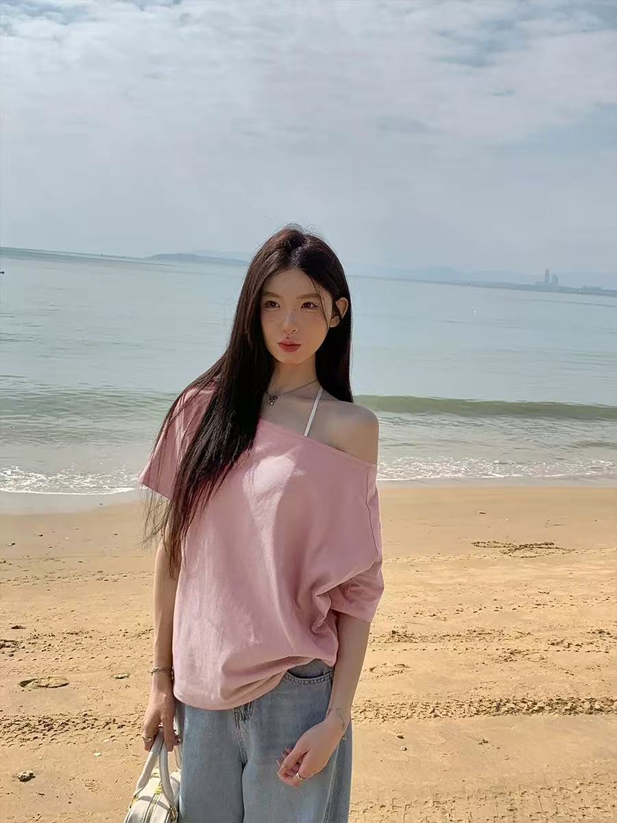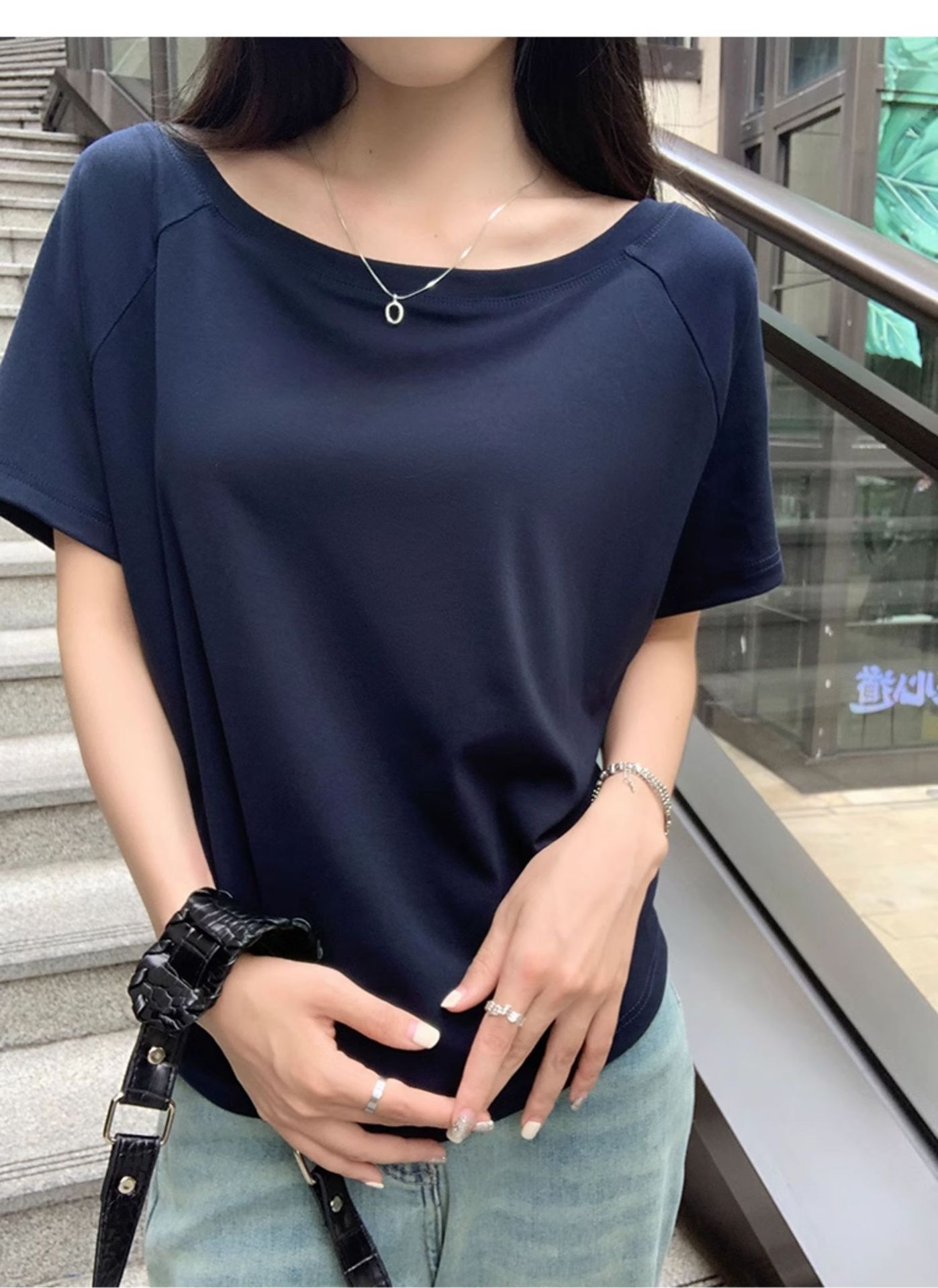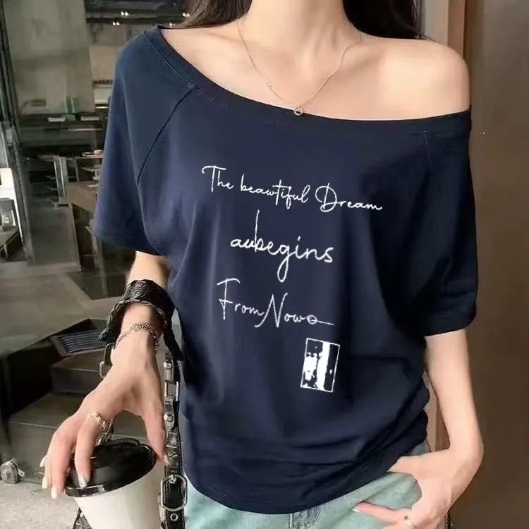 미국 복고풍 네이비 블루 문자 인쇄 기울어 진 어깨 반팔 오른쪽 어깨 티셔츠 여성 여름 느슨한 독특하고 아름다운 탑스토어 가기
