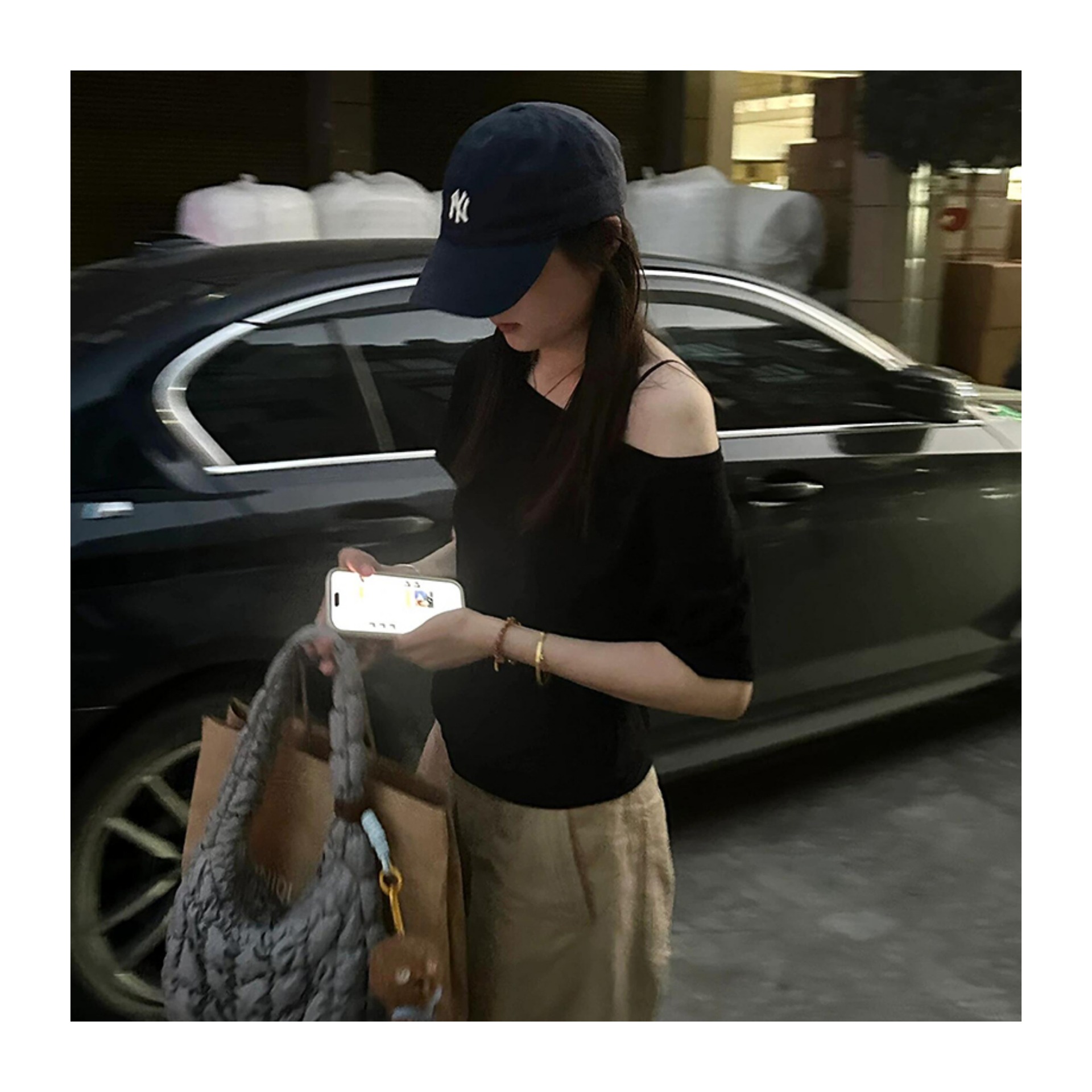 • 오프숄더 티셔츠 순면-네이비블루 KT캣