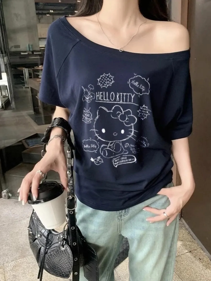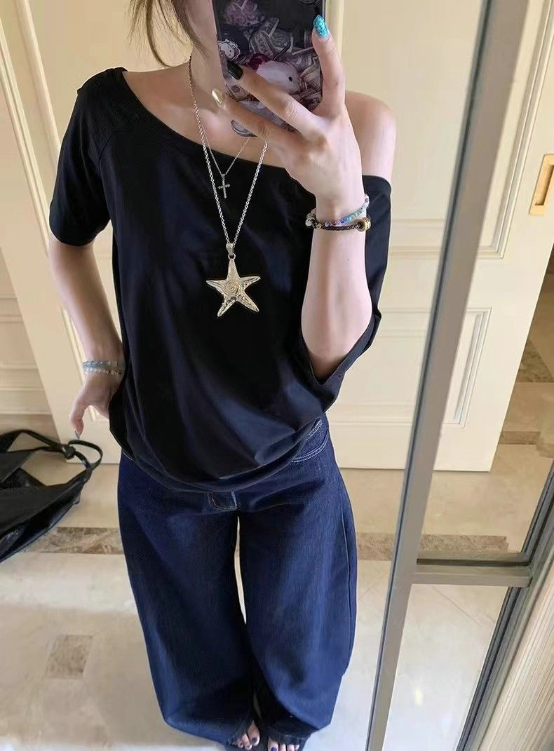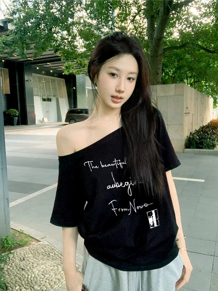 미국 복고풍 네이비 블루 문자 인쇄 기울어 진 어깨 반팔 오른쪽 어깨 티셔츠 여성 여름 느슨한 독특하고 아름다운 탑