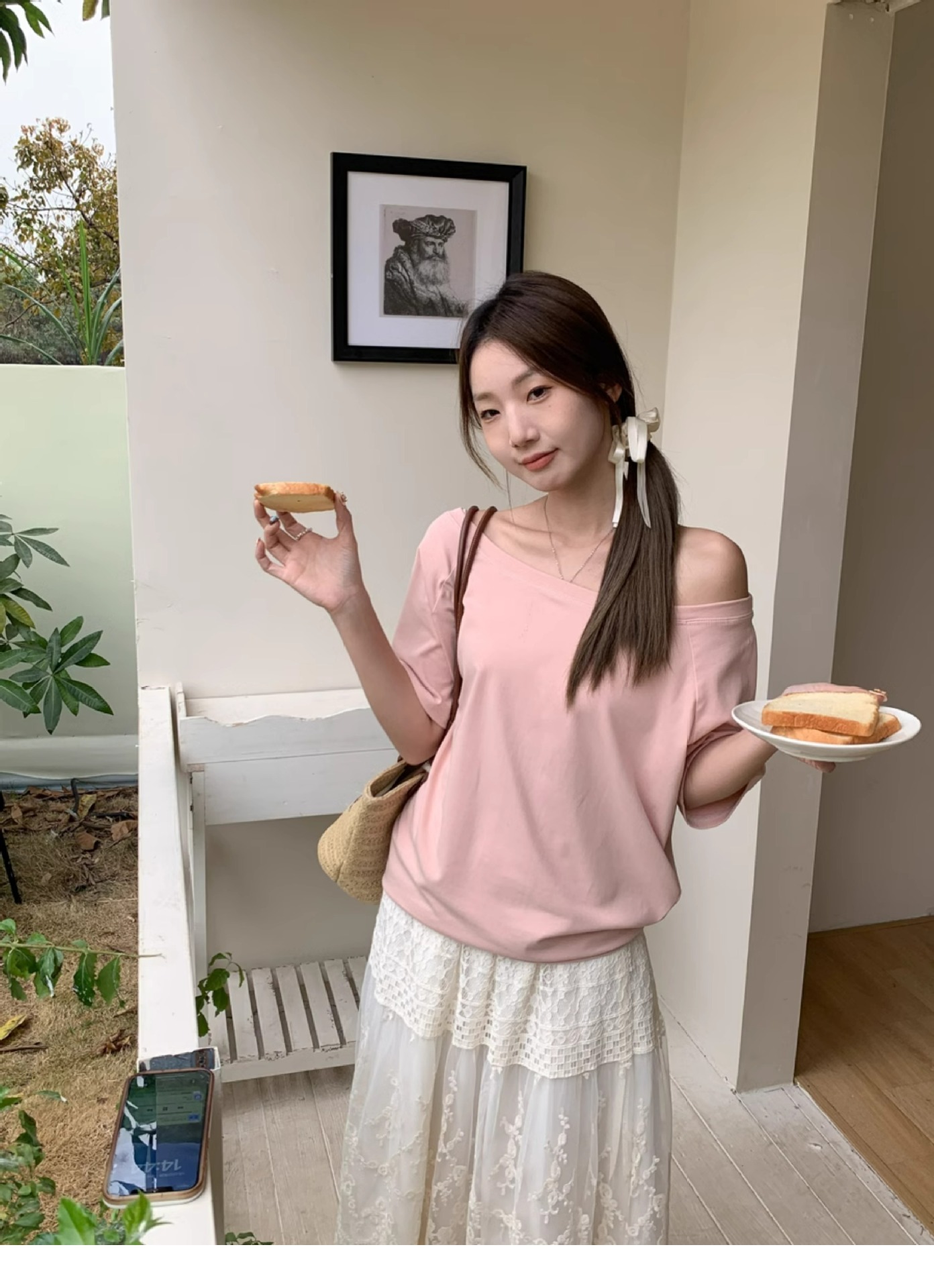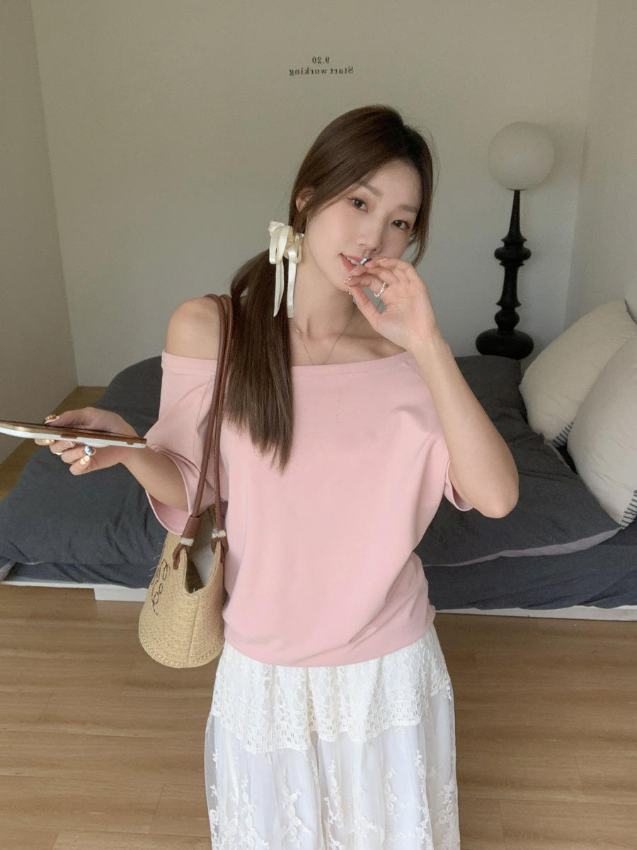 • 오프숄더 티셔츠 코튼 화이트 룬