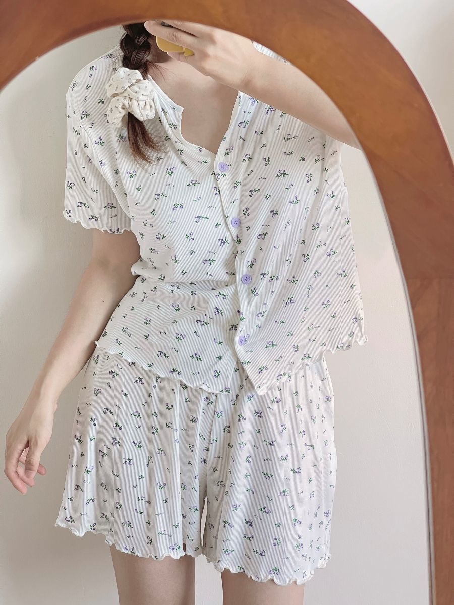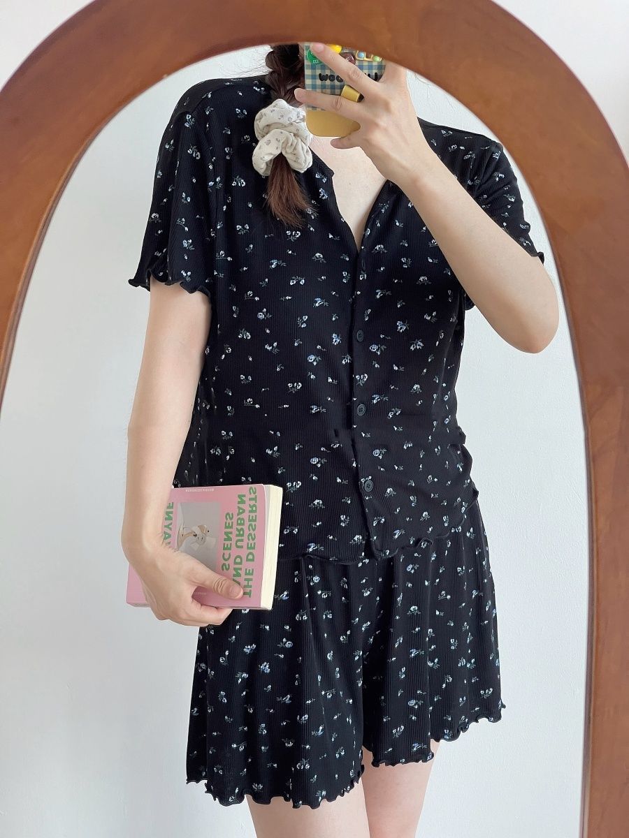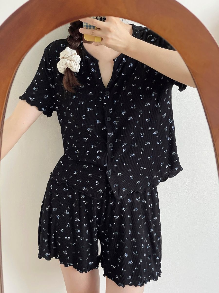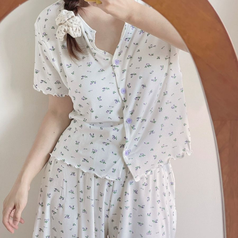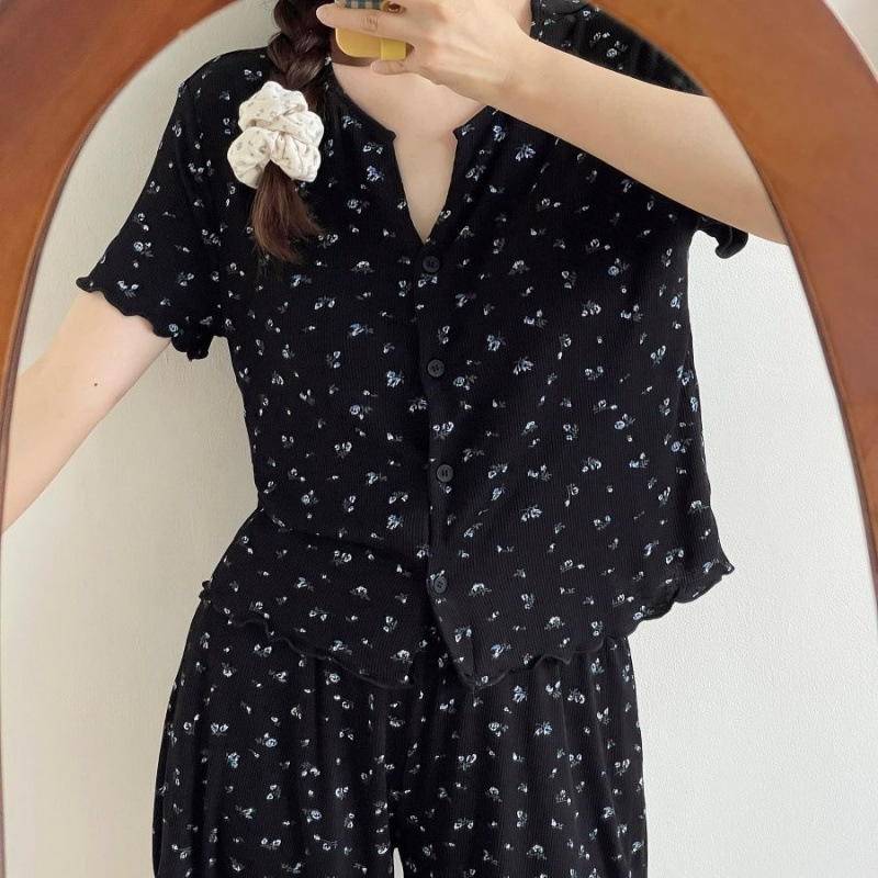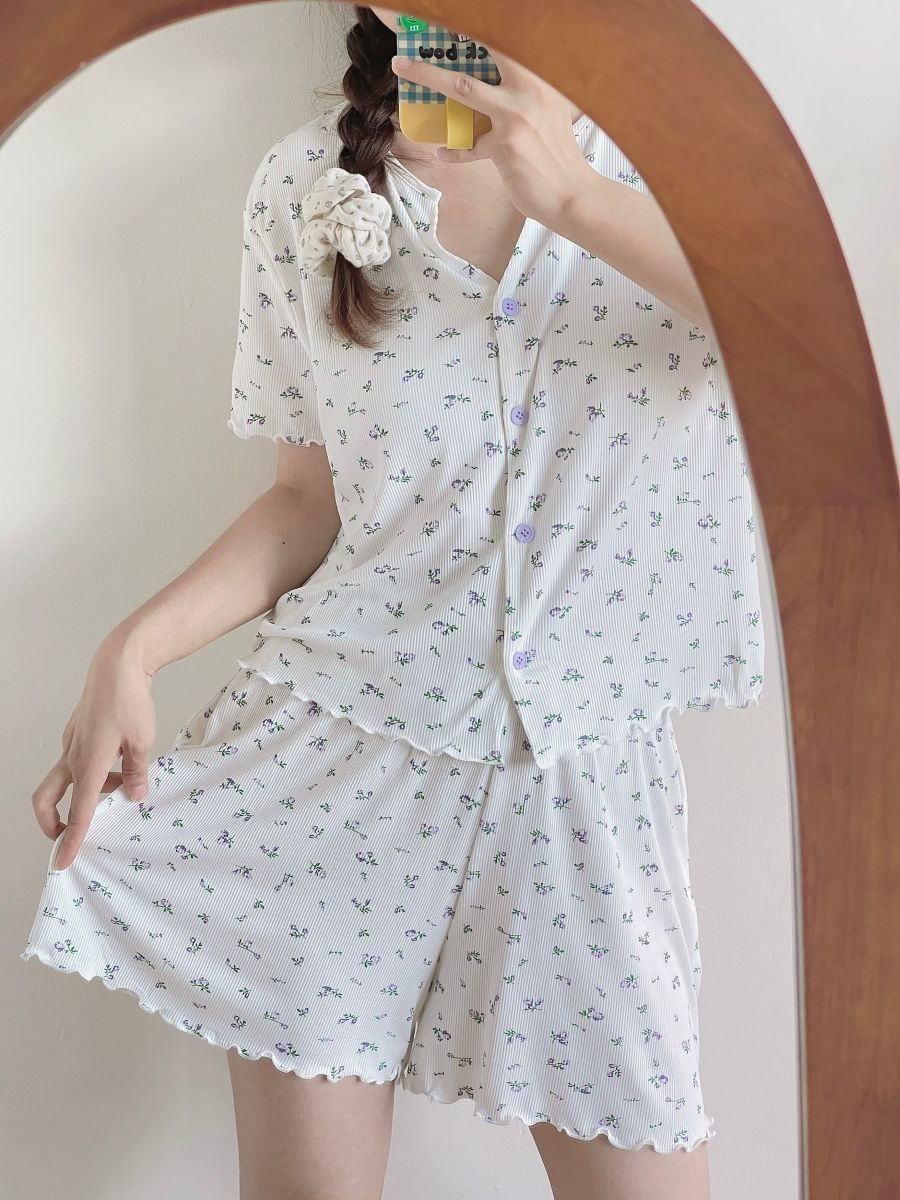 150kg 플러스 사이즈 한국 bm 스타일 작은 꽃 여름 얇은 뚱뚱한 mm 반팔 반바지 잠옷 여성용 홈웨어 세트