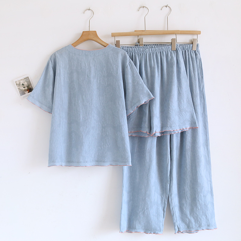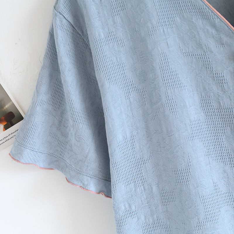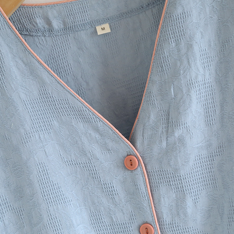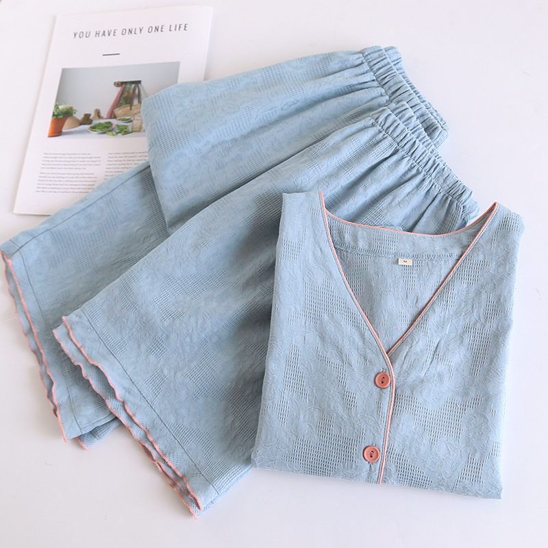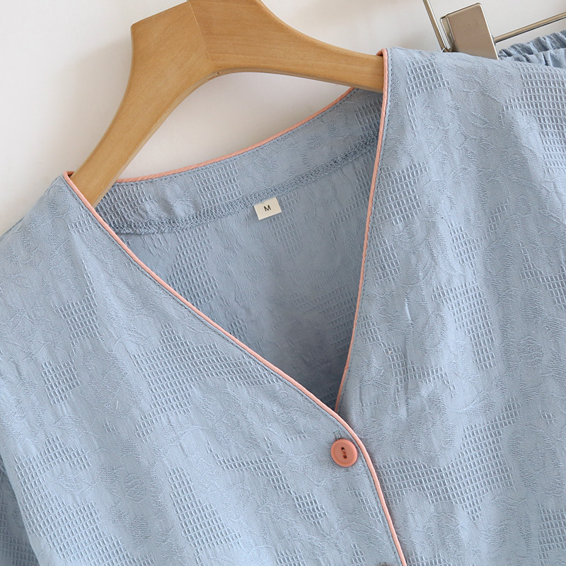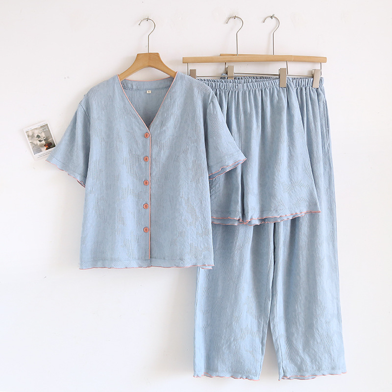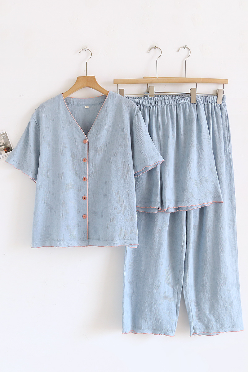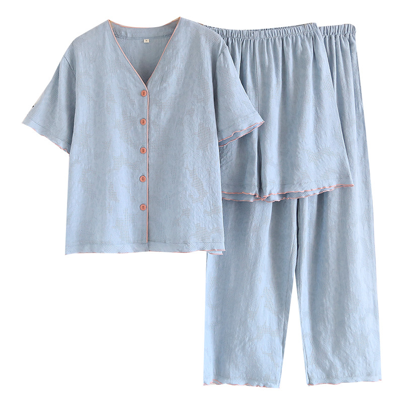 간단한 Azure Blue Pajamas 여성의 봄, 여름 및 가을 반팔 3 피스 퓨어 코튼 얇은 홈 의류 간단하고 편안한 외주스토어 가기