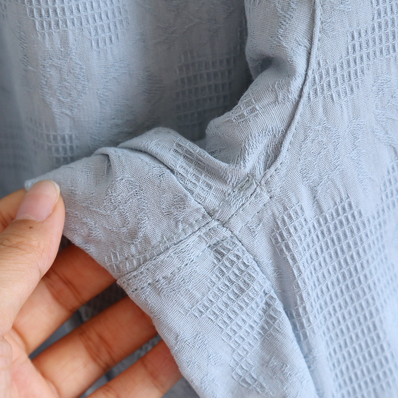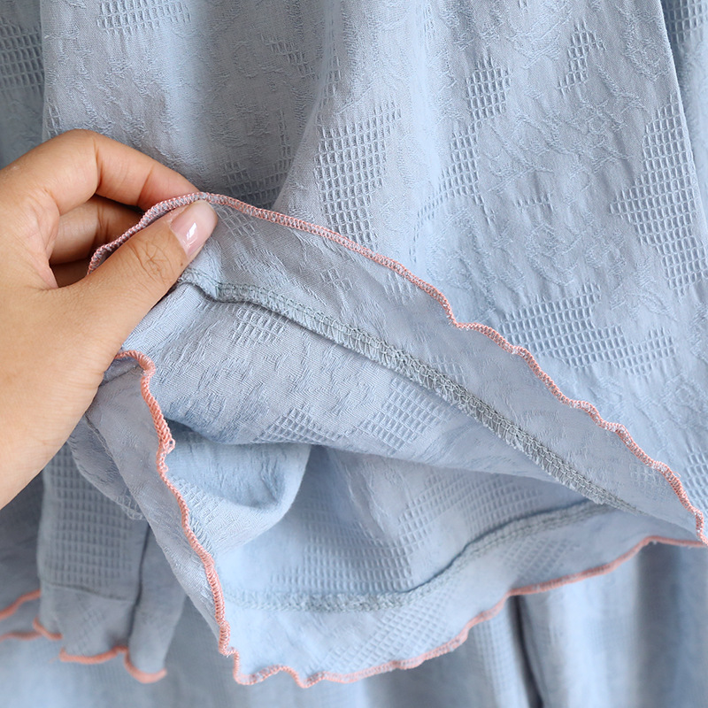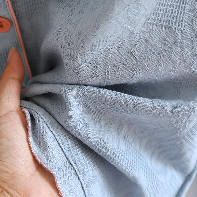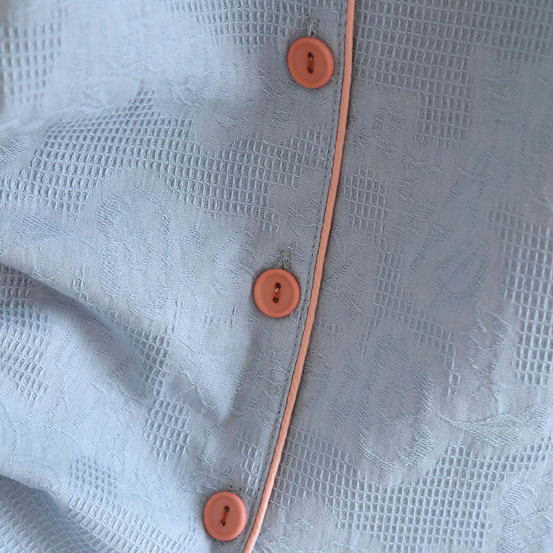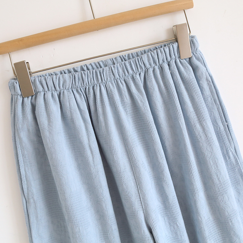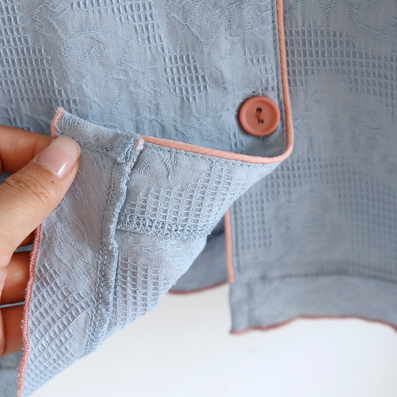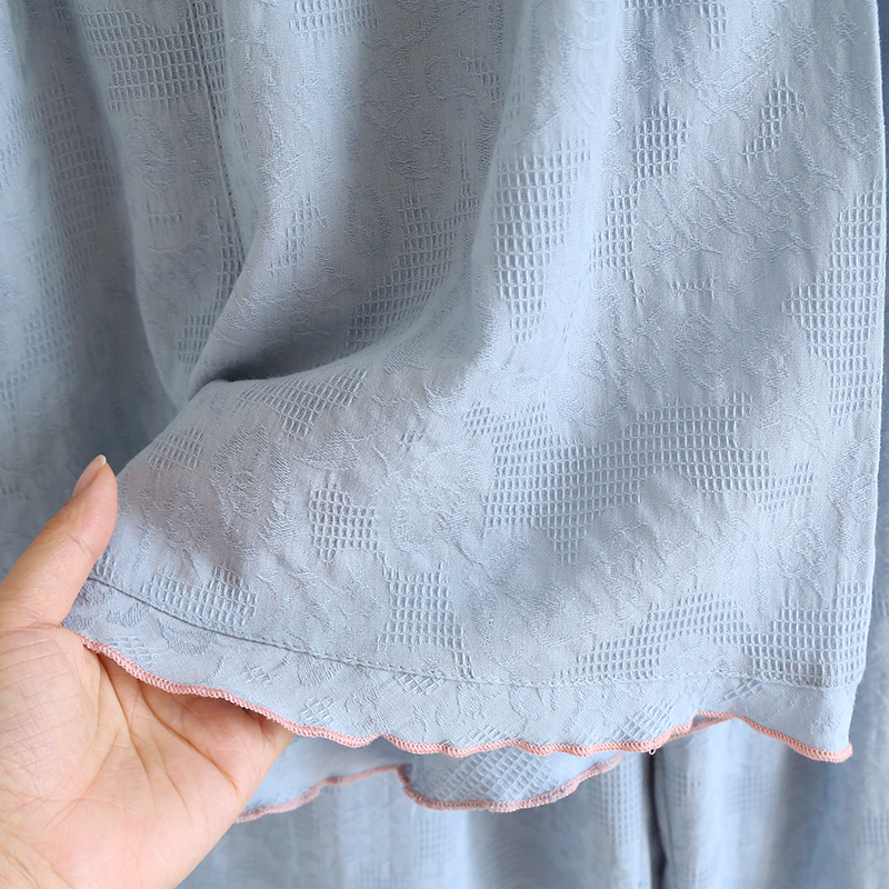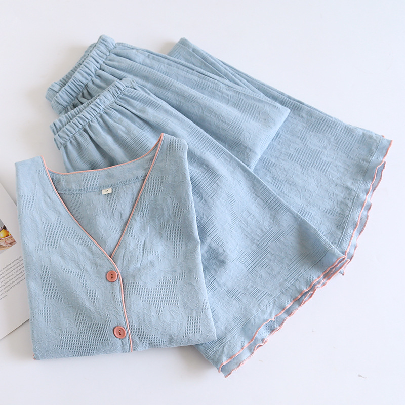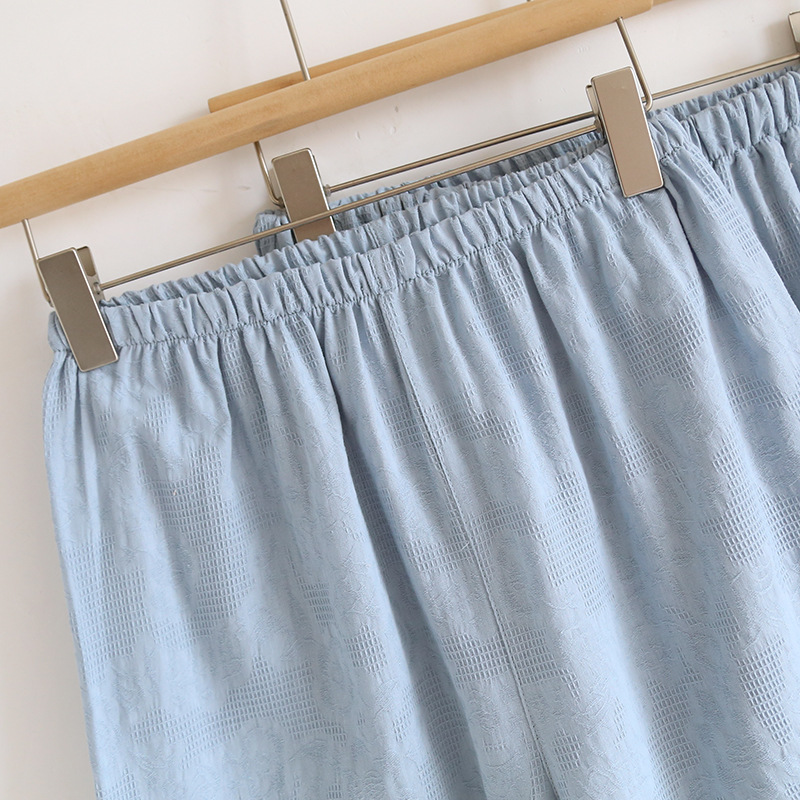 간단한 Azure Blue Pajamas 여성의 봄, 여름 및 가을 반팔 3 피스 퓨어 코튼 얇은 홈 의류 간단하고 편안한 외주스토어 가기