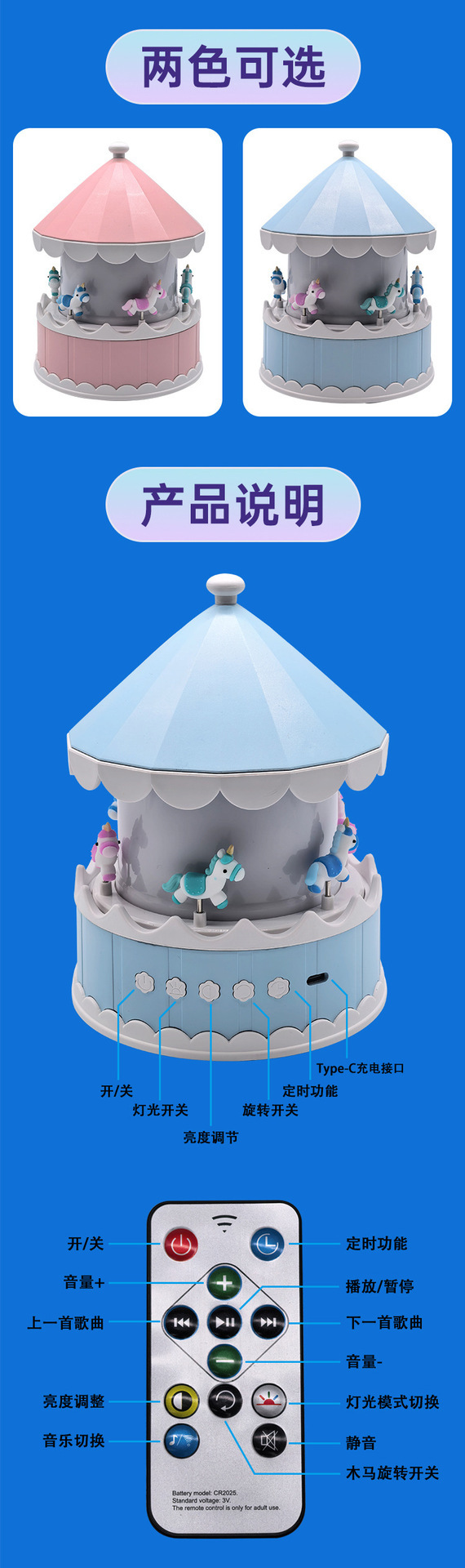 크로스보더 회전목마 프로젝션 램프 USB 음악 오르골 분위기 조명 어린이 별빛 램프 PVC 장난감 야간등