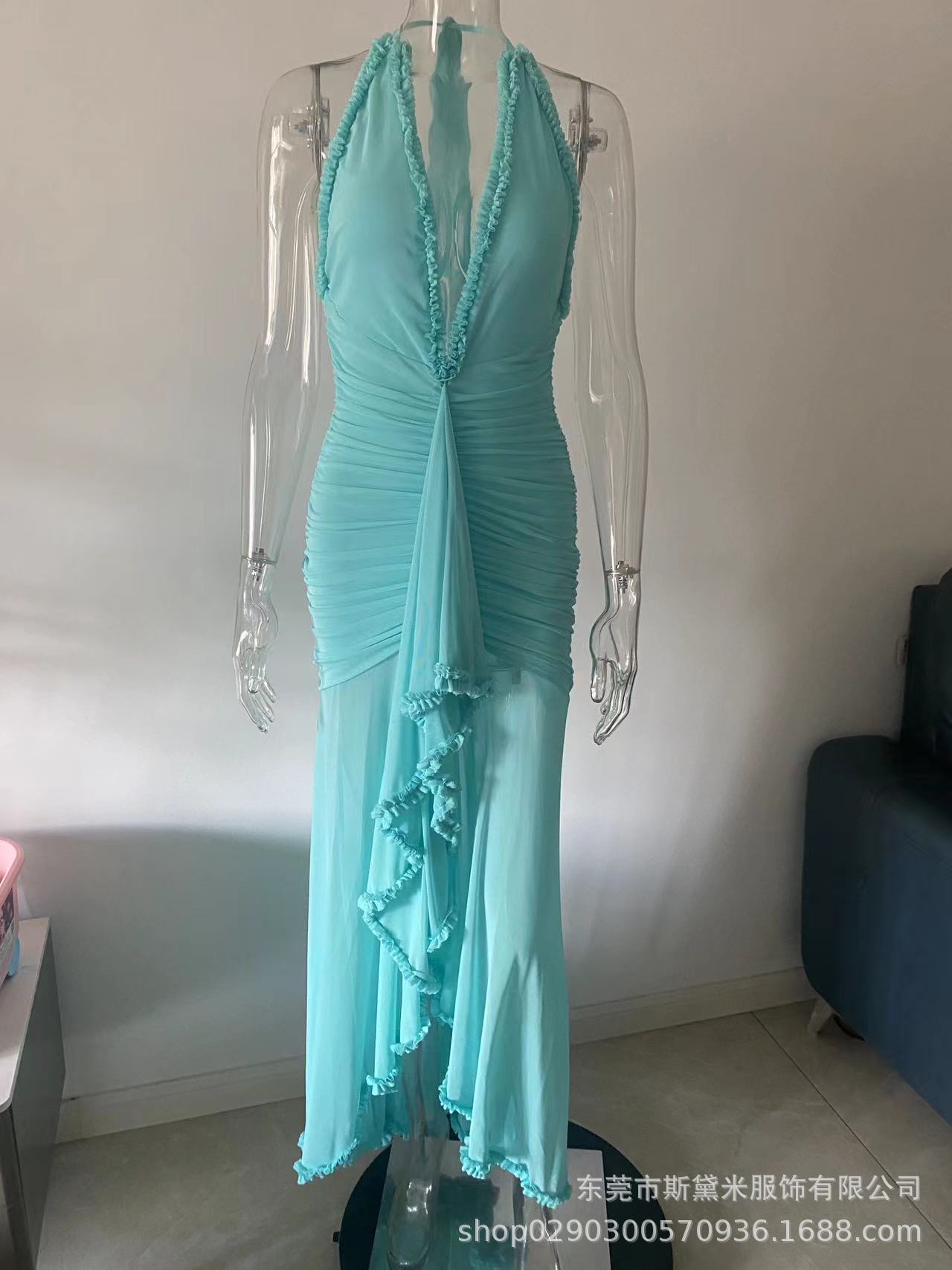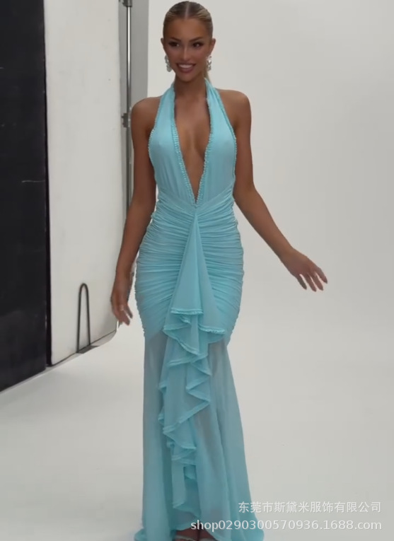 SDM163 우아한 버건디 레이스 테일 플랫 스트레이트 홀터넥 딥 V 섹시 드레스 휴가 이브닝 드레스 드레스