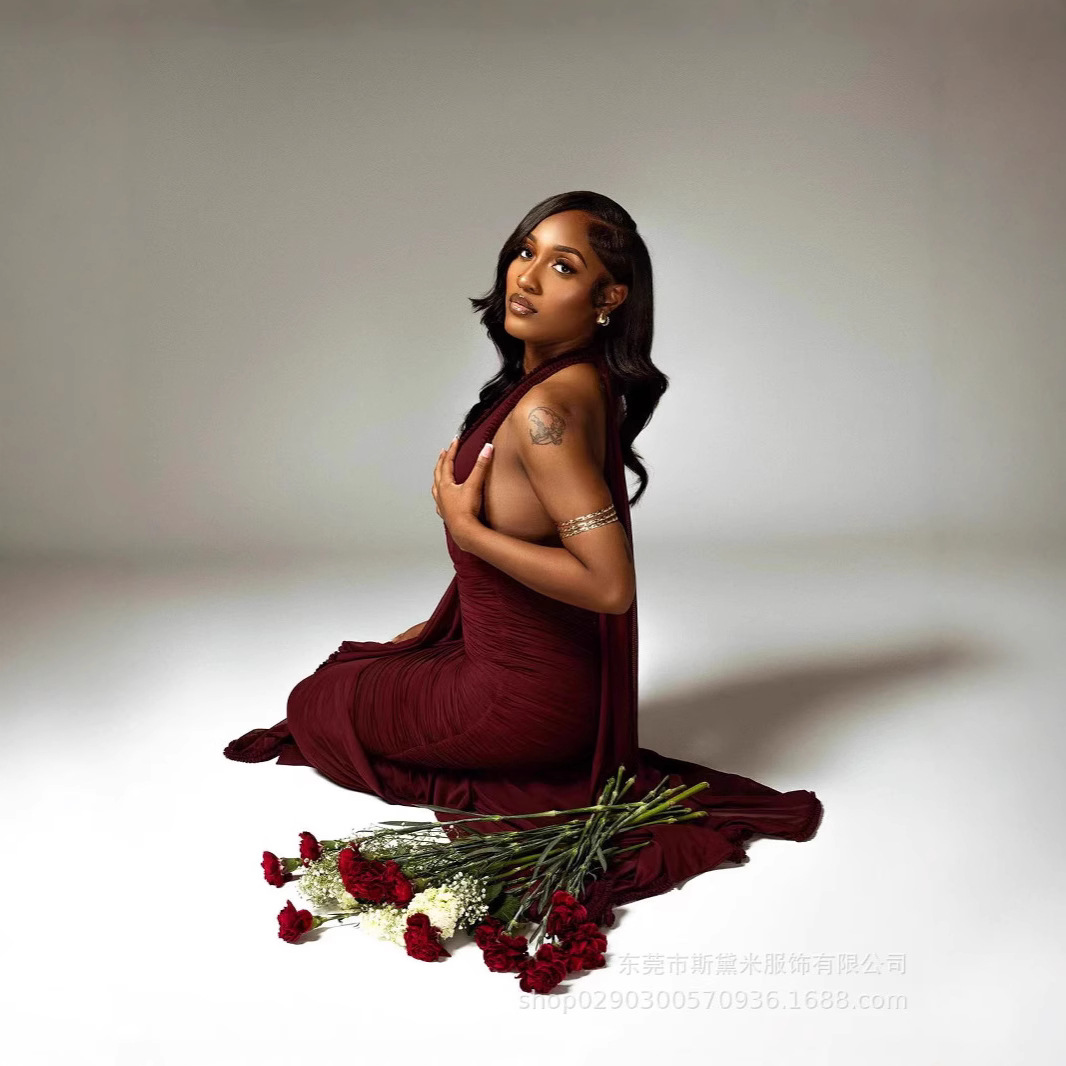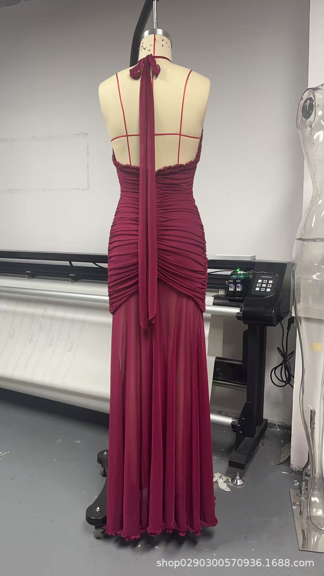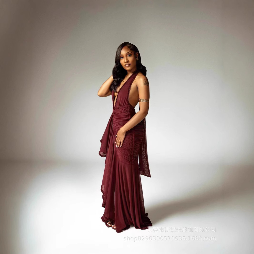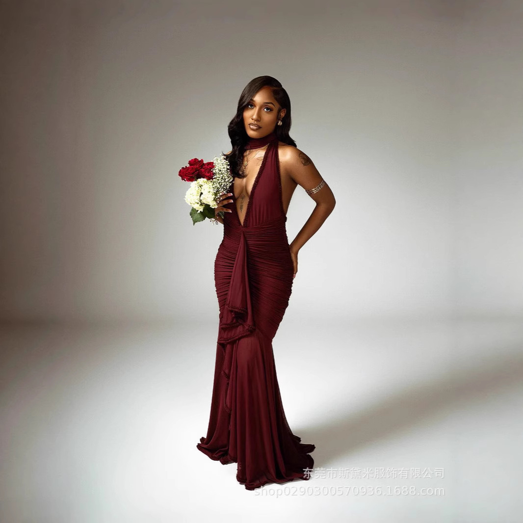 SDM163 우아한 버건디 레이스 테일 플랫 스트레이트 홀터넥 딥 V 섹시 드레스 휴가 이브닝 드레스 드레스스토어 가기